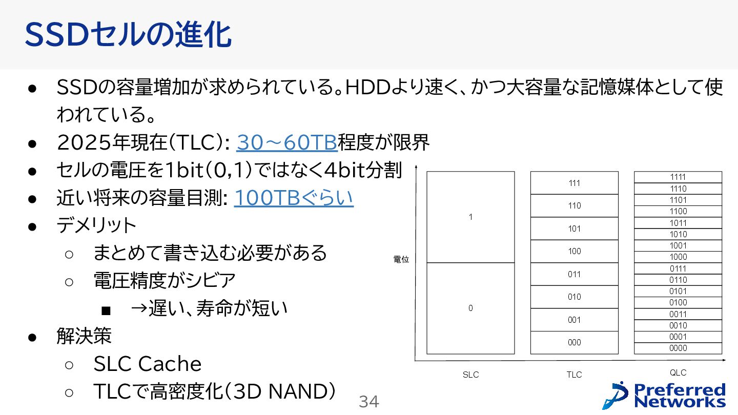 近い将来の容量目測: 100TBぐらい • デメリット ◦ まとめて書き込む必要がある ◦ 電圧精度がシビア ▪ →遅い、寿命が短い • 解決策 ◦ SLC Cache ◦ TLCで高密度化(3D NAND) SSDセルの進化 電位 1 0 111 110 101 100 011 010 001 000 1111 1110 1101 1100 1011 1010 1001 1000 0111 0110 0101 0100 0011 0010 0001 0000 SLC TLC QLC
