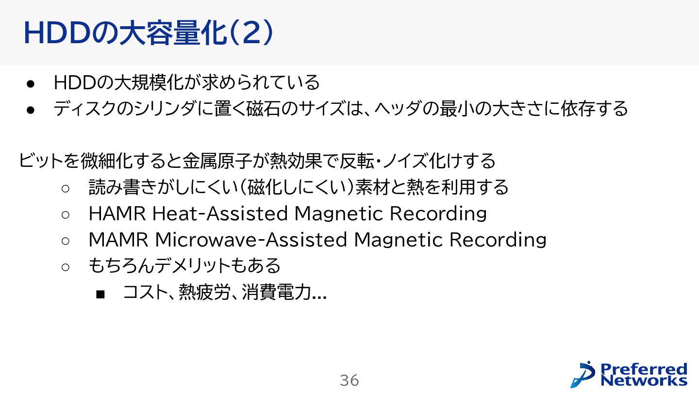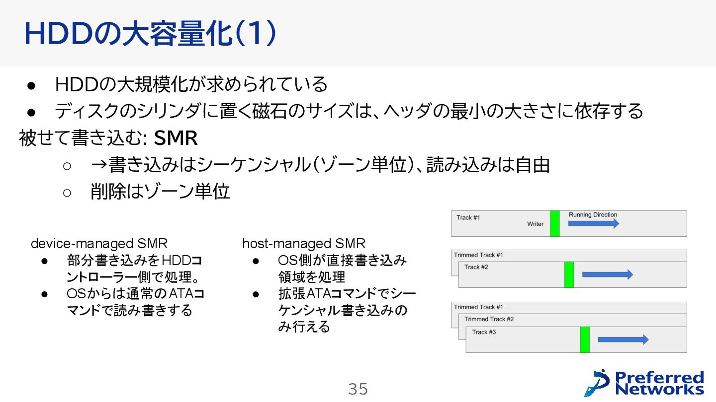 18. 35 • HDDの大規模化が求められている • ディスクのシリンダに置く磁石のサイズは、ヘッダの最小の大きさに依存する 被せて書き込む: SMR ◦ →書き込みはシーケンシャル(ゾーン単位)、読み込みは自由 ◦