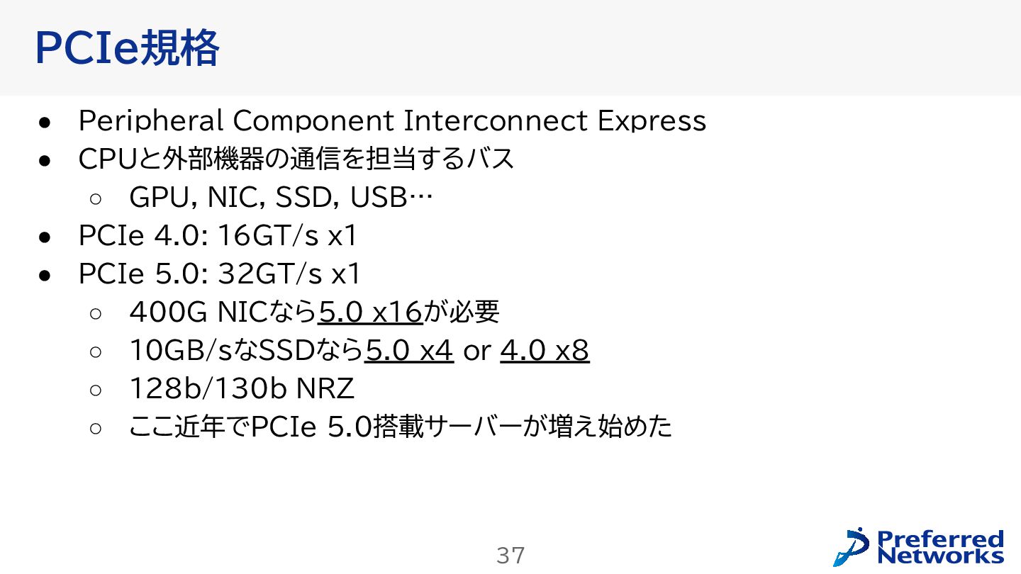 NIC, SSD, USB… • PCIe 4.0: 16GT/s x1 • PCIe 5.0: 32GT/s x1 ◦ 400G NICなら5.0 x16が必要 ◦ 10GB/sなSSDなら5.0 x4 or 4.0 x8 ◦ 128b/130b NRZ ◦ ここ近年でPCIe 5.0搭載サーバーが増え始めた PCIe規格