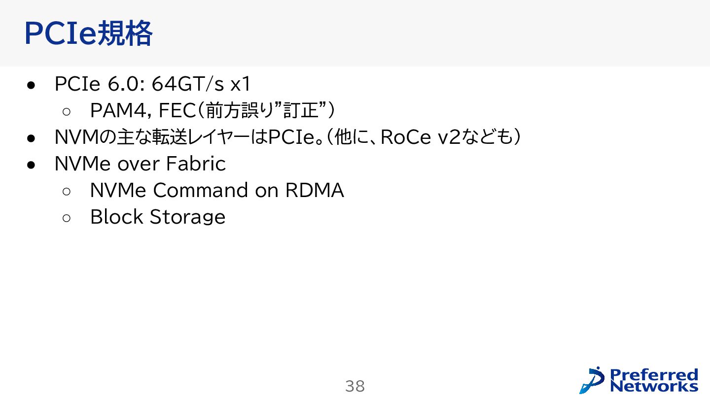 NVMの主な転送レイヤーはPCIe。(他に、RoCe v2なども) • NVMe over Fabric ◦ NVMe Command on RDMA ◦ Block Storage PCIe規格