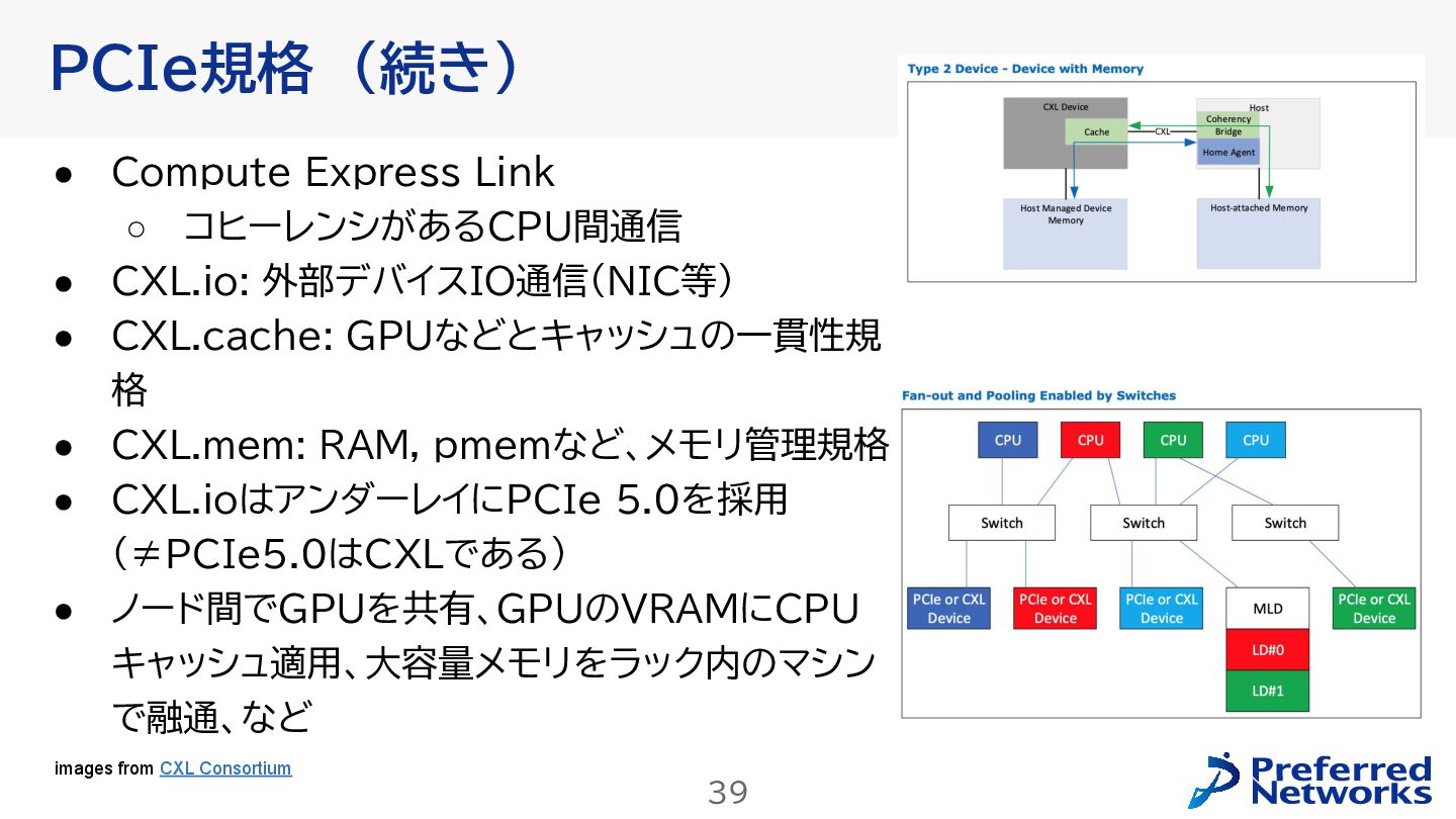 • CXL.cache: GPUなどとキャッシュの一貫性規 格 • CXL.mem: RAM, pmemなど、メモリ管理規格 • CXL.ioはアンダーレイにPCIe 5.0を採用 (≠PCIe5.0はCXLである) • ノード間でGPUを共有、GPUのVRAMにCPU キャッシュ適用、大容量メモリをラック内のマシン で融通、など PCIe規格 (続き) images from CXL Consortium
