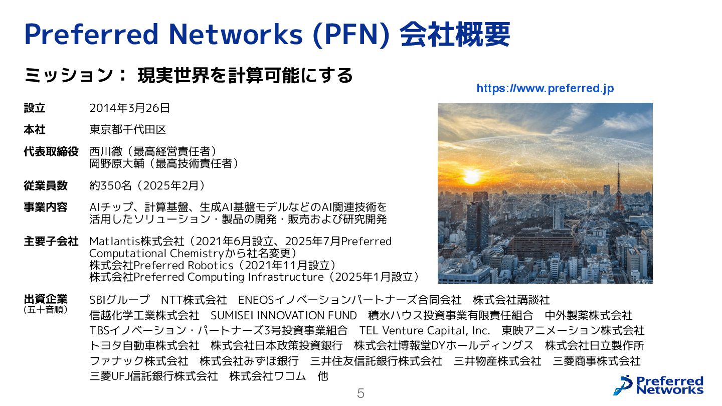 主要子会社 出資企業 (五十音順) 2014年3月26日 東京都千代田区 西川徹(最高経営責任者) 岡野原大輔(最高技術責任者) 約350名(2025年2月) AIチップ、計算基盤、生成AI基盤モデルなどのAI関連技術を 活用したソリューション・製品の開発・販売および研究開発 Matlantis株式会社(2021年6月設立、2025年7月Preferred Computational Chemistryから社名変更) 株式会社Preferred Robotics(2021年11月設立) 株式会社Preferred Computing Infrastructure(2025年1月設立) SBIグループ NTT株式会社 ENEOSイノベーションパートナーズ合同会社 株式会社講談社 信越化学工業株式会社 SUMISEI INNOVATION FUND 積水ハウス投資事業有限責任組合 中外製薬株式会社 TBSイノベーション・パートナーズ3号投資事業組合 TEL Venture Capital, Inc. 東映アニメーション株式会社 トヨタ自動車株式会社 株式会社日本政策投資銀行 株式会社博報堂DYホールディングス 株式会社日立製作所 ファナック株式会社 株式会社みずほ銀行 三井住友信託銀行株式会社 三井物産株式会社 三菱商事株式会社 三菱UFJ信託銀行株式会社 株式会社ワコム 他 ミッション: 現実世界を計算可能にする https://www.preferred.jp