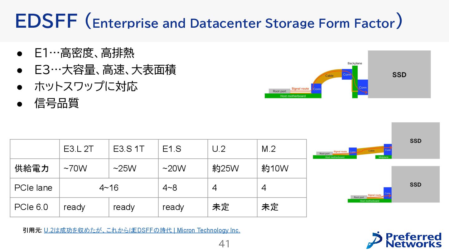 (Enterprise and Datacenter Storage Form Factor) E3.L 2T E3.S 1T E1.S U.2 M.2 供給電力 ~70W ~25W ~20W 約25W 約10W PCIe lane 4~16 4~8 4 4 PCIe 6.0 ready ready ready 未定 未定 引用元: U.2は成功を収めたが、これからは EDSFFの時代 | Micron Technology Inc.