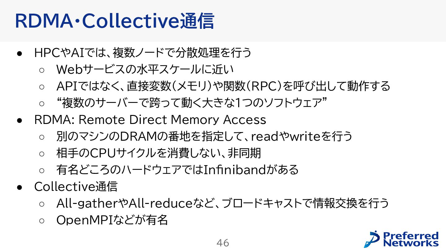 RDMA: Remote Direct Memory Access ◦ 別のマシンのDRAMの番地を指定して、readやwriteを行う ◦ 相手のCPUサイクルを消費しない、非同期 ◦ 有名どころのハードウェアではInfinibandがある • Collective通信 ◦ All-gatherやAll-reduceなど、ブロードキャストで情報交換を行う ◦ OpenMPIなどが有名 RDMA・Collective通信
