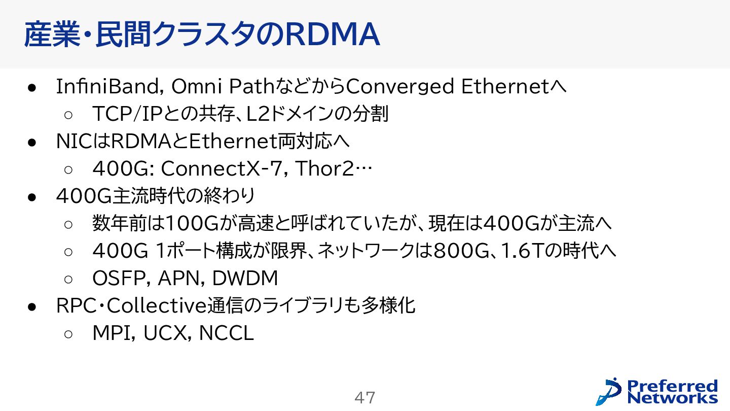 ◦ 400G: ConnectX-7, Thor2… • 400G主流時代の終わり ◦ 数年前は100Gが高速と呼ばれていたが、現在は400Gが主流へ ◦ 400G 1ポート構成が限界、ネットワークは800G、1.6Tの時代へ ◦ OSFP, APN, DWDM • RPC・Collective通信のライブラリも多様化 ◦ MPI, UCX, NCCL 産業・民間クラスタのRDMA