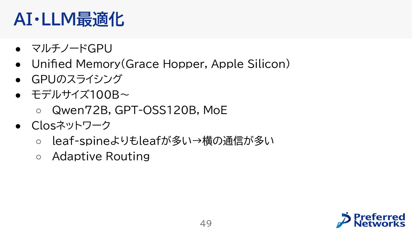 GPUのスライシング • モデルサイズ100B〜 ◦ Qwen72B, GPT-OSS120B, MoE • Closネットワーク ◦ leaf-spineよりもleafが多い→横の通信が多い ◦ Adaptive Routing AI・LLM最適化