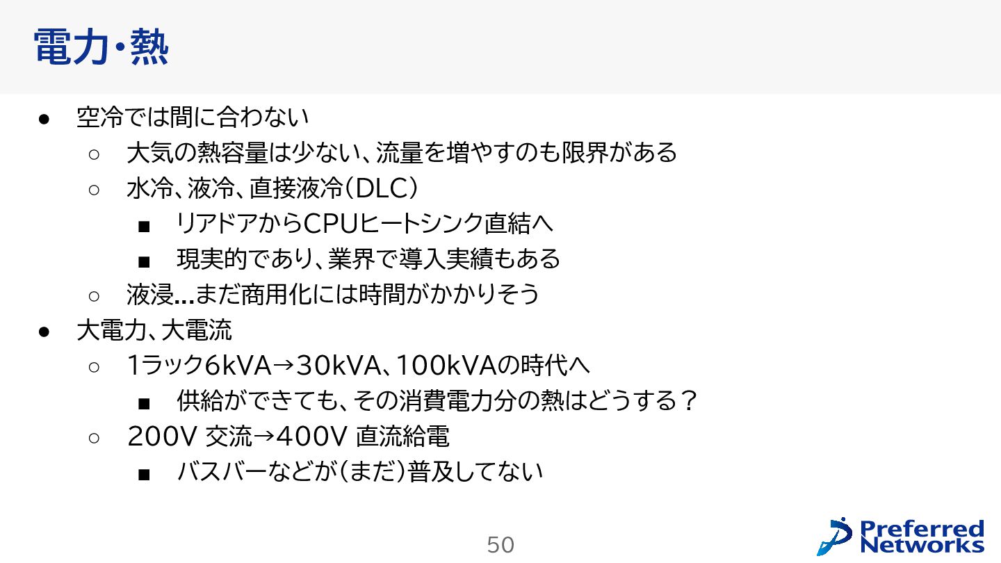30. 50 • 空冷では間に合わない ◦ 大気の熱容量は少ない、流量を増やすのも限界がある ◦ 水冷、液冷、直接液冷(DLC) ▪ リアドアからCPUヒートシンク直結へ ▪