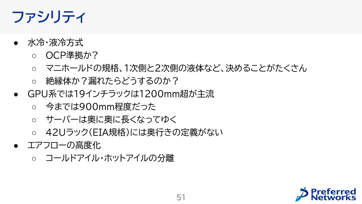 GPU系では19インチラックは1200mm超が主流 ◦ 今までは900mm程度だった ◦ サーバーは奥に奥に長くなってゆく ◦ 42Uラック(EIA規格)には奥行きの定義がない • エアフローの高度化 ◦ コールドアイル・ホットアイルの分離 ファシリティ