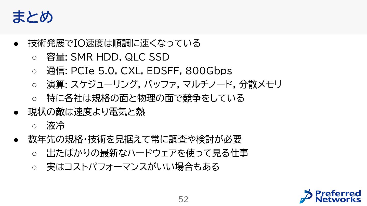 通信: PCIe 5.0, CXL, EDSFF, 800Gbps ◦ 演算: スケジューリング, バッファ, マルチノード, 分散メモリ ◦ 特に各社は規格の面と物理の面で競争をしている • 現状の敵は速度より電気と熱 ◦ 液冷 • 数年先の規格・技術を見据えて常に調査や検討が必要 ◦ 出たばかりの最新なハードウェアを使って見る仕事 ◦ 実はコストパフォーマンスがいい場合もある まとめ