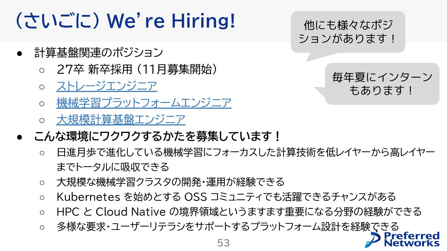 機械学習プラットフォームエンジニア ◦ 大規模計算基盤エンジニア • こんな環境にワクワクするかたを募集しています! ◦ 日進月歩で進化している機械学習にフォーカスした計算技術を低レイヤーから高レイヤー までトータルに吸収できる ◦ 大規模な機械学習クラスタの開発・運用が経験できる ◦ Kubernetes を始めとする OSS コミュニティでも活躍できるチャンスがある ◦ HPC と Cloud Native の境界領域というますます重要になる分野の経験ができる ◦ 多様な要求・ユーザーリテラシをサポートするプラットフォーム設計を経験できる (さいごに) We’re Hiring! 他にも様々なポジ ションがあります! 毎年夏にインターン もあります!