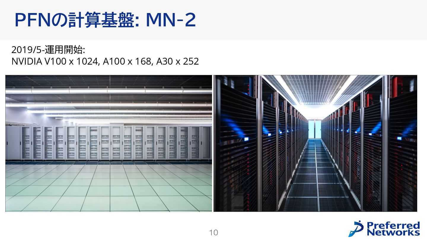(A30) 42 nodes (252 GPUs) A30 (24 G) PCIe x 6 100 GbE x 2 RoCEv2 with SR-IOV MN-2b (A100) 42 nodes (168 GPUs) A100 (80 G) SXM4 x 4 100 GbE x 2 RoCEv2 with SR-IOV MN-2a 128 nodes (1024 GPUs) V100 (16 / 32 G) SXM2 x 8 100 GbE x 4 RoCEv2 with SR-IOV MN-3 48 nodes (192 MN-Cores) MN-Core x 4 100 GbE x 2 MN-Core DirectConnect 80 CPU Cores 128 CPU Cores 48 CPU Cores 36 CPU Cores DDR4 384 GB DDR4 384 GB DDR4 1024 GB DDR4 512 GB