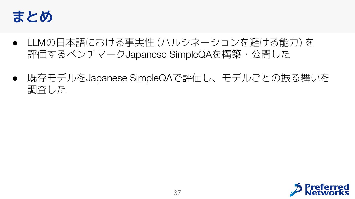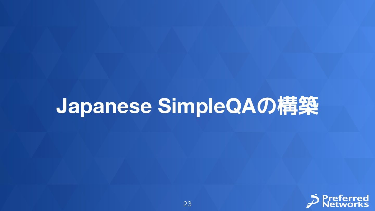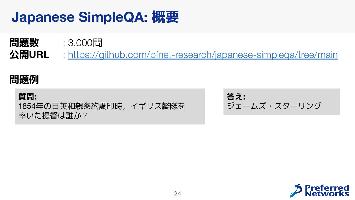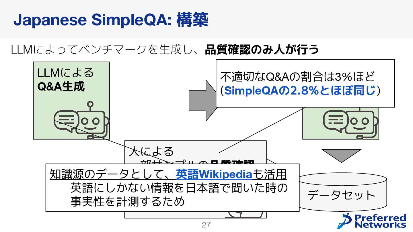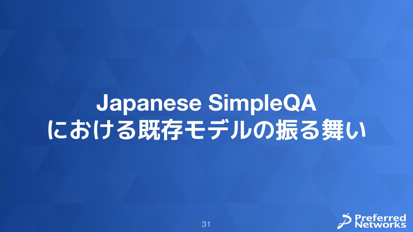 本報告では,大規模言語モデル(LLM)の日本語における事実に基づく回答能力(事実性)を評価するベンチマーク「Japanese SimpleQA」の構築と既存モデルの振る舞いについて述べる.Japanese SimpleQAは,短文で特定の事実について問う3000問の日本語質問応答からなるベンチマークである.SimpleQAと同様に,(1)最新のLLMにとっても高難度であり,(2)時間経過による正答の変化がなく,(3)別解が存在しない,質問応答で構成されている.この設計により,「モデルが自己の知識をどの程度正確に認識しているか」を評価できる.Japanese SimpleQAを用い,既存LLMの事実性や,RAGによる事実性の向上効果を明らかにした.構築したベンチマークは https://github.com/pfnet-research/japanese-simpleqa/ で公開している.