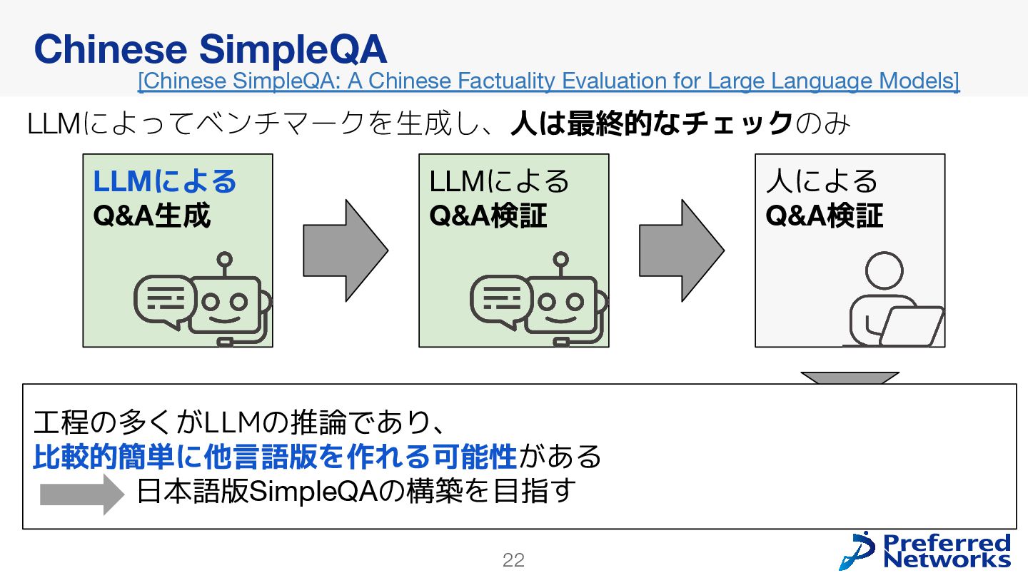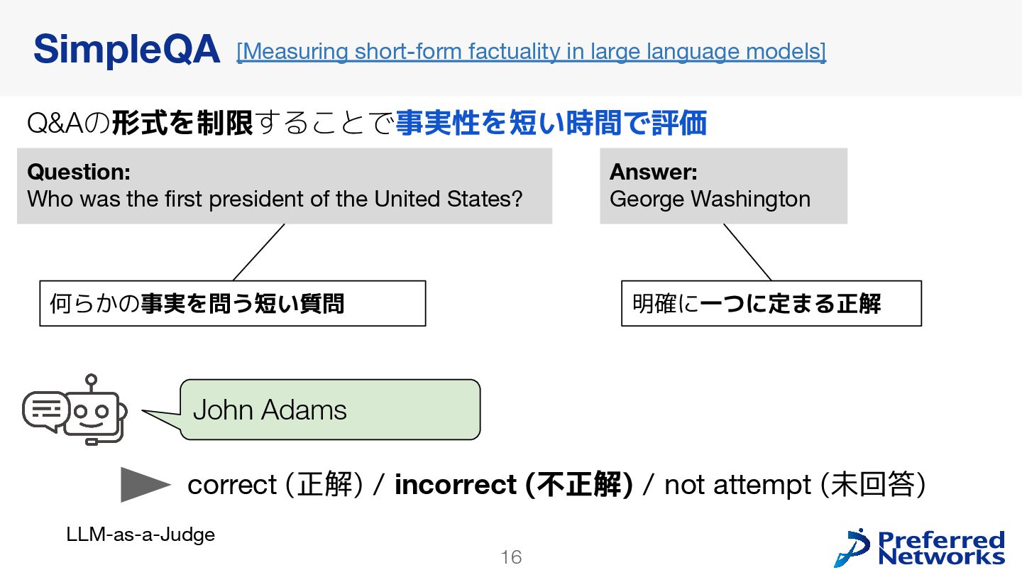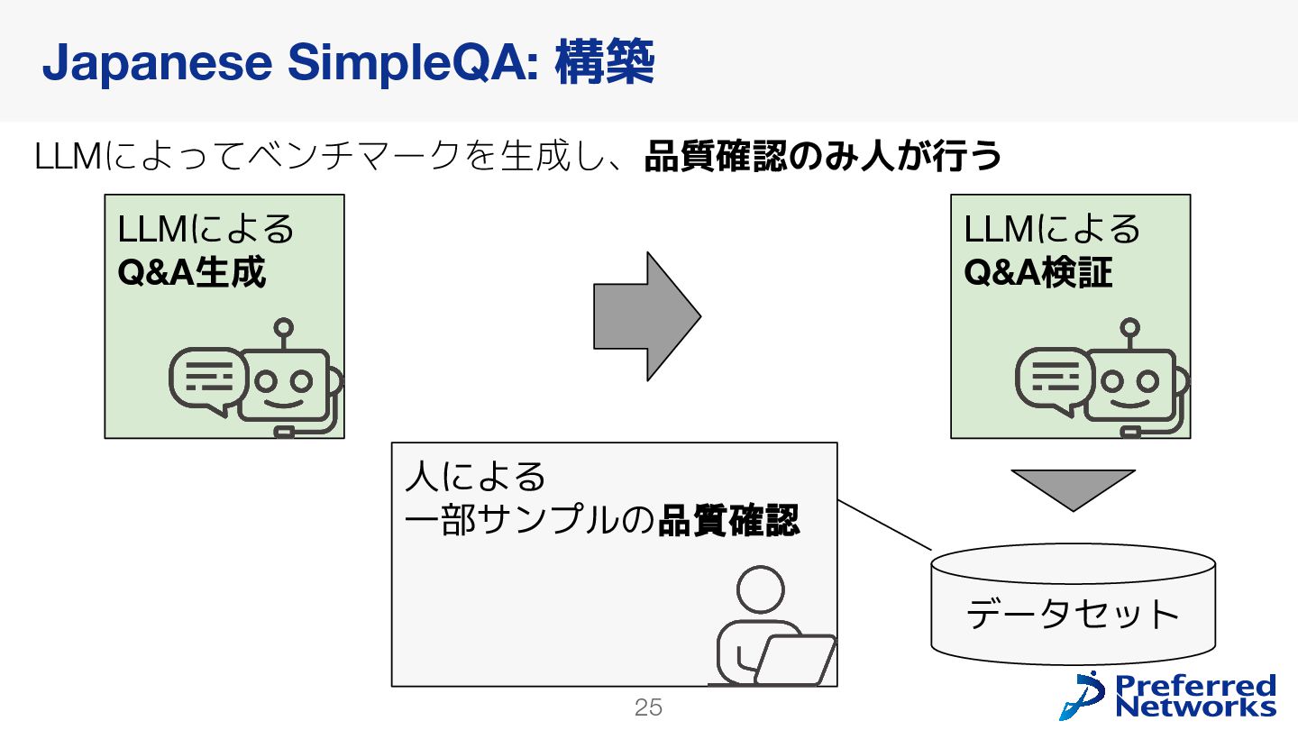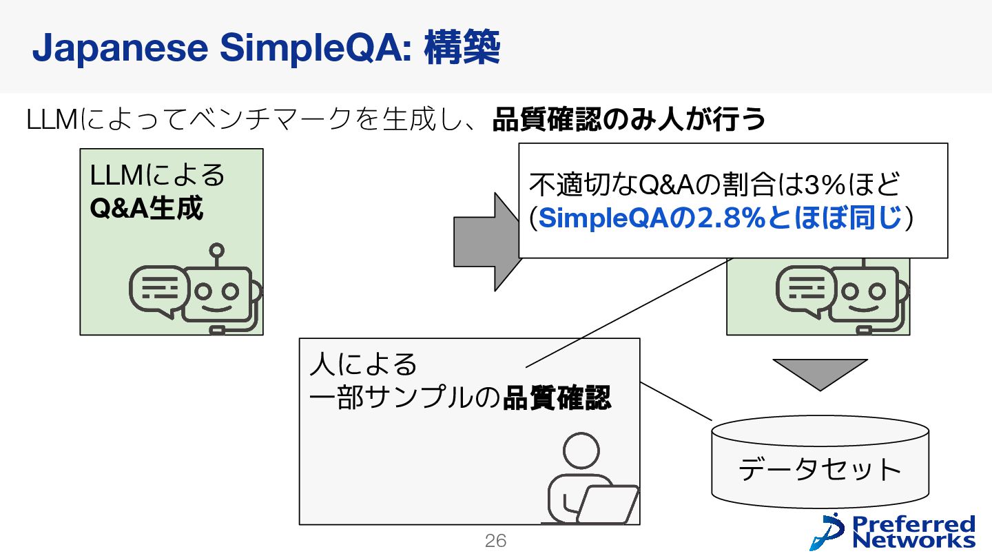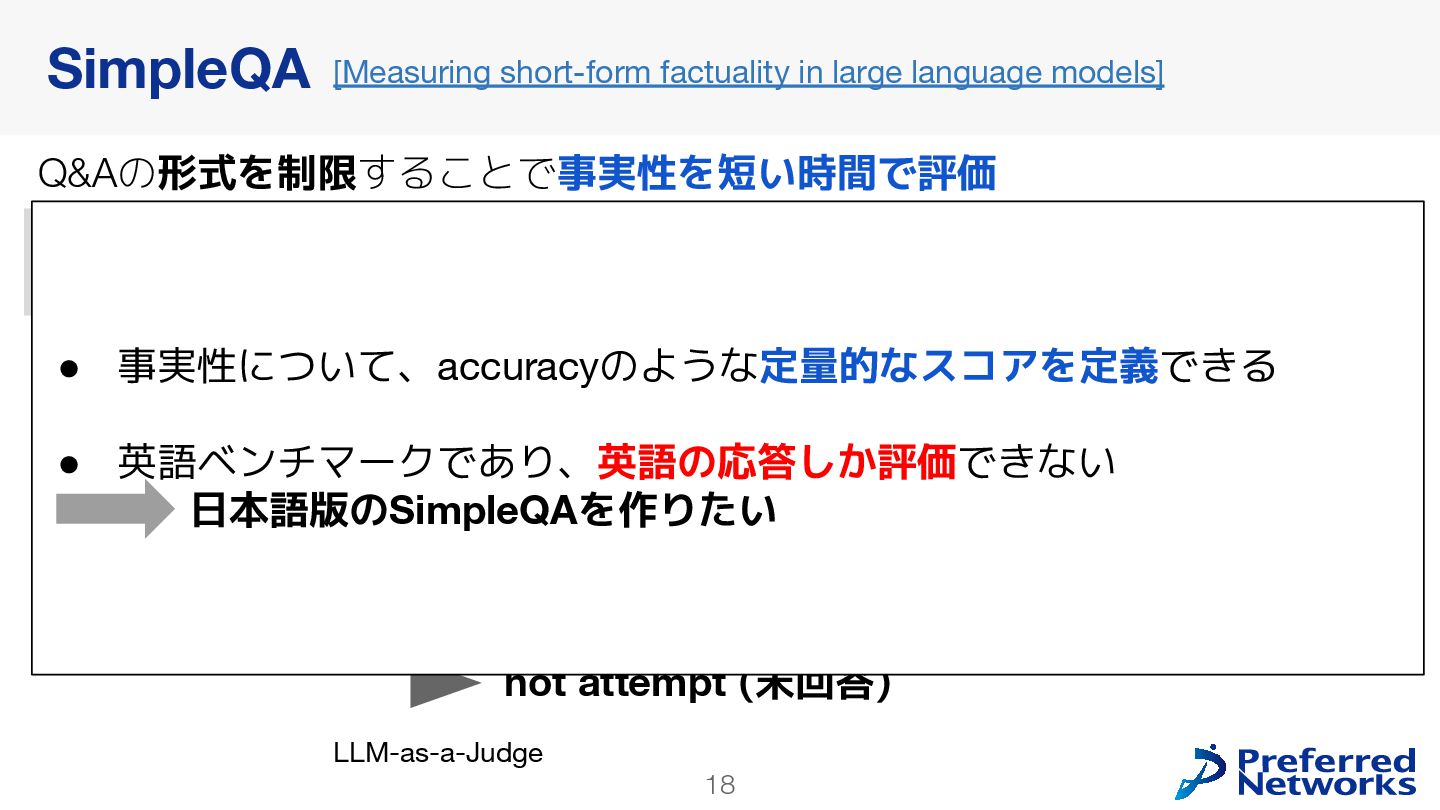 本報告では,大規模言語モデル(LLM)の日本語における事実に基づく回答能力(事実性)を評価するベンチマーク「Japanese SimpleQA」の構築と既存モデルの振る舞いについて述べる.Japanese SimpleQAは,短文で特定の事実について問う3000問の日本語質問応答からなるベンチマークである.SimpleQAと同様に,(1)最新のLLMにとっても高難度であり,(2)時間経過による正答の変化がなく,(3)別解が存在しない,質問応答で構成されている.この設計により,「モデルが自己の知識をどの程度正確に認識しているか」を評価できる.Japanese SimpleQAを用い,既存LLMの事実性や,RAGによる事実性の向上効果を明らかにした.構築したベンチマークは https://github.com/pfnet-research/japanese-simpleqa/ で公開している.