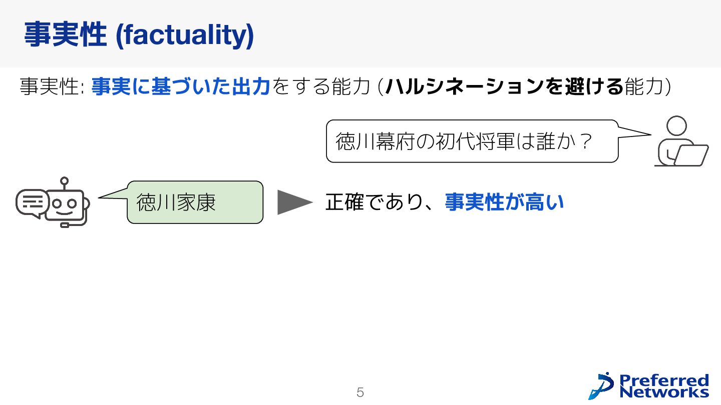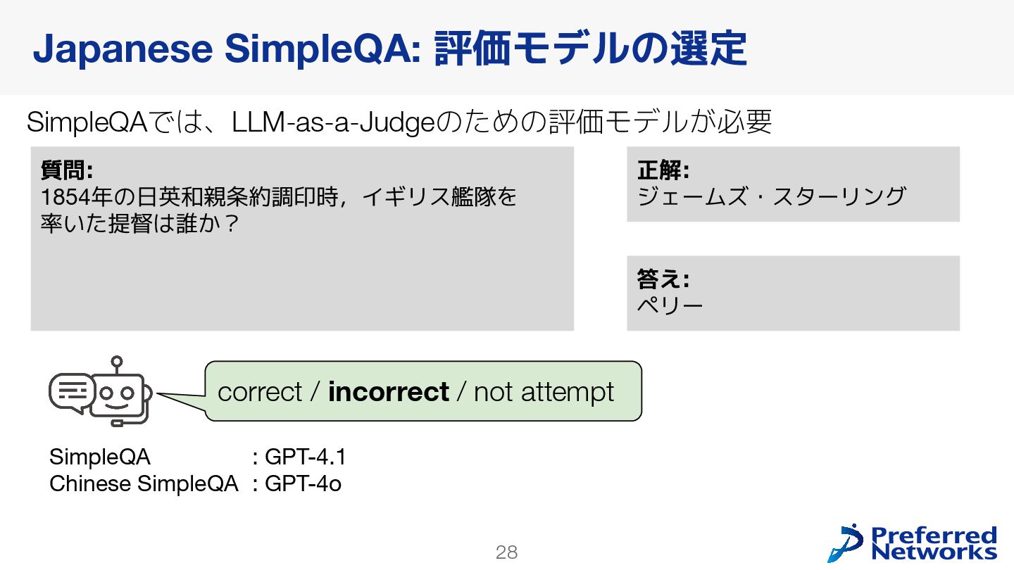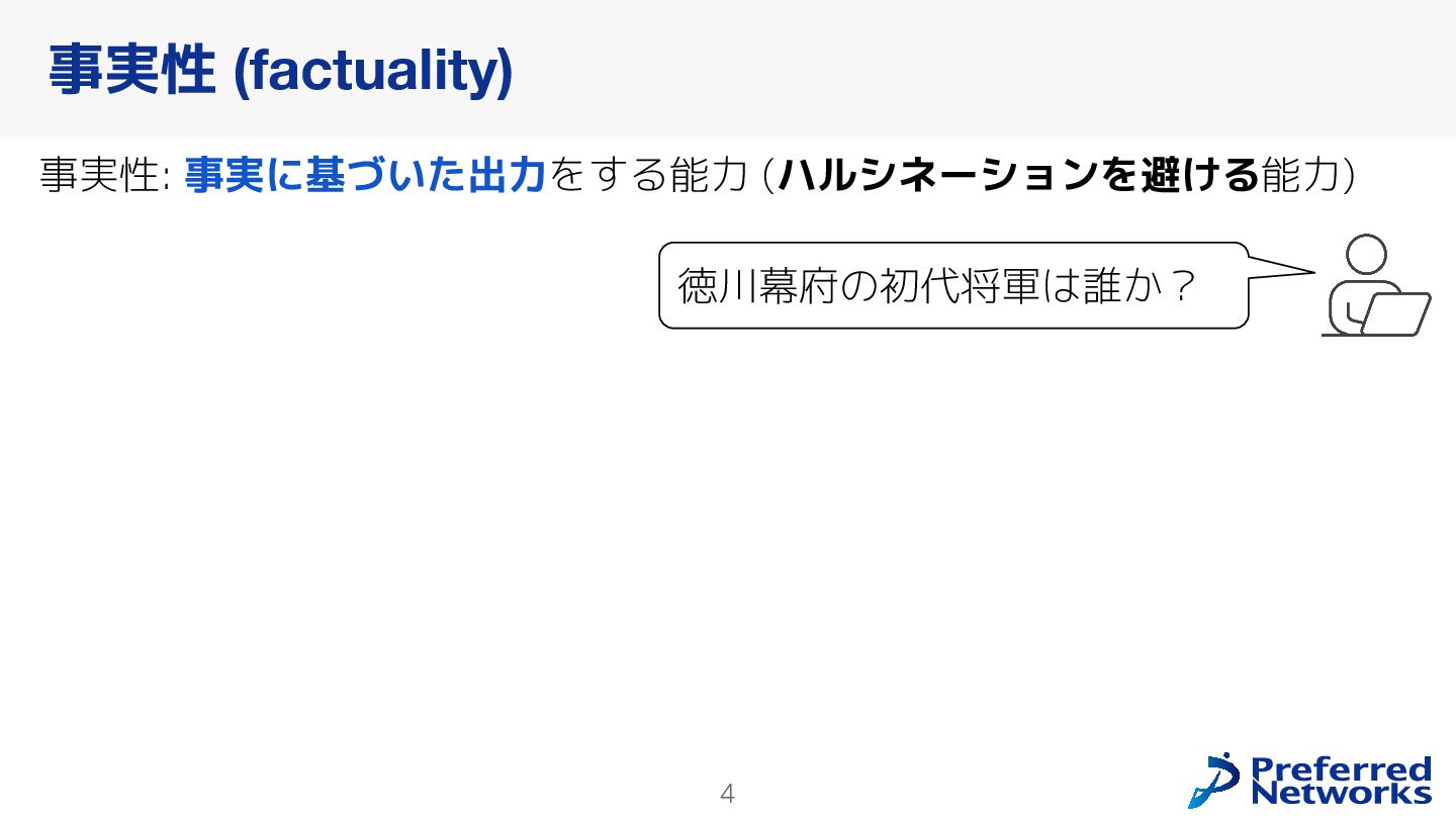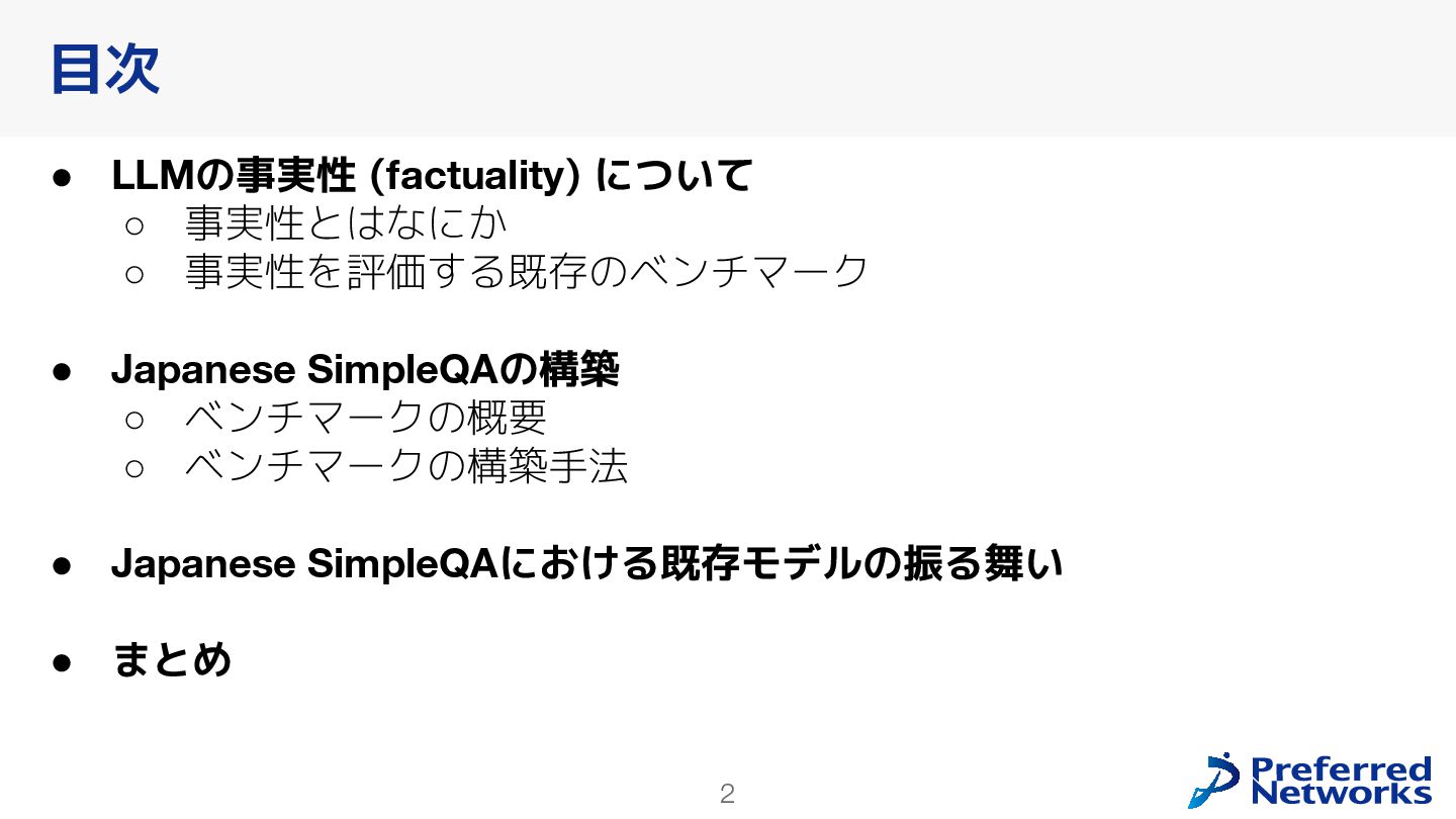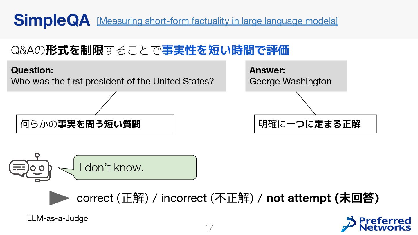 本報告では,大規模言語モデル(LLM)の日本語における事実に基づく回答能力(事実性)を評価するベンチマーク「Japanese SimpleQA」の構築と既存モデルの振る舞いについて述べる.Japanese SimpleQAは,短文で特定の事実について問う3000問の日本語質問応答からなるベンチマークである.SimpleQAと同様に,(1)最新のLLMにとっても高難度であり,(2)時間経過による正答の変化がなく,(3)別解が存在しない,質問応答で構成されている.この設計により,「モデルが自己の知識をどの程度正確に認識しているか」を評価できる.Japanese SimpleQAを用い,既存LLMの事実性や,RAGによる事実性の向上効果を明らかにした.構築したベンチマークは https://github.com/pfnet-research/japanese-simpleqa/ で公開している.