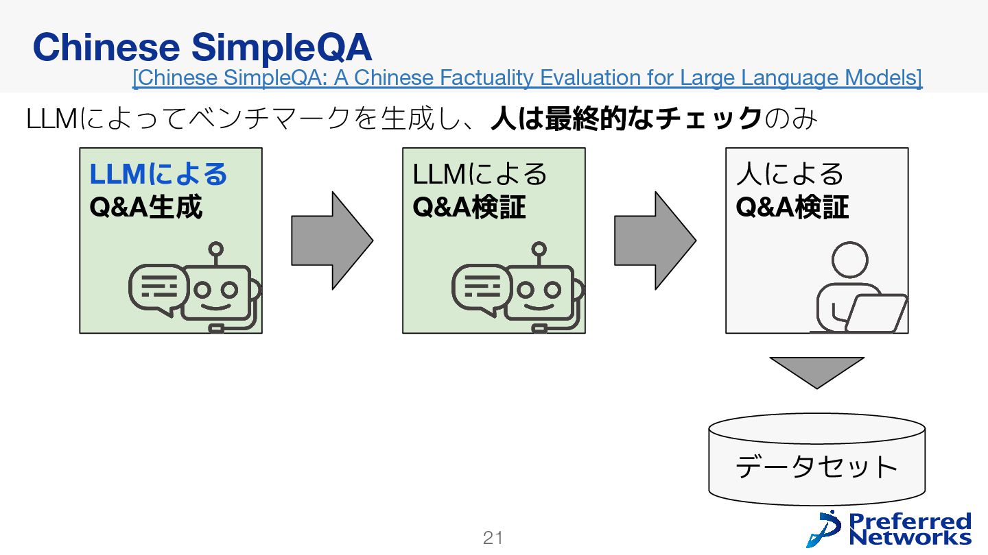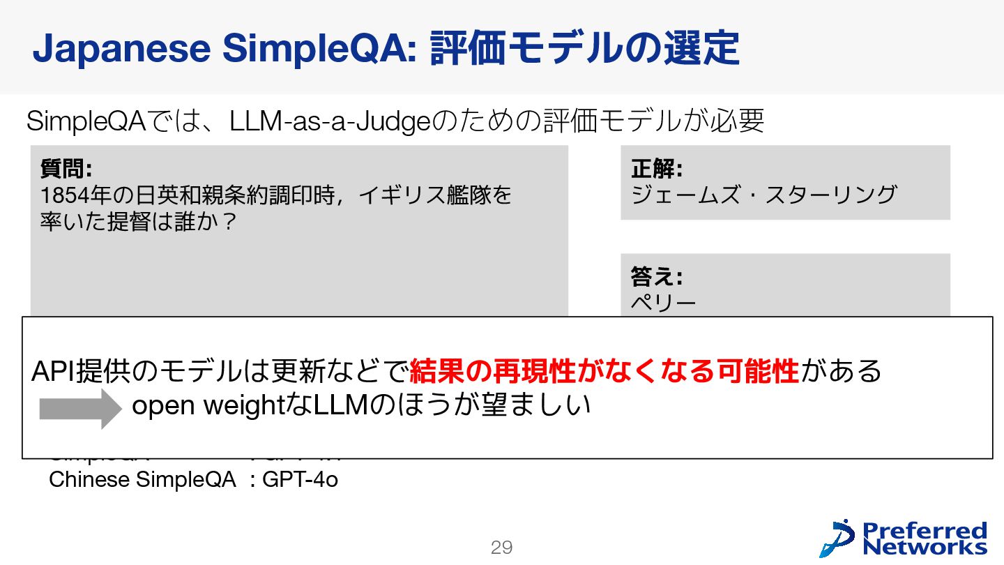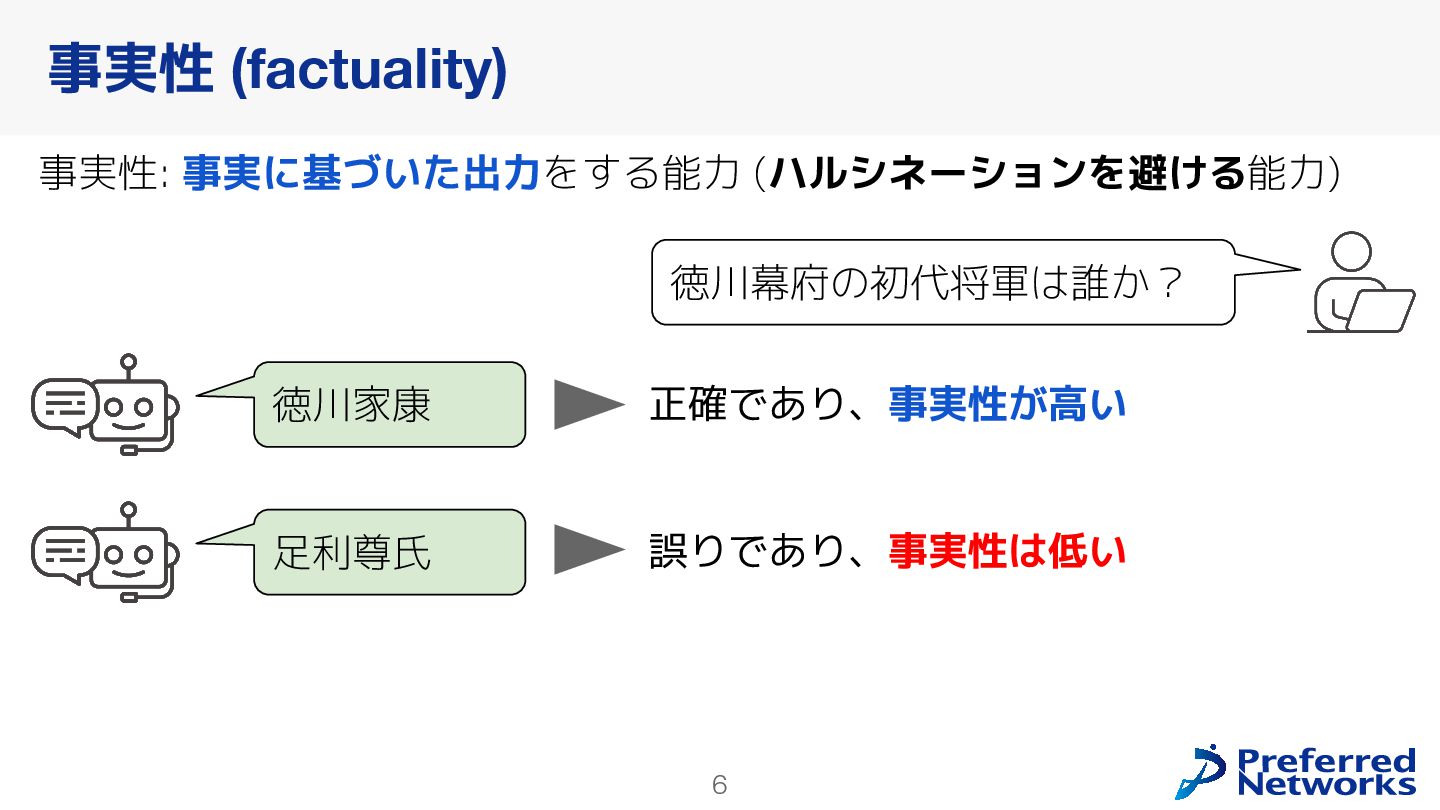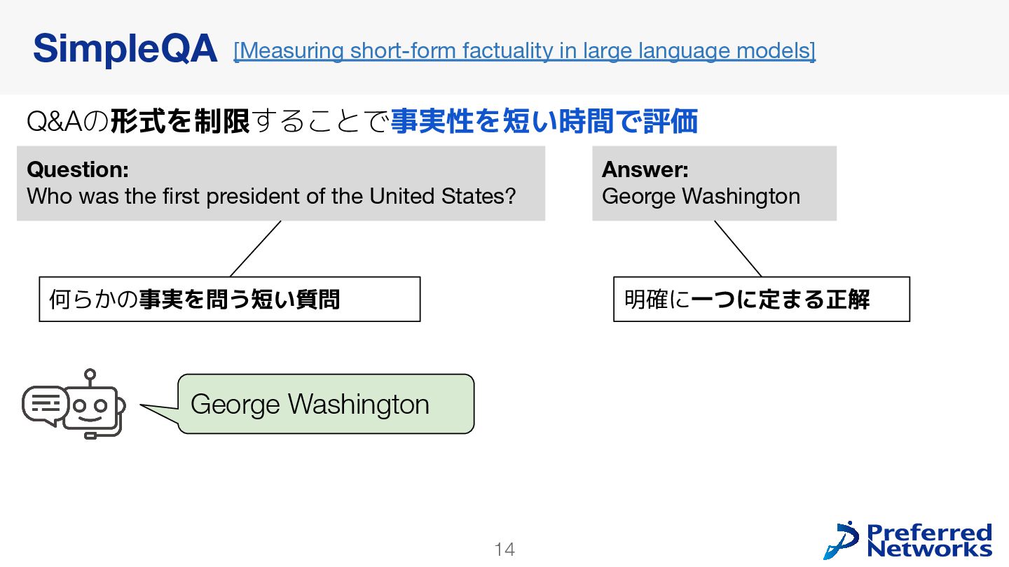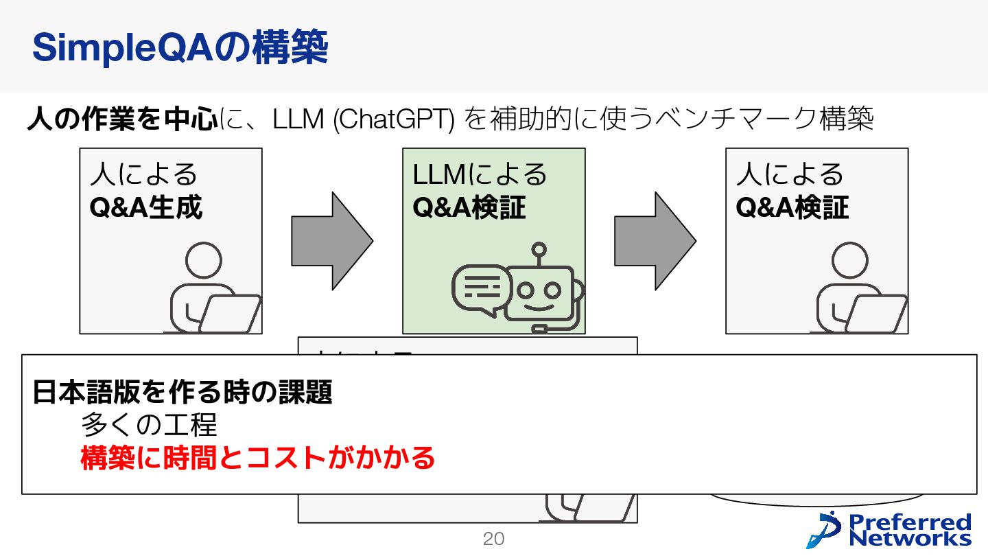 本報告では,大規模言語モデル(LLM)の日本語における事実に基づく回答能力(事実性)を評価するベンチマーク「Japanese SimpleQA」の構築と既存モデルの振る舞いについて述べる.Japanese SimpleQAは,短文で特定の事実について問う3000問の日本語質問応答からなるベンチマークである.SimpleQAと同様に,(1)最新のLLMにとっても高難度であり,(2)時間経過による正答の変化がなく,(3)別解が存在しない,質問応答で構成されている.この設計により,「モデルが自己の知識をどの程度正確に認識しているか」を評価できる.Japanese SimpleQAを用い,既存LLMの事実性や,RAGによる事実性の向上効果を明らかにした.構築したベンチマークは https://github.com/pfnet-research/japanese-simpleqa/ で公開している.