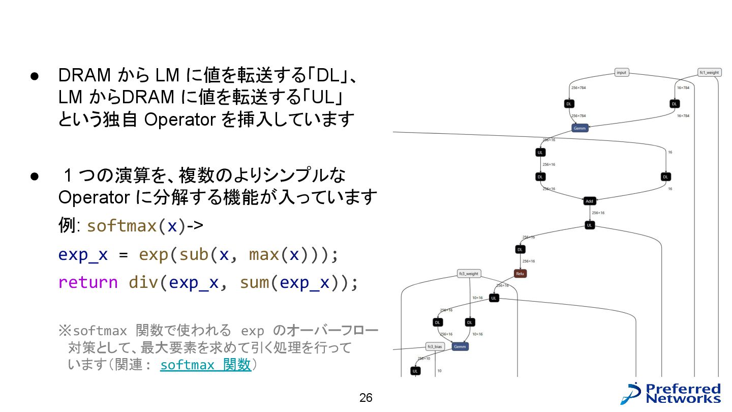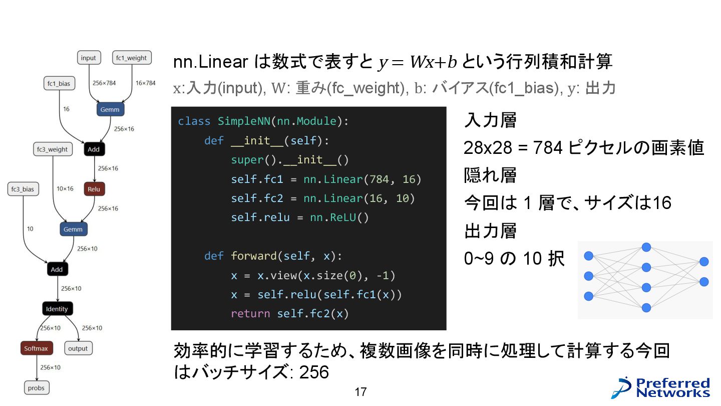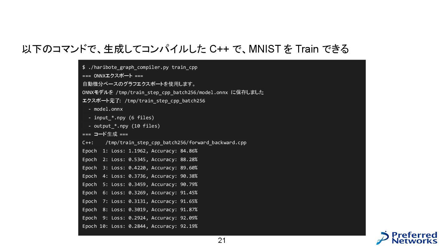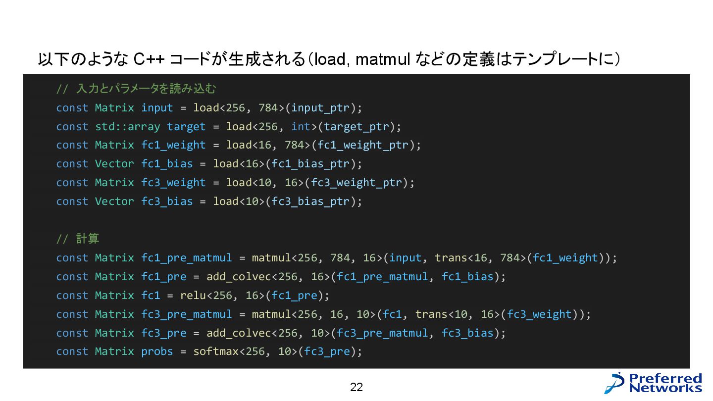 = load<256, 784>(input_ptr); const std::array target = load<256, int>(target_ptr); const Matrix fc1_weight = load<16, 784>(fc1_weight_ptr); const Vector fc1_bias = load<16>(fc1_bias_ptr); const Matrix fc3_weight = load<10, 16>(fc3_weight_ptr); const Vector fc3_bias = load<10>(fc3_bias_ptr); // 計算 const Matrix fc1_pre_matmul = matmul<256, 784, 16>(input, trans<16, 784>(fc1_weight)); const Matrix fc1_pre = add_colvec<256, 16>(fc1_pre_matmul, fc1_bias); const Matrix fc1 = relu<256, 16>(fc1_pre); const Matrix fc3_pre_matmul = matmul<256, 16, 10>(fc1, trans<10, 16>(fc3_weight)); const Matrix fc3_pre = add_colvec<256, 10>(fc3_pre_matmul, fc3_bias); const Matrix probs = softmax<256, 10>(fc3_pre); 以下のような C++ コードが生成される(load, matmul などの定義はテンプレートに)