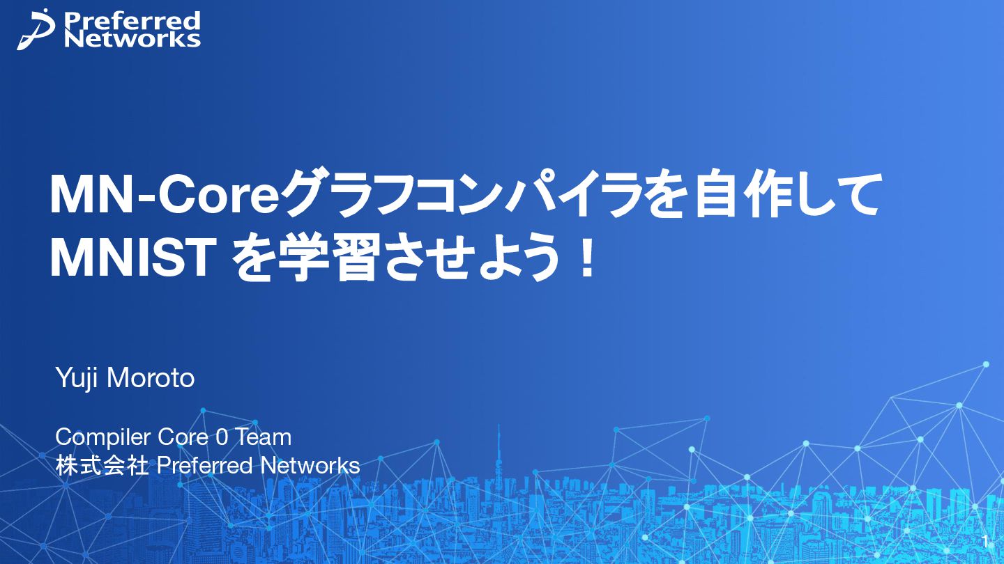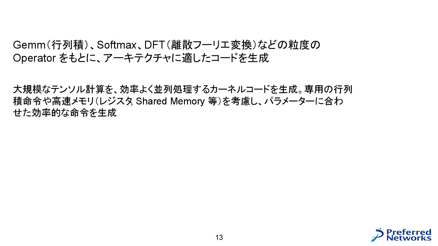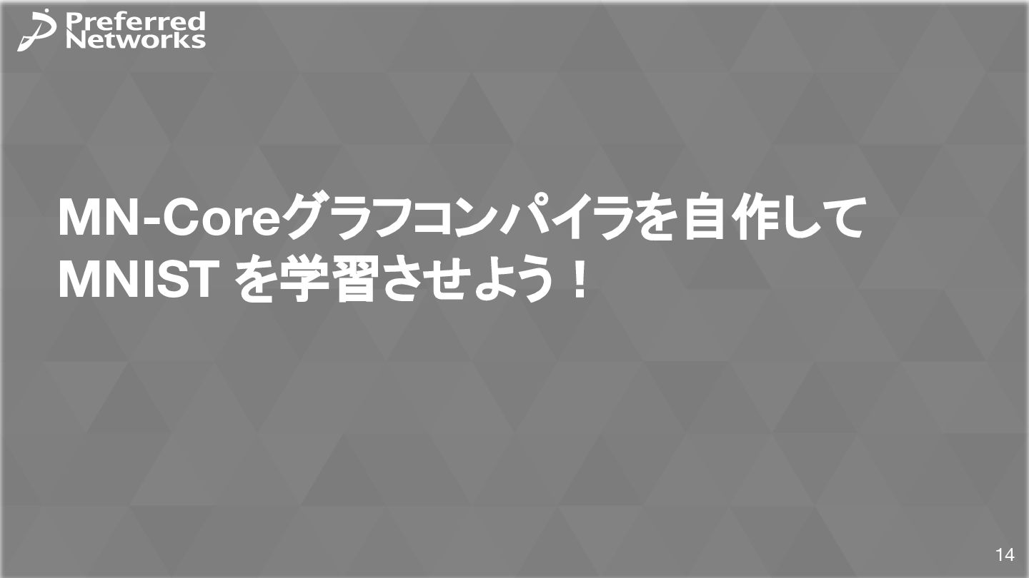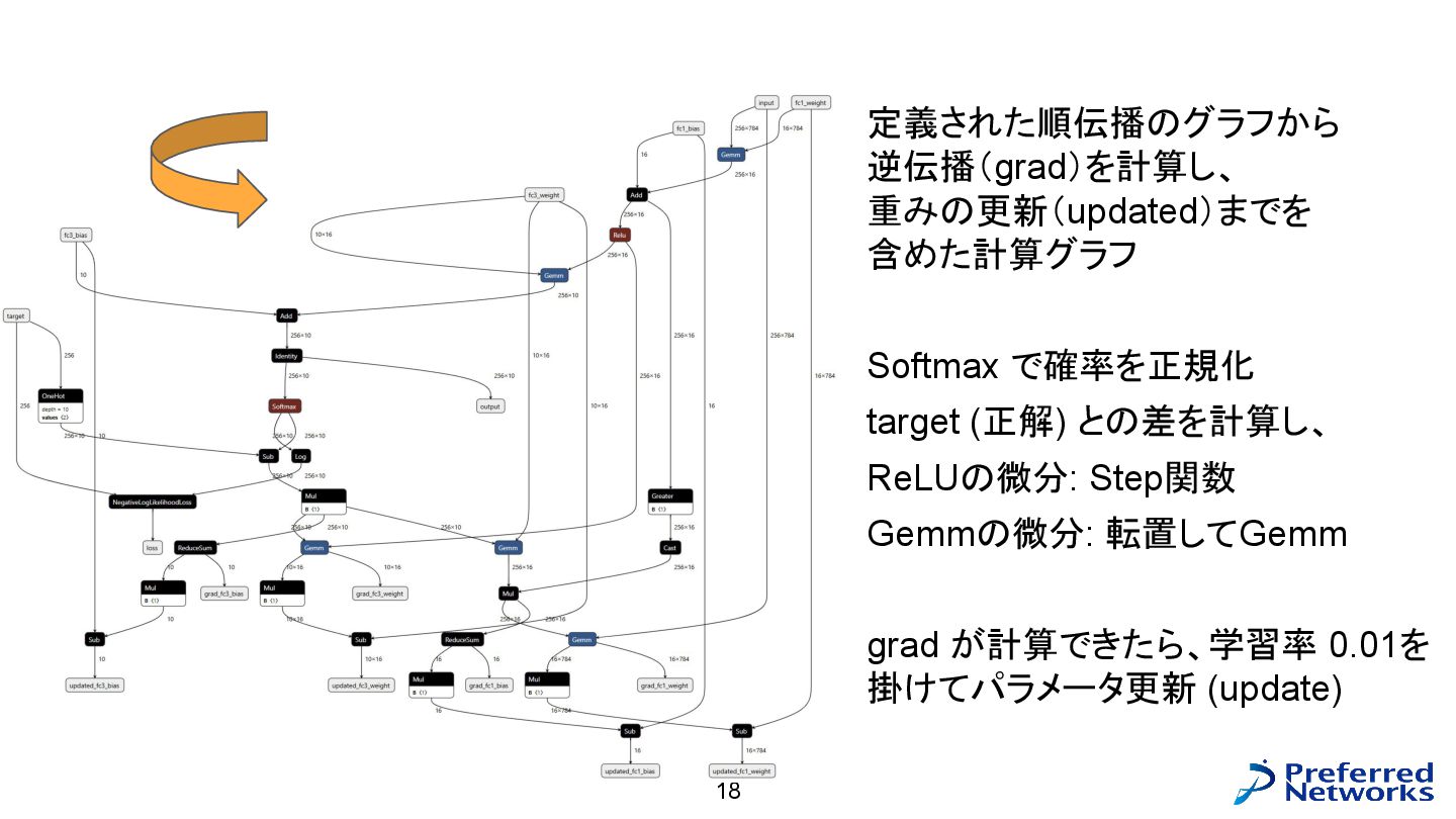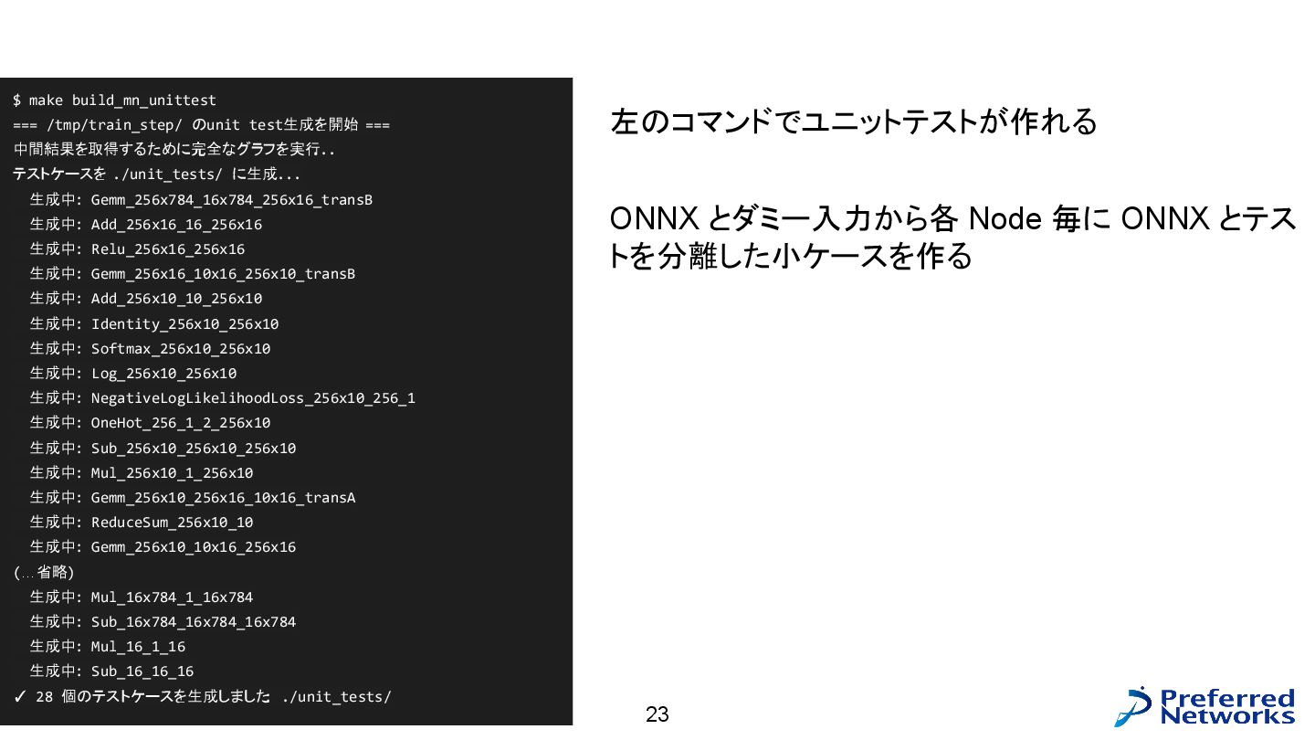 = load<256, 784>(input_ptr); const std::array target = load<256, int>(target_ptr); const Matrix fc1_weight = load<16, 784>(fc1_weight_ptr); const Vector fc1_bias = load<16>(fc1_bias_ptr); const Matrix fc3_weight = load<10, 16>(fc3_weight_ptr); const Vector fc3_bias = load<10>(fc3_bias_ptr); // 計算 const Matrix fc1_pre_matmul = matmul<256, 784, 16>(input, trans<16, 784>(fc1_weight)); const Matrix fc1_pre = add_colvec<256, 16>(fc1_pre_matmul, fc1_bias); const Matrix fc1 = relu<256, 16>(fc1_pre); const Matrix fc3_pre_matmul = matmul<256, 16, 10>(fc1, trans<10, 16>(fc3_weight)); const Matrix fc3_pre = add_colvec<256, 10>(fc3_pre_matmul, fc3_bias); const Matrix probs = softmax<256, 10>(fc3_pre); 以下のような C++ コードが生成される(load, matmul などの定義はテンプレートに)