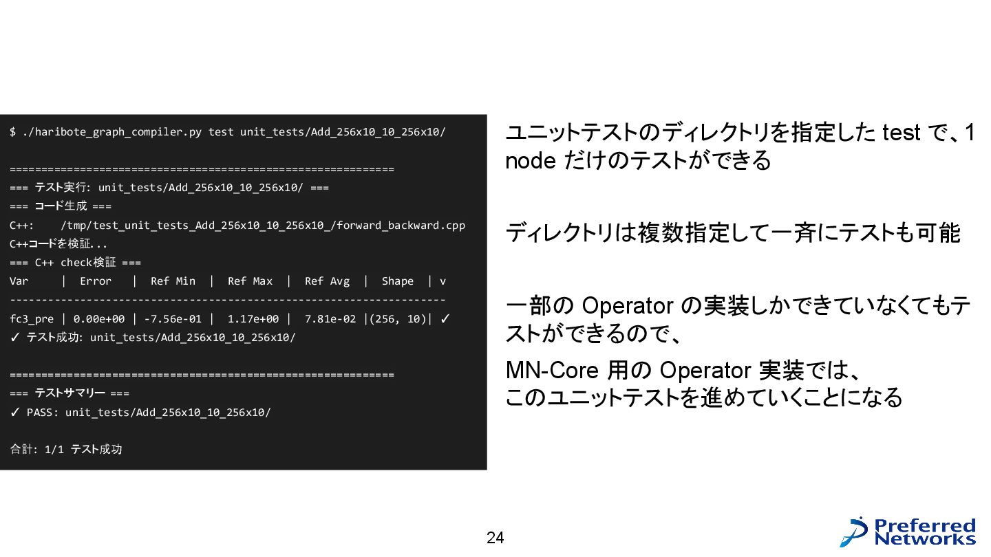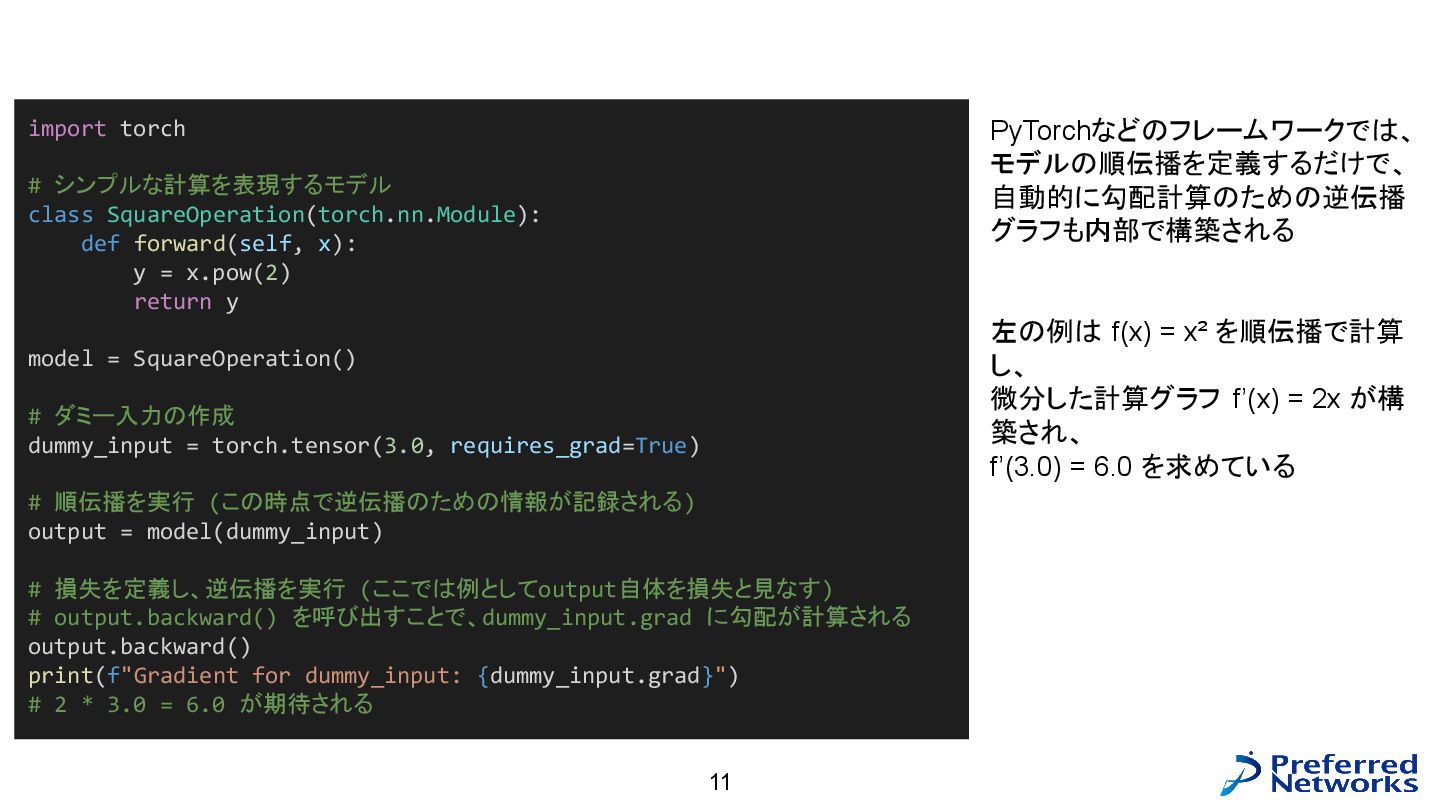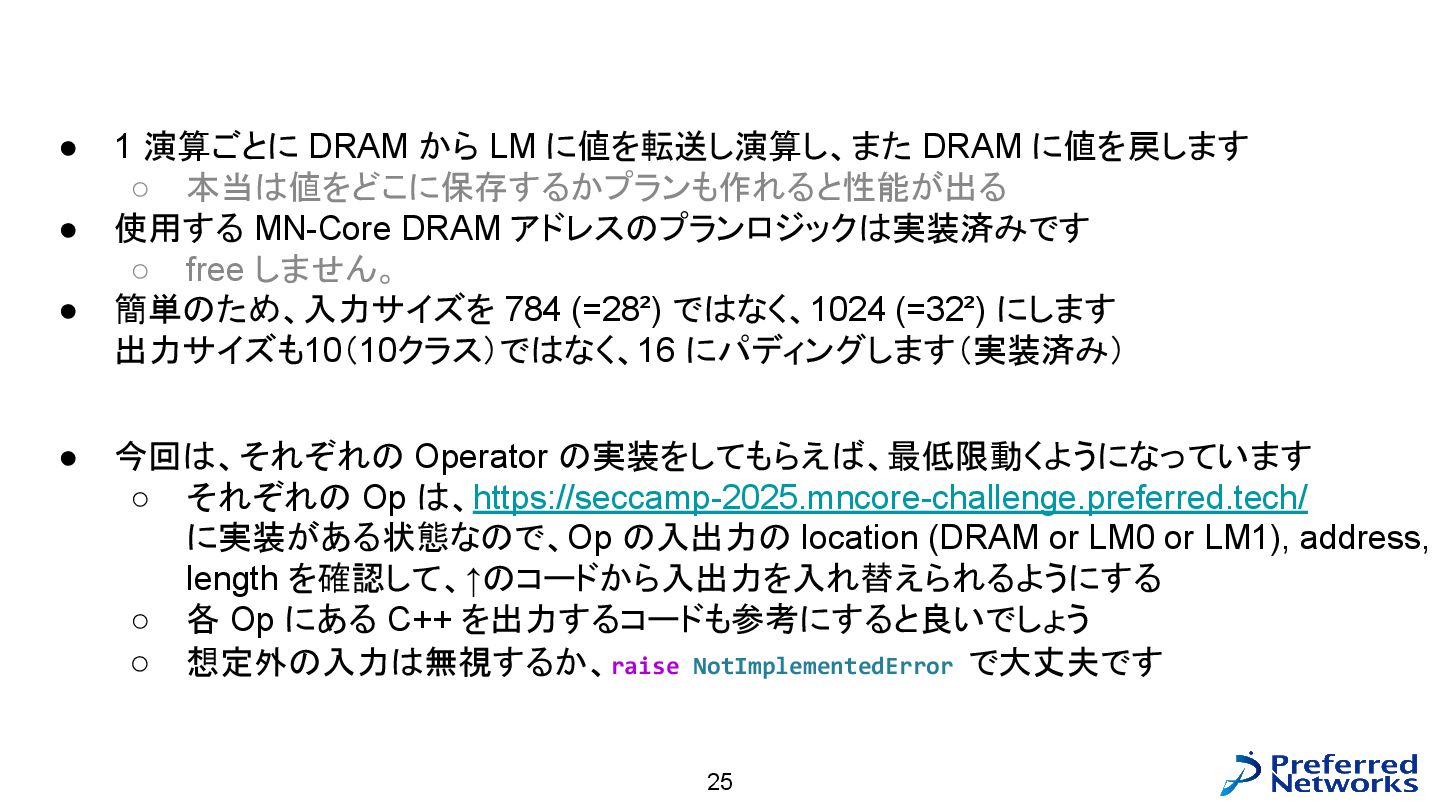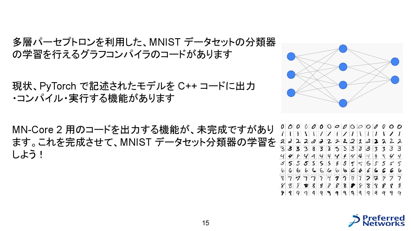= load<256, 784>(input_ptr); const std::array target = load<256, int>(target_ptr); const Matrix fc1_weight = load<16, 784>(fc1_weight_ptr); const Vector fc1_bias = load<16>(fc1_bias_ptr); const Matrix fc3_weight = load<10, 16>(fc3_weight_ptr); const Vector fc3_bias = load<10>(fc3_bias_ptr); // 計算 const Matrix fc1_pre_matmul = matmul<256, 784, 16>(input, trans<16, 784>(fc1_weight)); const Matrix fc1_pre = add_colvec<256, 16>(fc1_pre_matmul, fc1_bias); const Matrix fc1 = relu<256, 16>(fc1_pre); const Matrix fc3_pre_matmul = matmul<256, 16, 10>(fc1, trans<10, 16>(fc3_weight)); const Matrix fc3_pre = add_colvec<256, 10>(fc3_pre_matmul, fc3_bias); const Matrix probs = softmax<256, 10>(fc3_pre); 以下のような C++ コードが生成される(load, matmul などの定義はテンプレートに)