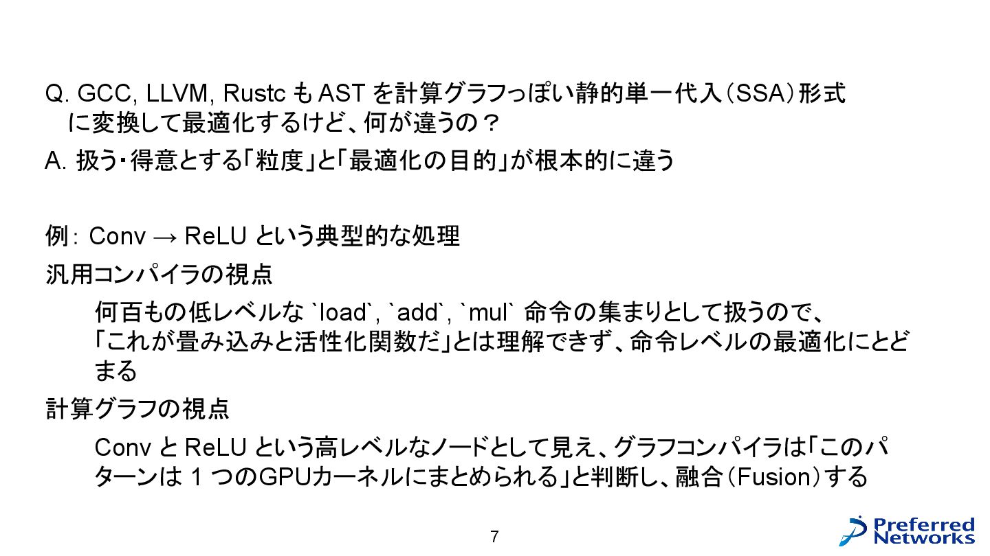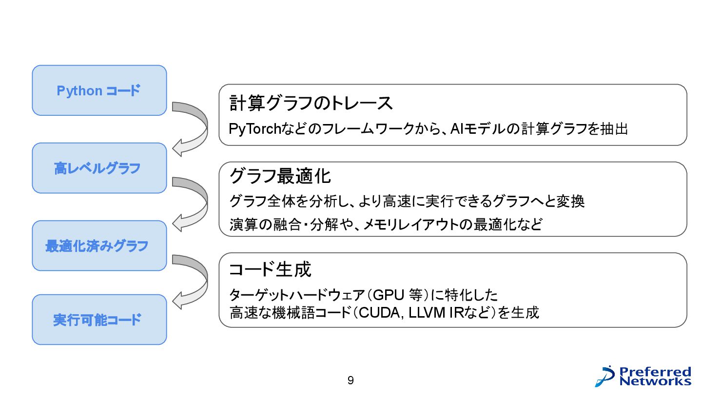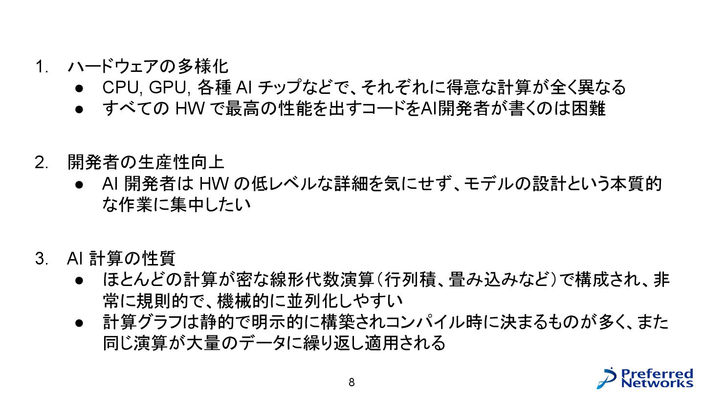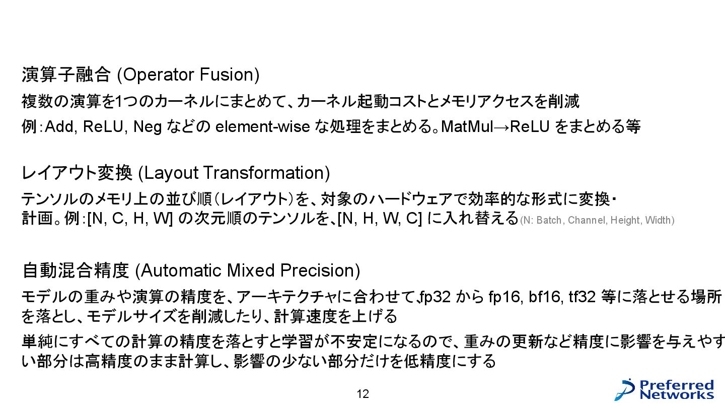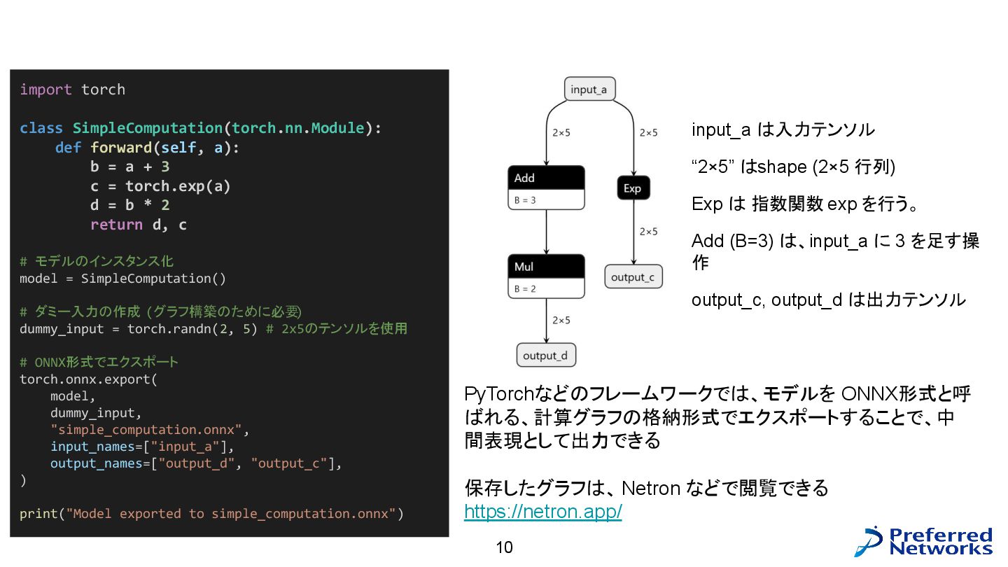 = load<256, 784>(input_ptr); const std::array target = load<256, int>(target_ptr); const Matrix fc1_weight = load<16, 784>(fc1_weight_ptr); const Vector fc1_bias = load<16>(fc1_bias_ptr); const Matrix fc3_weight = load<10, 16>(fc3_weight_ptr); const Vector fc3_bias = load<10>(fc3_bias_ptr); // 計算 const Matrix fc1_pre_matmul = matmul<256, 784, 16>(input, trans<16, 784>(fc1_weight)); const Matrix fc1_pre = add_colvec<256, 16>(fc1_pre_matmul, fc1_bias); const Matrix fc1 = relu<256, 16>(fc1_pre); const Matrix fc3_pre_matmul = matmul<256, 16, 10>(fc1, trans<10, 16>(fc3_weight)); const Matrix fc3_pre = add_colvec<256, 10>(fc3_pre_matmul, fc3_bias); const Matrix probs = softmax<256, 10>(fc3_pre); 以下のような C++ コードが生成される(load, matmul などの定義はテンプレートに)