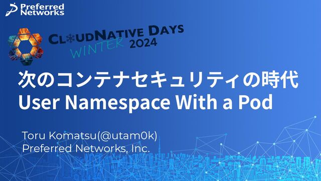 本セッションでは GA が近づいている Kubernetes の新機能の「User Namespace」について説明します。本機能は 2016 年から要望のあったコミュニティ待望の機能です。また、「User Namespace」 を用いた Pod は過去にあったコンテナランタイムの脆弱性の多くに対して有効な防御策となります。
