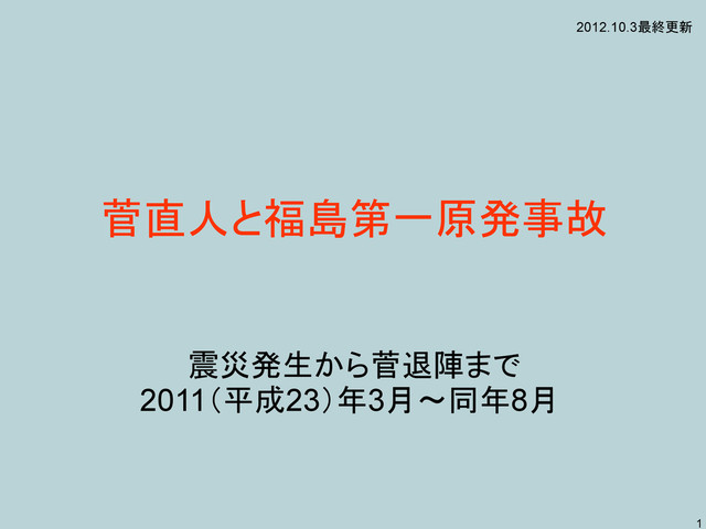 1 菅直人と福島第一原発事故 震災発生から菅退陣まで 2011(平成23)年3月~同年8月 2012.10.3最終更新