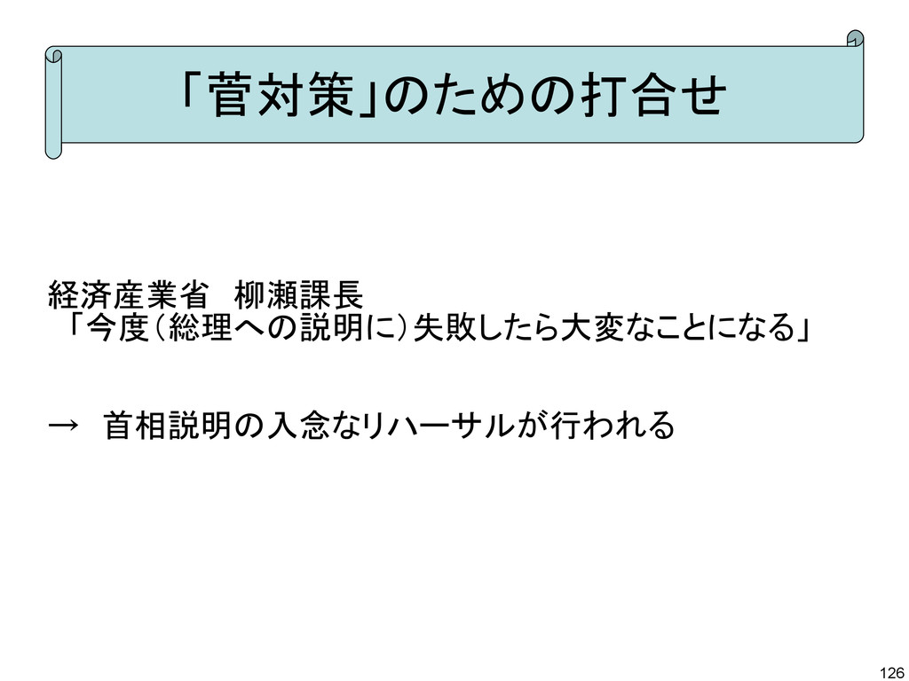 355 3(a) 「イラ菅」 海水注入をめぐって・・・ 貴重な時間を費やして、説明の リハーサルを行っていた・・・ → 菅の存在が障壁になっていた