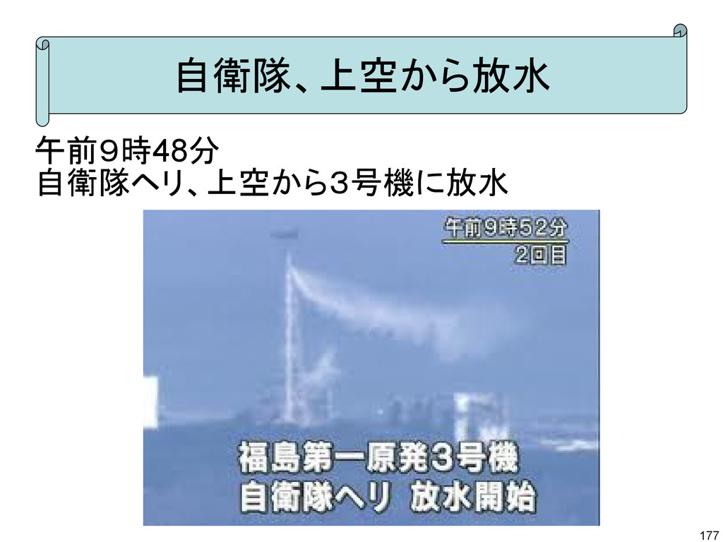 344 1(b) マイクロマネジメント 自衛隊の放水が遅れた? 3月15日 官邸にて 事務方「自衛隊による放水活動を要請しては?」 菅「ホウ酸は粉末で入れるのか液化して入れるのか」 事務方「……」 菅「答えられないのか。もっと勉強してから来い」 →「このせいで自衛隊出動要請が7時間遅れた」と官邸筋 ※ 真偽は不明
