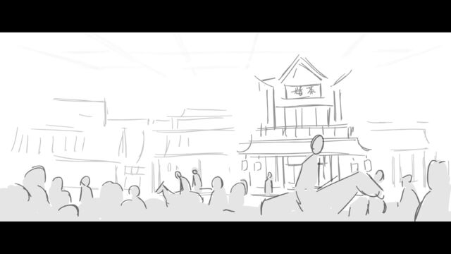 Two rivals run into each other in a tea house. A fight and chase ensue, somehow leading to an unexpected revelation (Action).