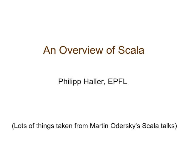 8/27 Pattern Matching in Scala def inOrder[T](t: Tree[T]): List[T] = t match { case Leaf => List() case Fork(e,l,r) => inOrder(l):::List(e):::inOrder(r) } In-order traversal abstract class Tree[+T] case object Leaf extends Tree[Nothing] case class Fork(elem: T, left: Tree[T], right: Tree[T]) extends Tree[T] Binary trees • Purity: cases are objects or classes • Extensibility: can define more cases elsewhere • Encapsulation: only parameters revealed • Representation independence: extractors [ECOOP'07] case modifier enables pattern matching