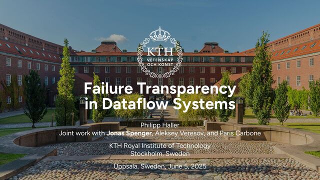 model is failure transparent • We prove liveness of the implementation model • The implementation model eventually produces outputs for all epochs in its input • Discussion of related work on failure transparency, failure transparency proofs, resilient distributed programming models, and failure recovery • Most recent work: • Extends results (including proof) to failure-transparent actor model • Different failure recovery protocol, different proof technique (simulation using prophecy variables) Aleksey Veresov, Jonas Spenger, Paris Carbone, Philipp Haller: Failure Transparency in Stateful Dataflow Systems. ECOOP 2024: 42:1-42:31 Jonas Spenger, Paris Carbone, Philipp Haller: Semantics of Failure Transparent Actors. GulFest 2025: to appear