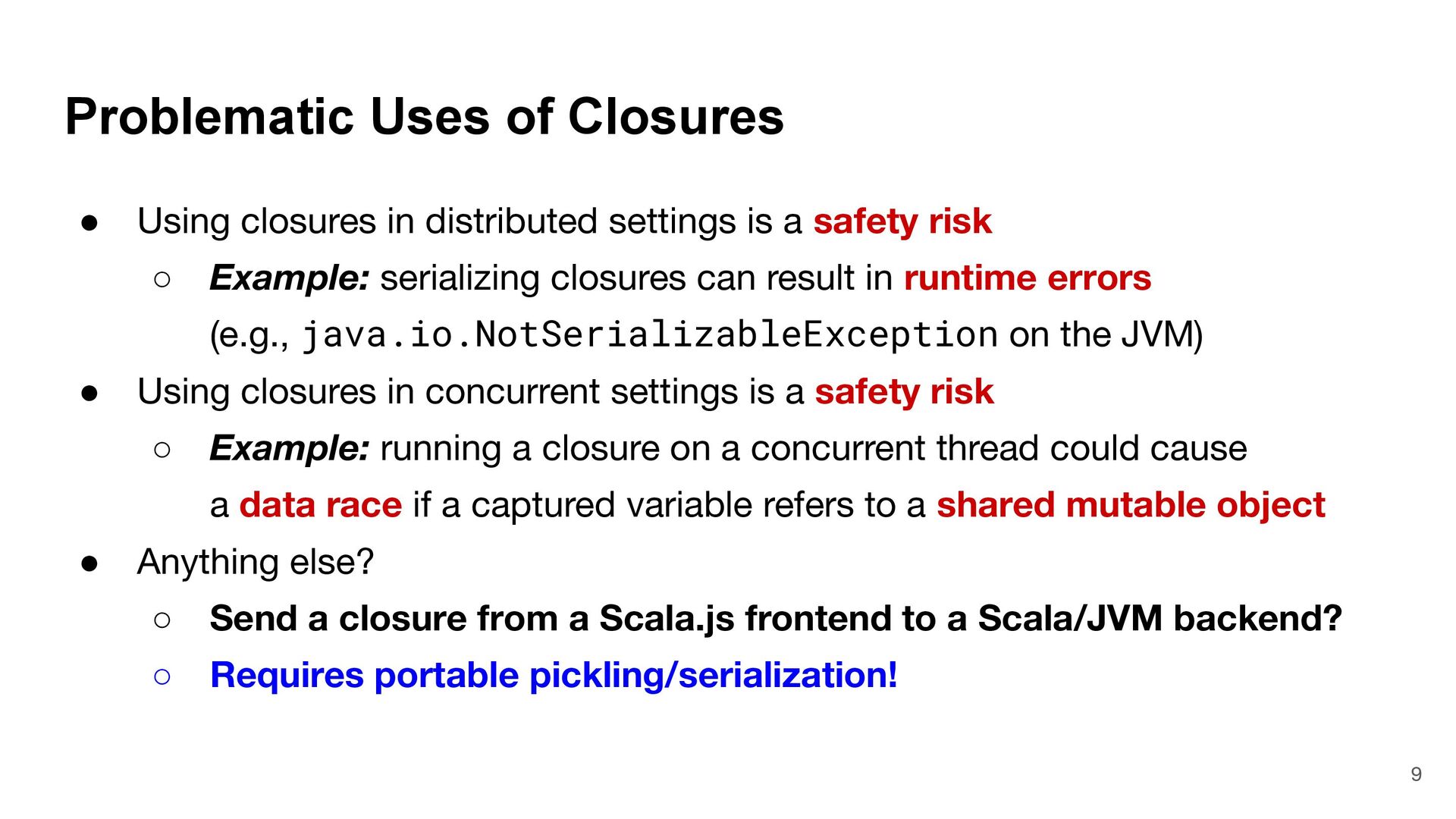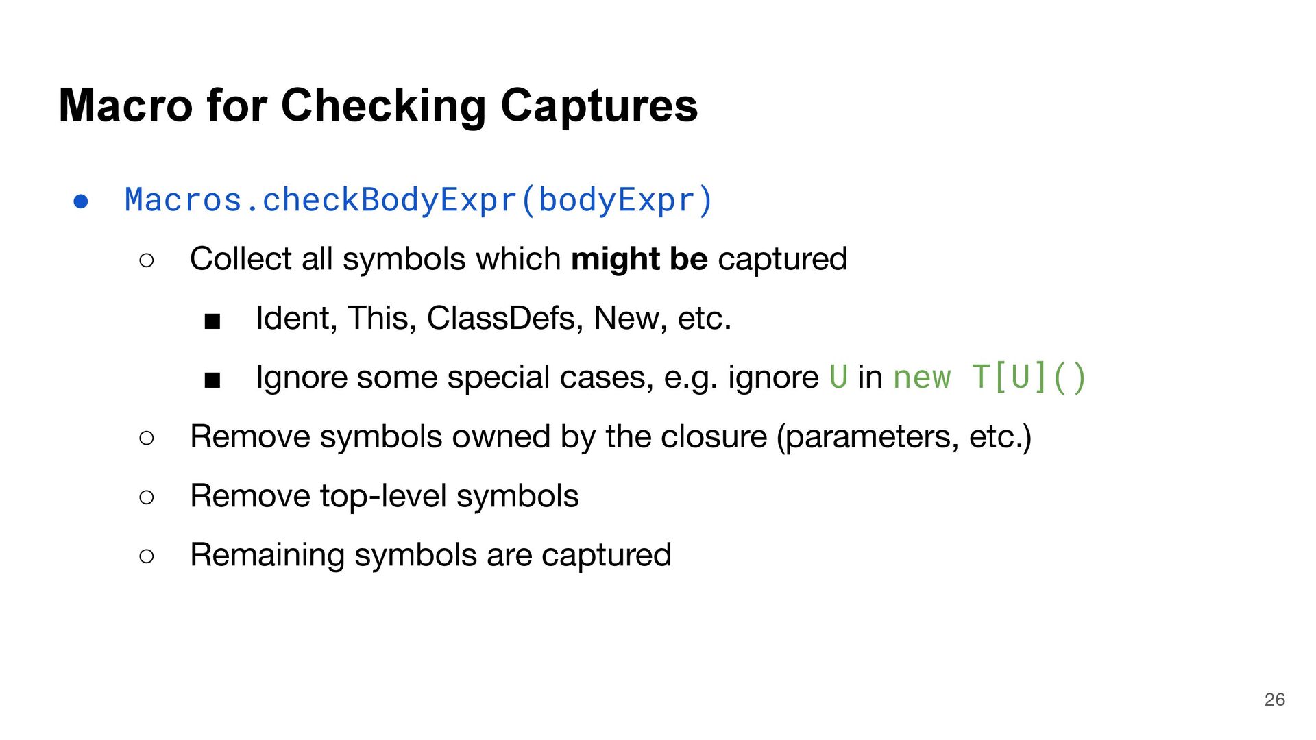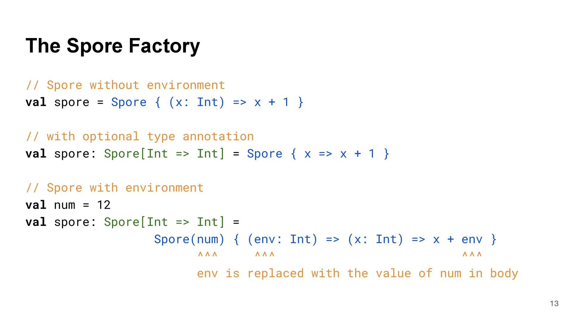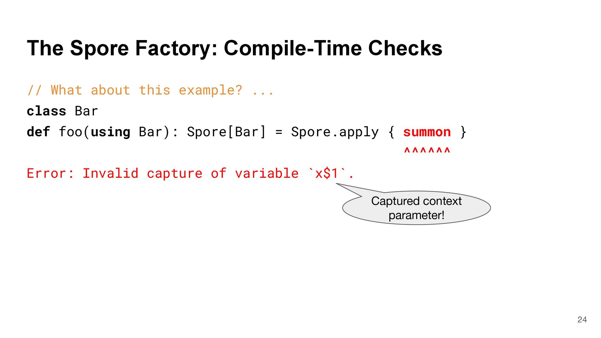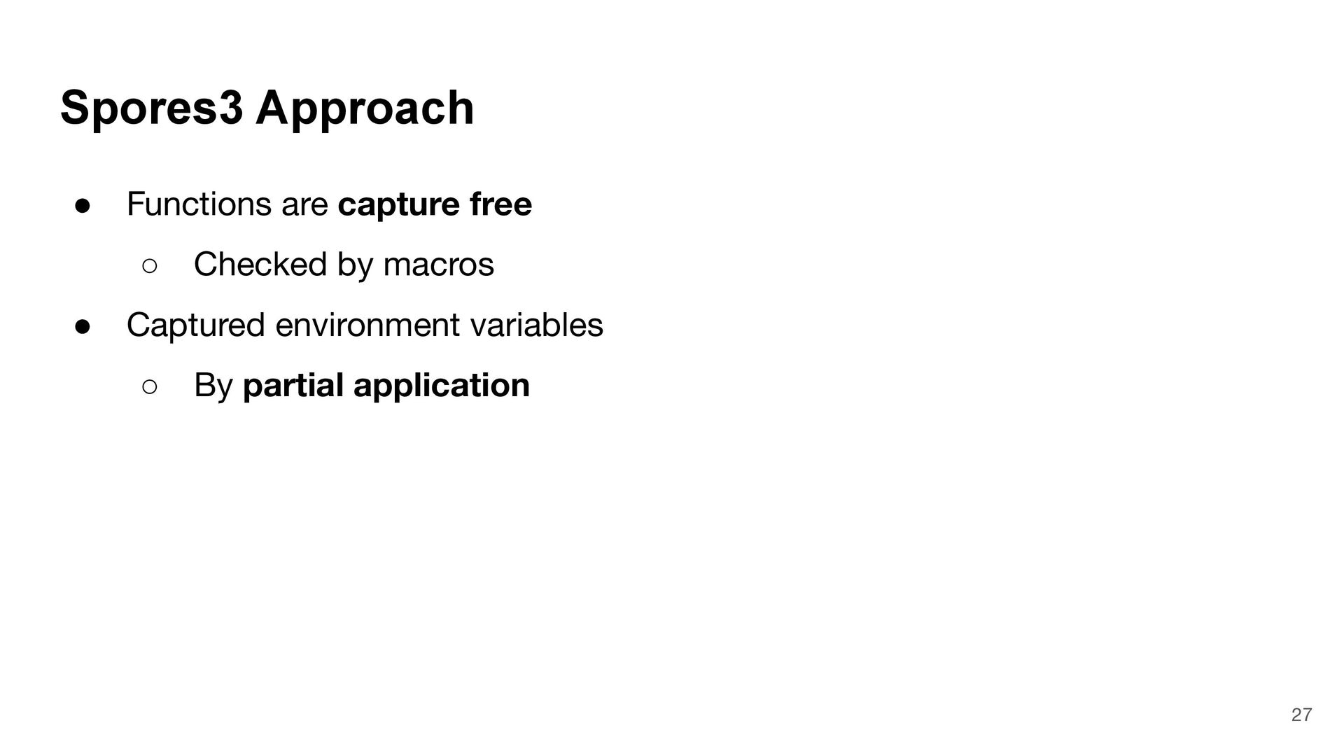= { (num: Int) => num < Global.fld } assert(numbers.filter(fun), List(3, 2, 4)) What is Captured and What isn't? 4 object Global { val fld = 5 } val fun = { (num: Int) => num < Global.fld } assert(numbers.filter(fun), List(3, 2, 4)) val numbers = List(6, 3, 9, 2, 4) def mkFilter(threshold: Int) = (num: Int) => num < threshold val fun = mkFilter(5) assert(numbers.filter(fun), List(3, 2, 4)) class Filter(threshold: Int) extends Int => Bool: def apply(num: Int) = num < threshold val fun = Filter(5) assert(numbers.filter(fun), List(3, 2, 4)) Top-level object captured "captured" Not captured