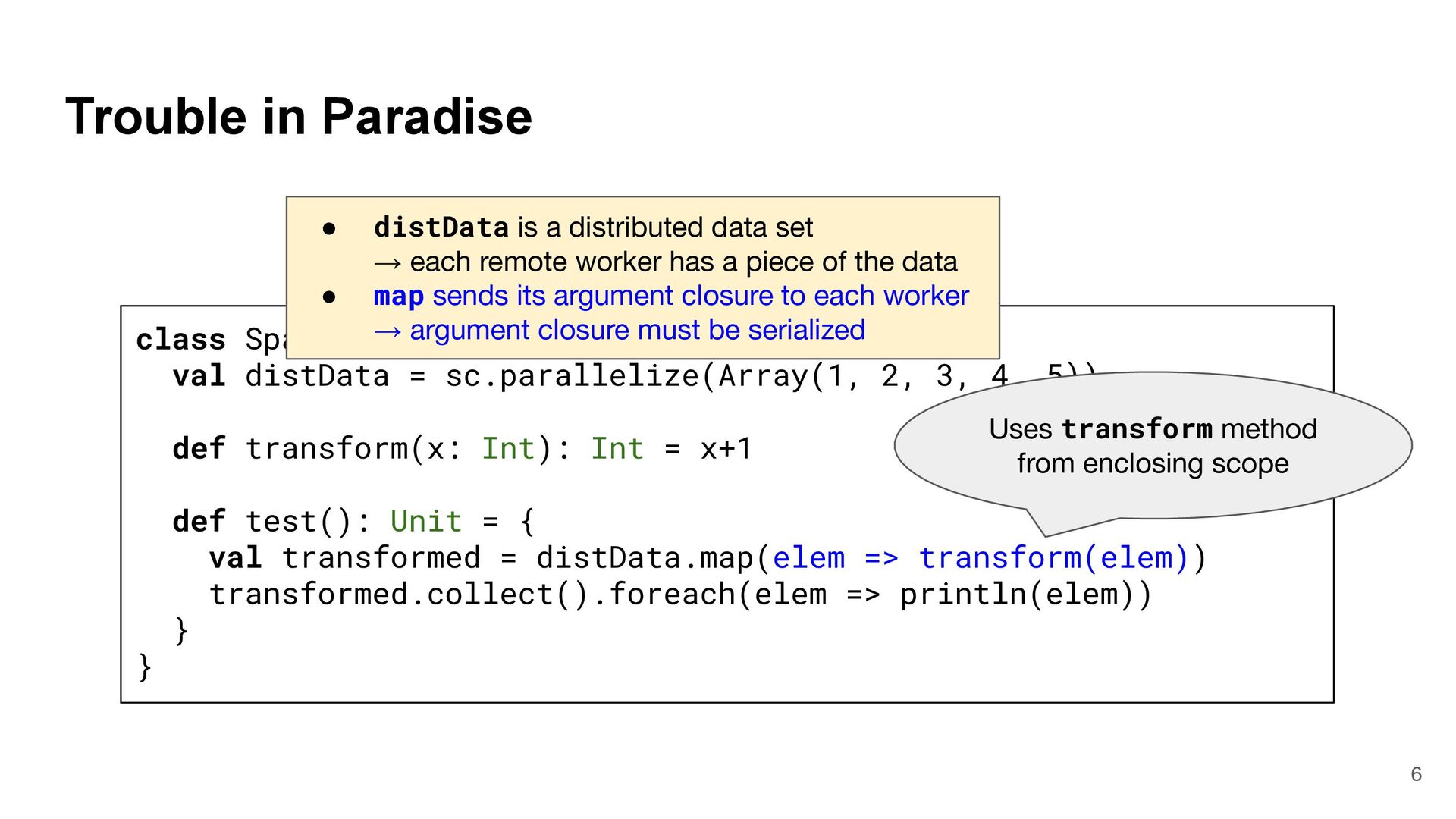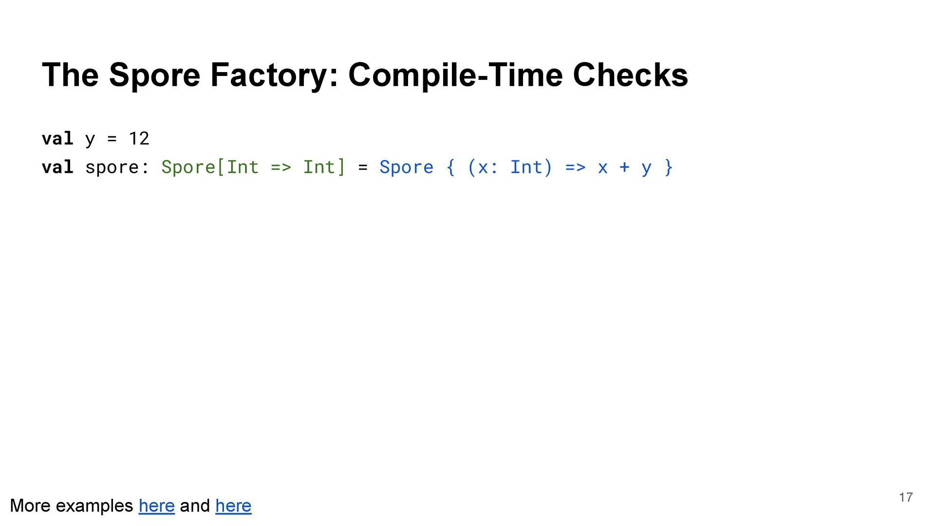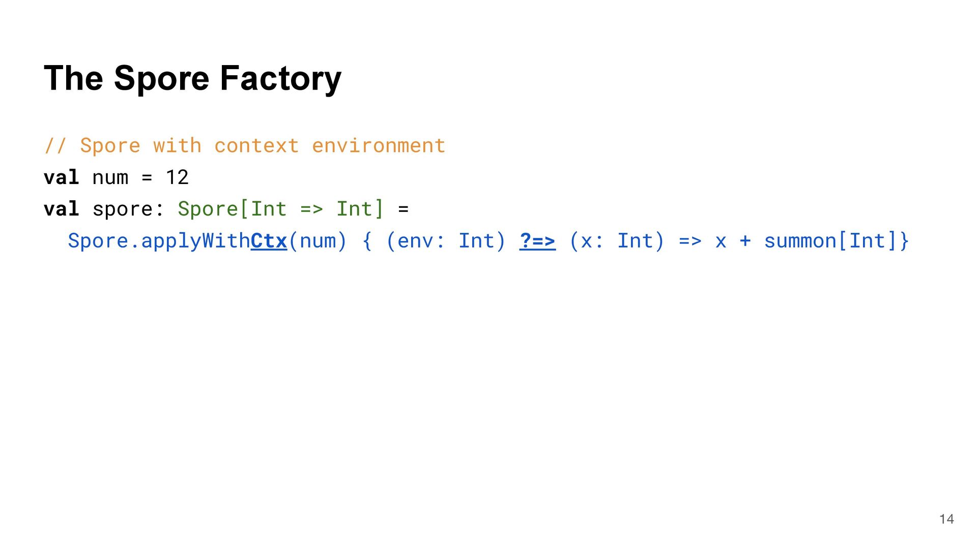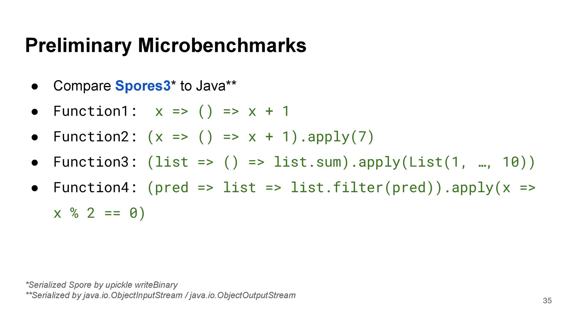 = { (num: Int) => num < Global.fld } assert(numbers.filter(fun), List(3, 2, 4)) What is Captured and What isn't? 4 object Global { val fld = 5 } val fun = { (num: Int) => num < Global.fld } assert(numbers.filter(fun), List(3, 2, 4)) val numbers = List(6, 3, 9, 2, 4) def mkFilter(threshold: Int) = (num: Int) => num < threshold val fun = mkFilter(5) assert(numbers.filter(fun), List(3, 2, 4)) class Filter(threshold: Int) extends Int => Bool: def apply(num: Int) = num < threshold val fun = Filter(5) assert(numbers.filter(fun), List(3, 2, 4)) Top-level object captured "captured" Not captured