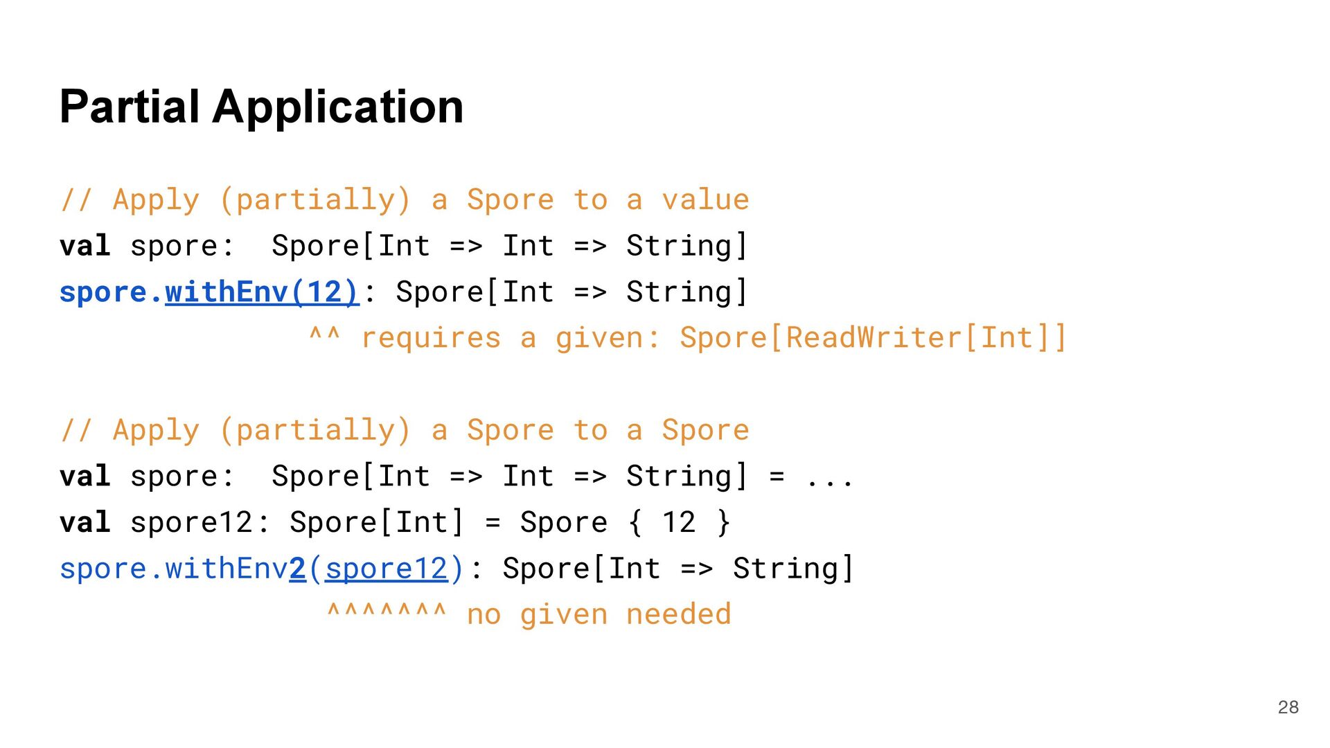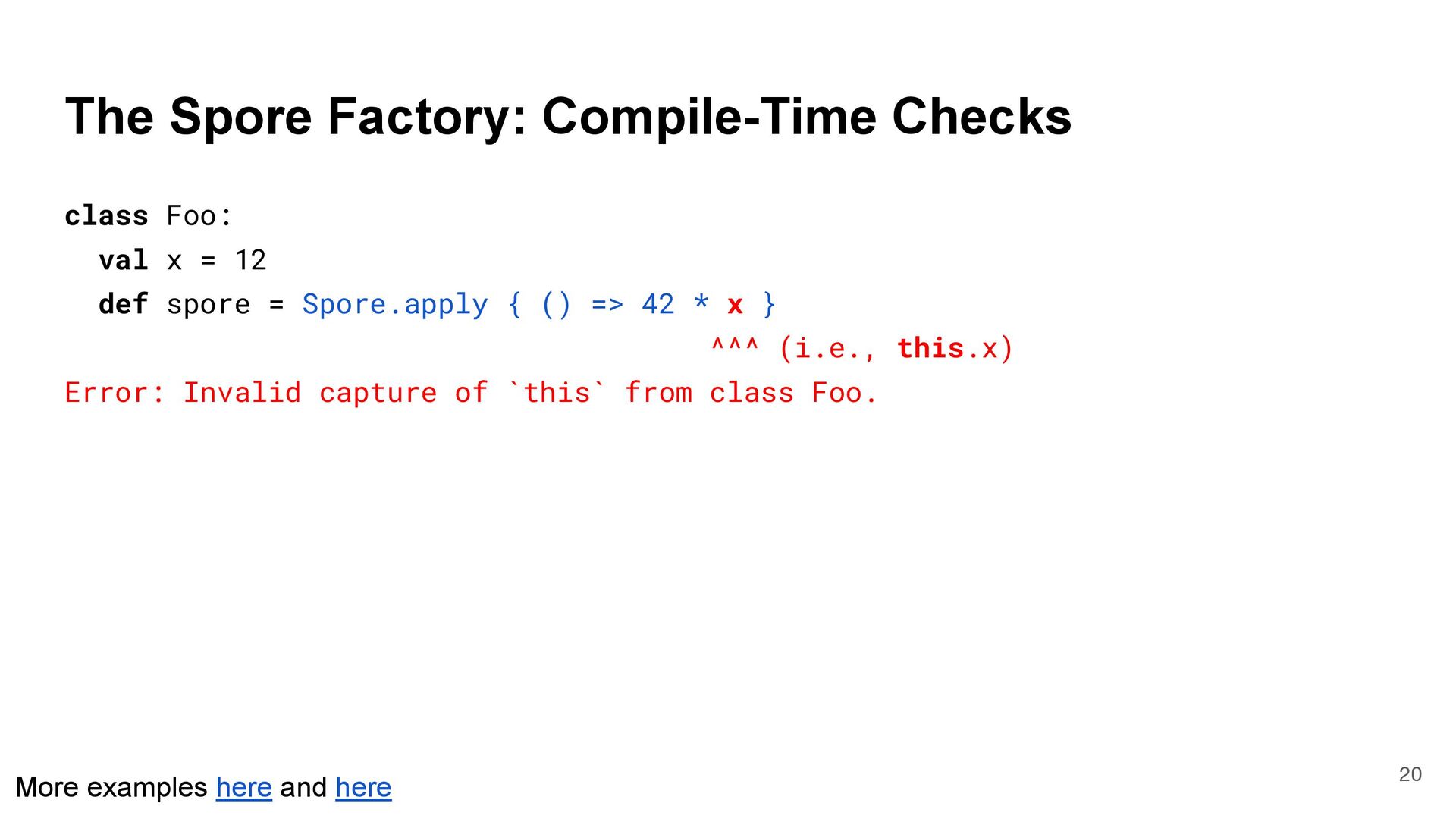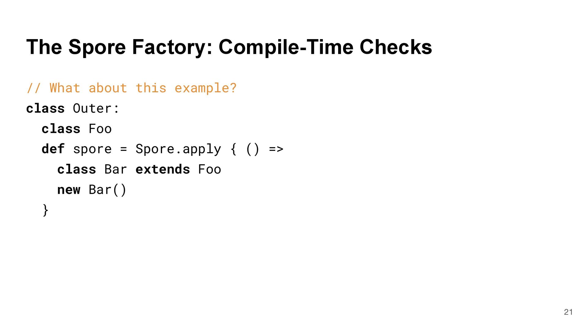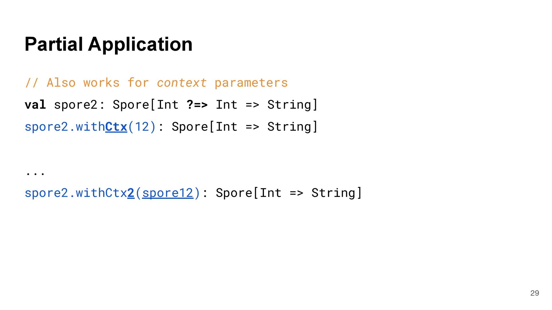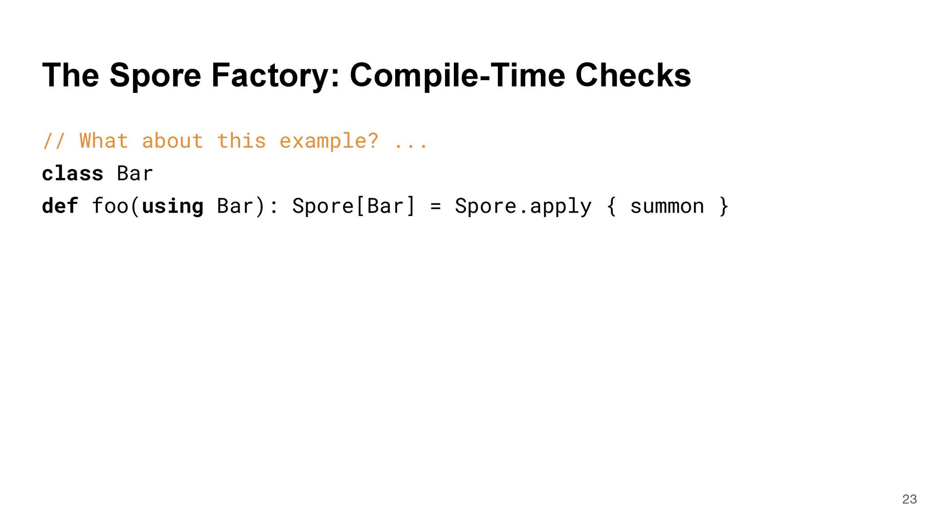 = { (num: Int) => num < Global.fld } assert(numbers.filter(fun), List(3, 2, 4)) What is Captured and What isn't? 4 object Global { val fld = 5 } val fun = { (num: Int) => num < Global.fld } assert(numbers.filter(fun), List(3, 2, 4)) val numbers = List(6, 3, 9, 2, 4) def mkFilter(threshold: Int) = (num: Int) => num < threshold val fun = mkFilter(5) assert(numbers.filter(fun), List(3, 2, 4)) class Filter(threshold: Int) extends Int => Bool: def apply(num: Int) = num < threshold val fun = Filter(5) assert(numbers.filter(fun), List(3, 2, 4)) Top-level object captured "captured" Not captured