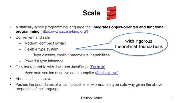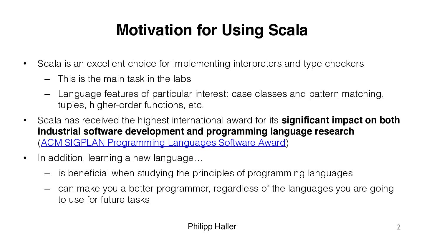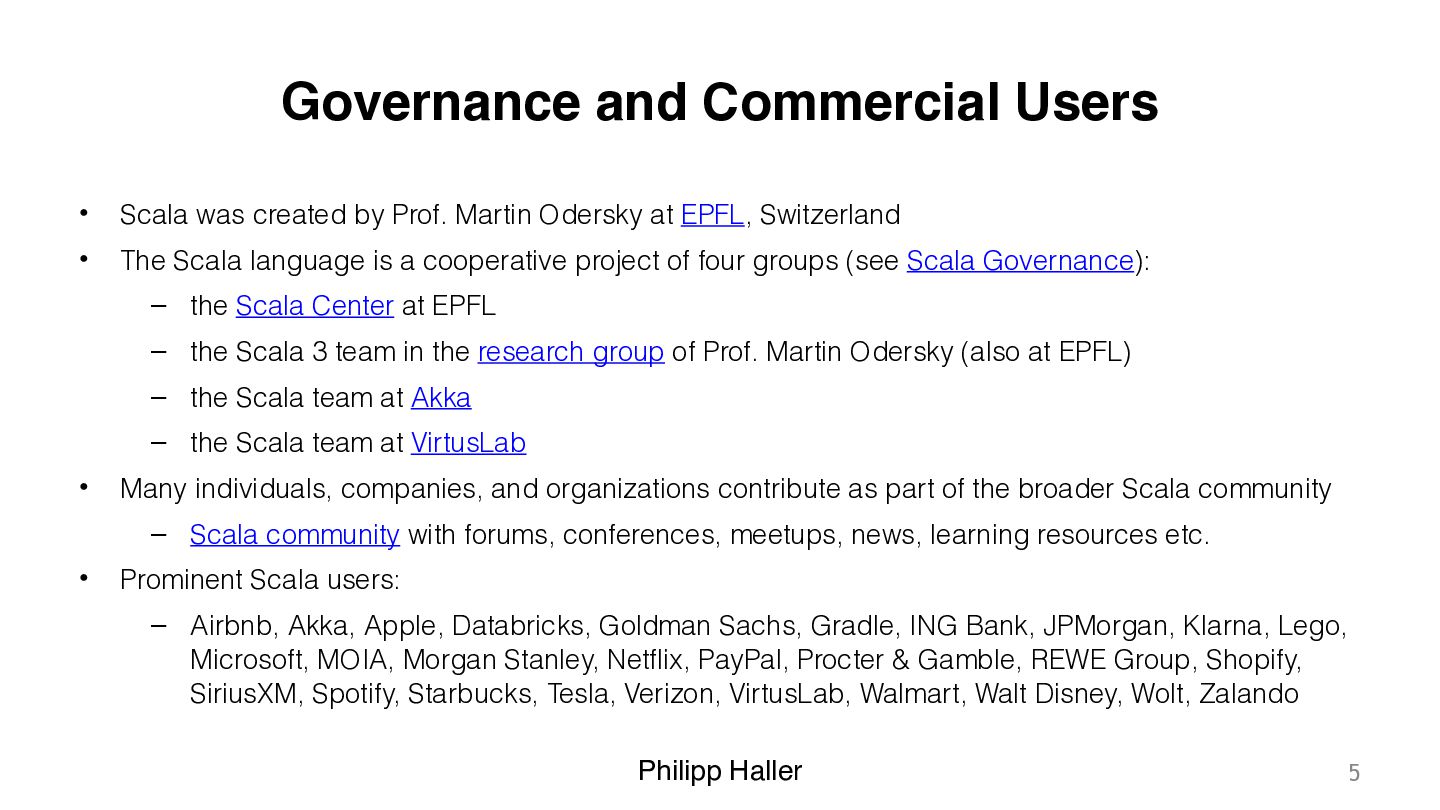by Prof. Martin Odersky at EPFL, Switzerland • The Scala language is a cooperative project of four groups (see Scala Governance): – the Scala Center at EPFL – the Scala 3 team in the research group of Prof. Martin Odersky (also at EPFL) – the Scala team at Akka – the Scala team at VirtusLab • Many individuals, companies, and organizations contribute as part of the broader Scala community – Scala community with forums, conferences, meetups, news, learning resources etc. • Prominent Scala users: – Airbnb, Akka, Apple, Databricks, Goldman Sachs, Gradle, ING Bank, JPMorgan, Klarna, Lego, Microsoft, MOIA, Morgan Stanley, Netflix, PayPal, Procter & Gamble, REWE Group, Shopify, SiriusXM, Spotify, Starbucks, Tesla, Verizon, VirtusLab, Walmart, Walt Disney, Wolt, Zalando 5