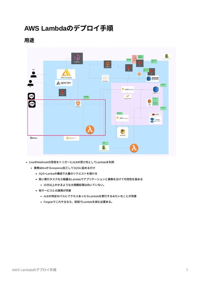 ENV GEM_HOME=${LAMBDA_TASK_ROOT} RUN bundle install CMD [ "app.lambda_handler" ] ※ アーキテクチャをDocker イメージを合わせてます(arm64 ) Mac でDocker イメージをダウンロードするとマルチアーキテクチャでarm64 が選択される。 最初、us-west1 で作っていたらx86_64 のアーキテクチャでLambda 関数が動作するので、アーキテクチャが⼀致せずにエ ラーになった。 そのためus-west-1 以外のリージョンでアーキテクチャを指定して合わせた。 現状M1 以外の⼈がローカルでDocker デプロイするとエラーになるので後ほど、CI 化する。 デプロイ⼿順 ローカルマシンで、git clone https://github.com/yojo-technologies/pharmacy-dx-line-handler ローカルのDockerfile からスクリプトを含めたコンテナイメージを作成 docker build --no-cache -t pharmacy-chatbot-line-handler-dev . ローカルで起動する Lambda コンテナイメージをローカルでテストする https://docs.aws.amazon.com/ja_jp/lambda/latest/dg/images-test.html AWS Lambda Runtime Interface Emulator (RIE) は、Lambda ランタイム API のプロキシでコンテナイメージとしてパッ ケージ化された Lambda 関数をローカルでテストできる json のパースエラーが出てローカルでエミュレーターは動かせなかった。現状はローカルテストはせずにそのままデプロイし て動作確認してる。 curl -XPOST "http://localhost:9000/2015-03-31/functions/function/invocations" -d '{}' イメージを Amazon ECR コンテナレジストリにアップロード AWS CLI をインストール https://docs.aws.amazon.com/ja_jp/cli/latest/userguide/getting-started-install.html AWS の認証情報を設定 aws configure にアクセスID とアクセスキーを設定 https://docs.aws.amazon.com/ja_jp/cli/latest/userguide/cli-configure-quickstart.html Amazon ECR レジストリに対して Docker を認証 aws ecr get-login-password このコマンドは、AmazonECR レジストリへの認証に使⽤できるGetAuthorizationTokenAPI を使⽤して認証トー クンを取得して表⽰します。 Docker CLI など、好みのコンテナクライアントのログインコマンドに認証トークンを渡すことができます このコマンドでAmazonECR レジストリに認証された後、トークンの有効期限が切れるまでIAM プリンシパルがア クセスできる限り、 クライアントを使⽤してそのレジストリからイメージをプッシュおよびプルできます。認証トークンは12 時間有 効です。