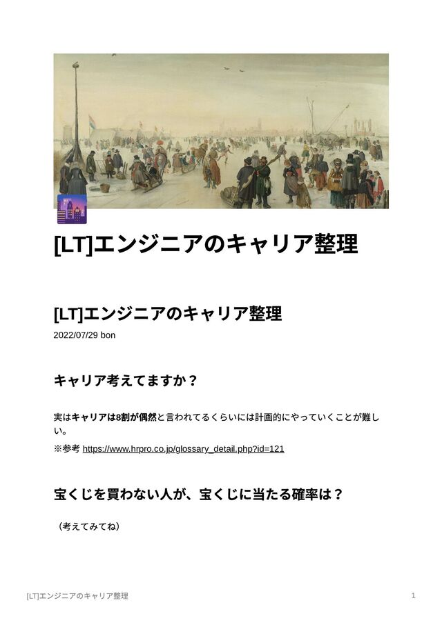 具体的には? ⾃分のスキルを棚卸し 転職ドラフトで⾃分のキャリアを書く( 経験上⼀番⼤変かつモチベ⾼) 職務経歴書を年1 必ず更新しよう( 転ドラで書いたやつをWord に転記する) ⾃分の「できる/ モチベ感じたこと」を⾔葉( 動詞) にしよう 「実装する」「改善する」「チームと働く」など… 具体的には? 壁打ち相⼿を探しまくる Meety やカジュアル⾯談やりまくる&聞きまくる ⾯⽩そうな⼈のSNS を追う(Twitter, blog, Zenn とか) 勉強会で質問しまくる つまり ( 再掲) 計画・⾏動なくして偶然なし!!