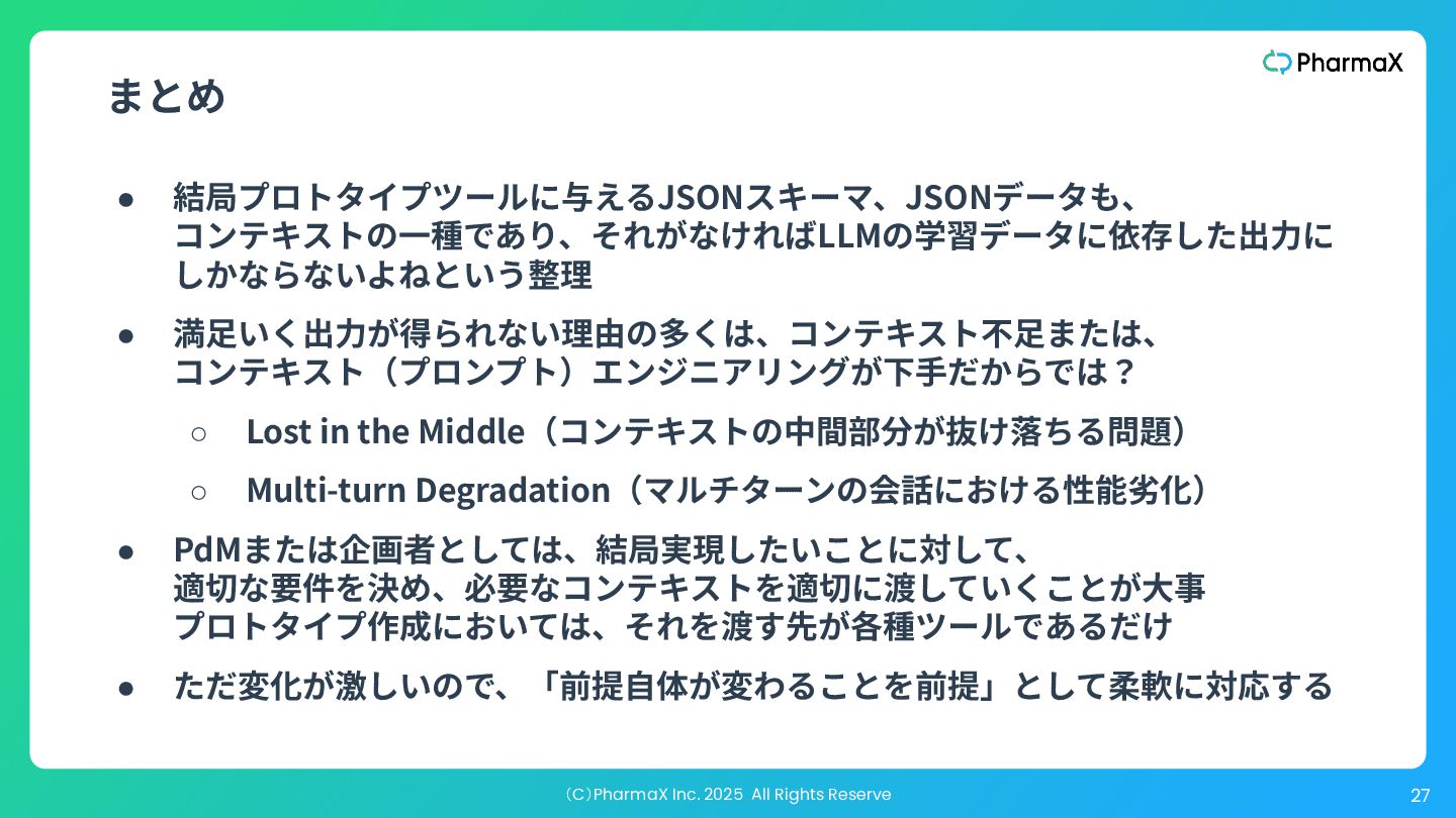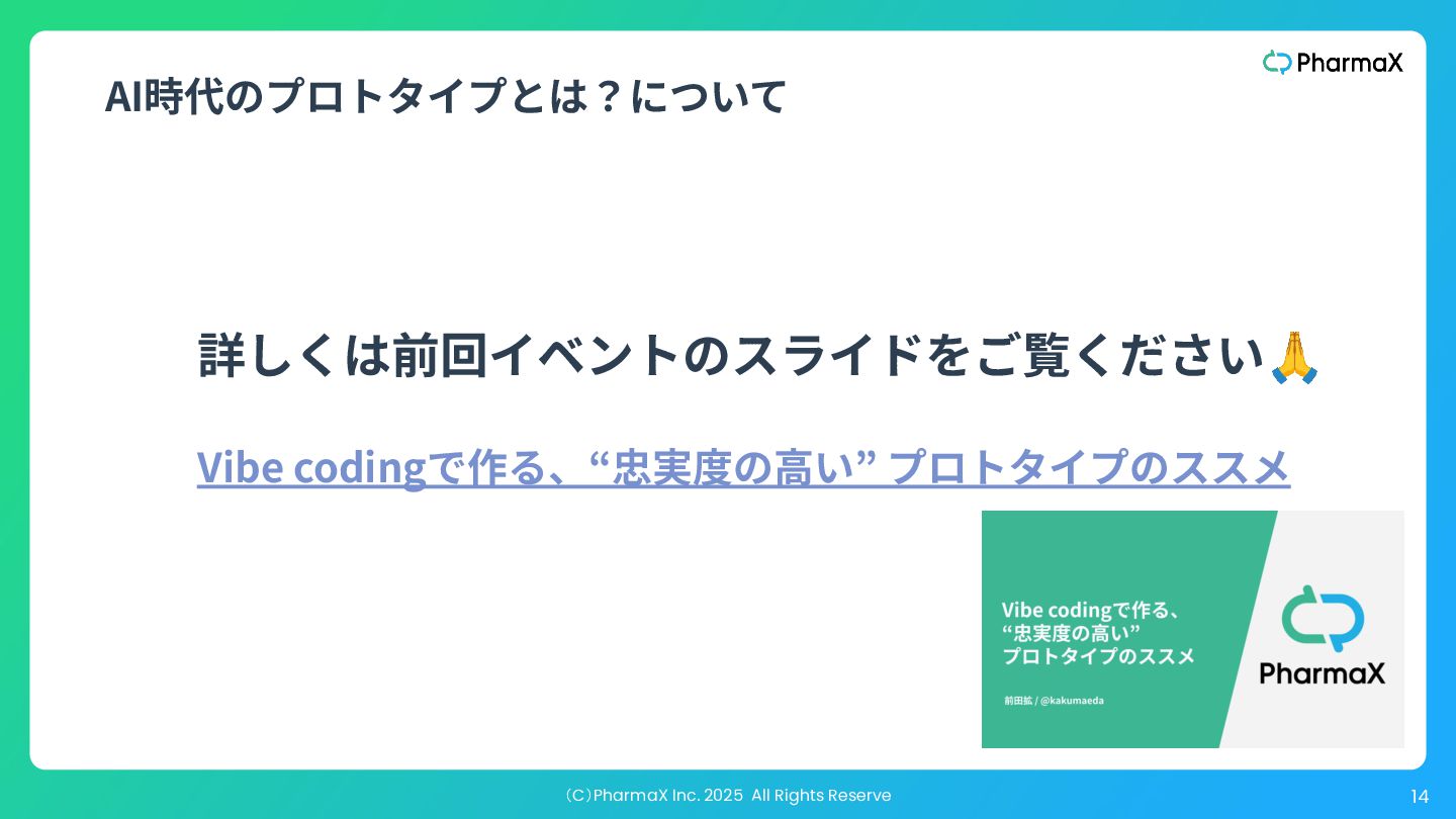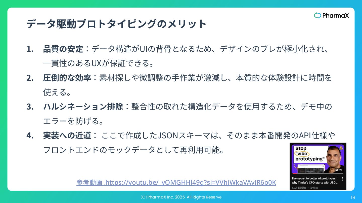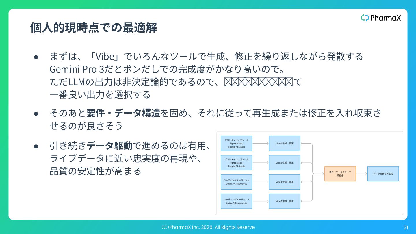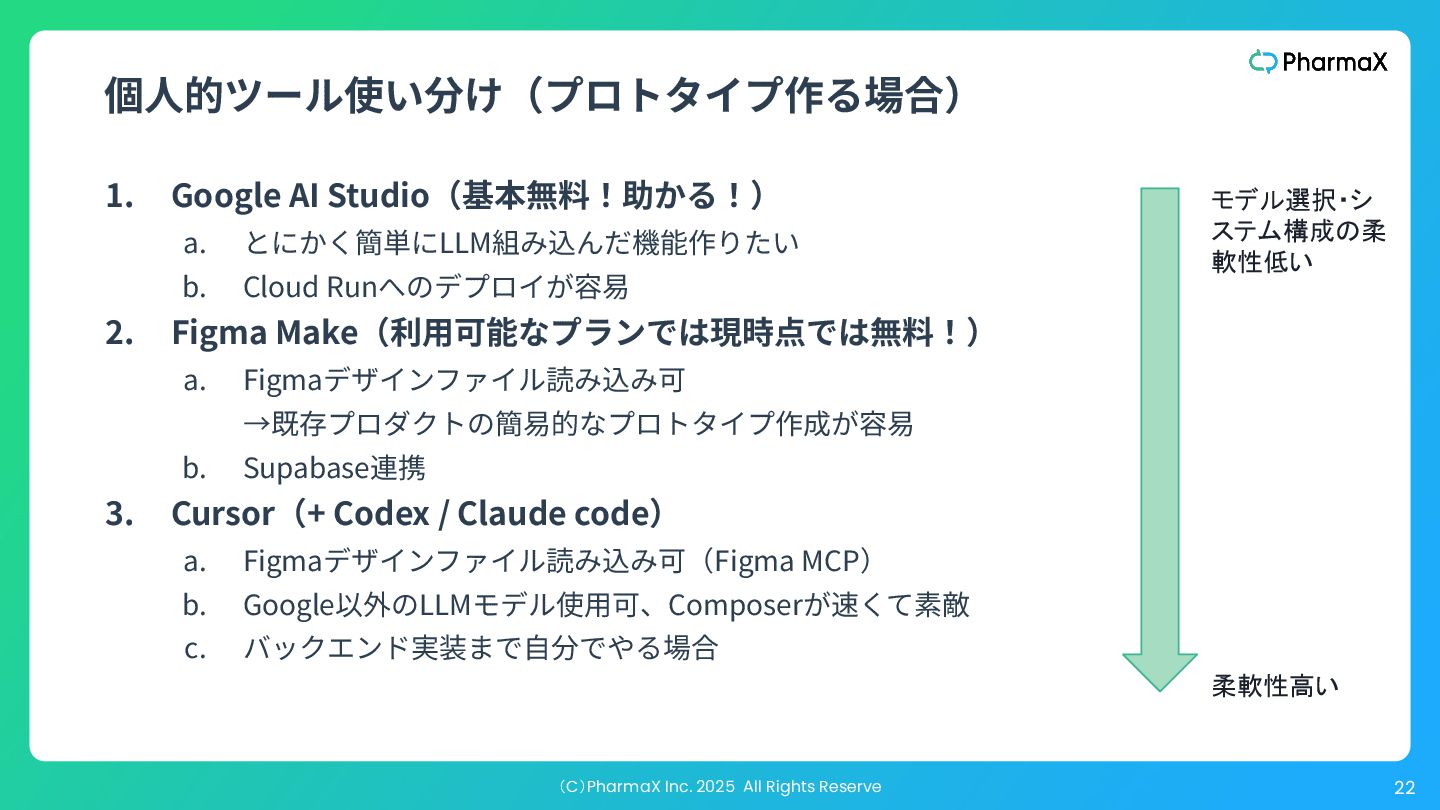 AI Studio(基本無料!助かる!) a. とにかく簡単にLLM組み込んだ機能作りたい b. Cloud Runへのデプロイが容易 2. Figma Make(利⽤可能なプランでは現時点では無料!) a. Figmaデザインファイル読み込み可 →既存プロダクトの簡易的なプロトタイプ作成が容易 b. Supabase連携 3. Cursor(+ Codex / Claude code) a. Figmaデザインファイル読み込み可(Figma MCP) b. Google以外のLLMモデル使⽤可、Composerが速くて素敵 c. バックエンド実装まで⾃分でやる場合 モデル選択・シ ステム構成の柔 軟性低い 柔軟性高い