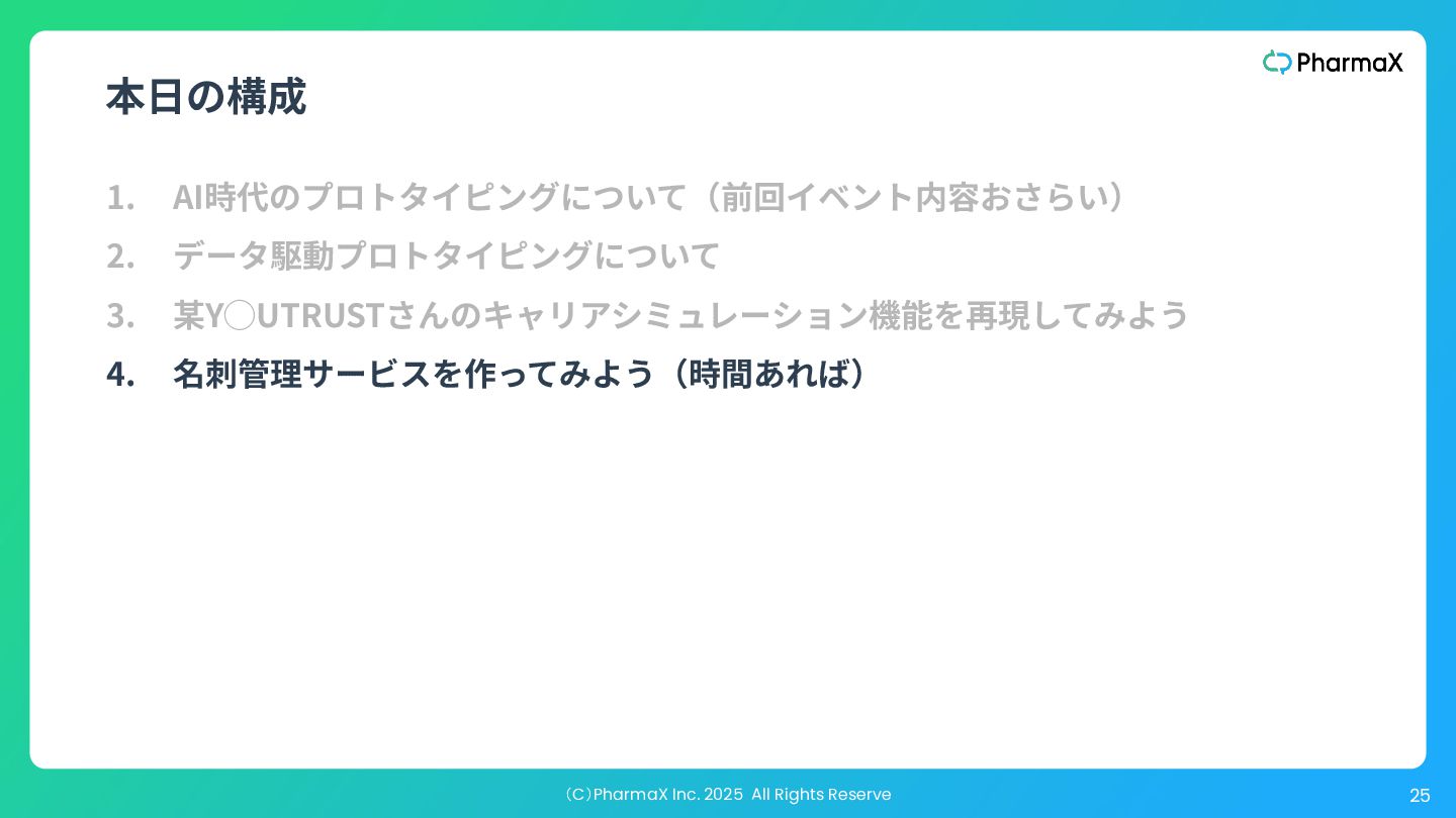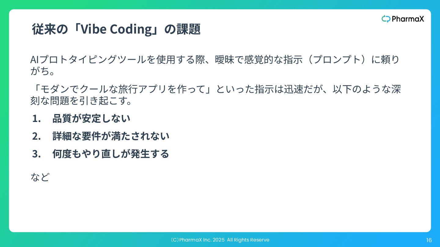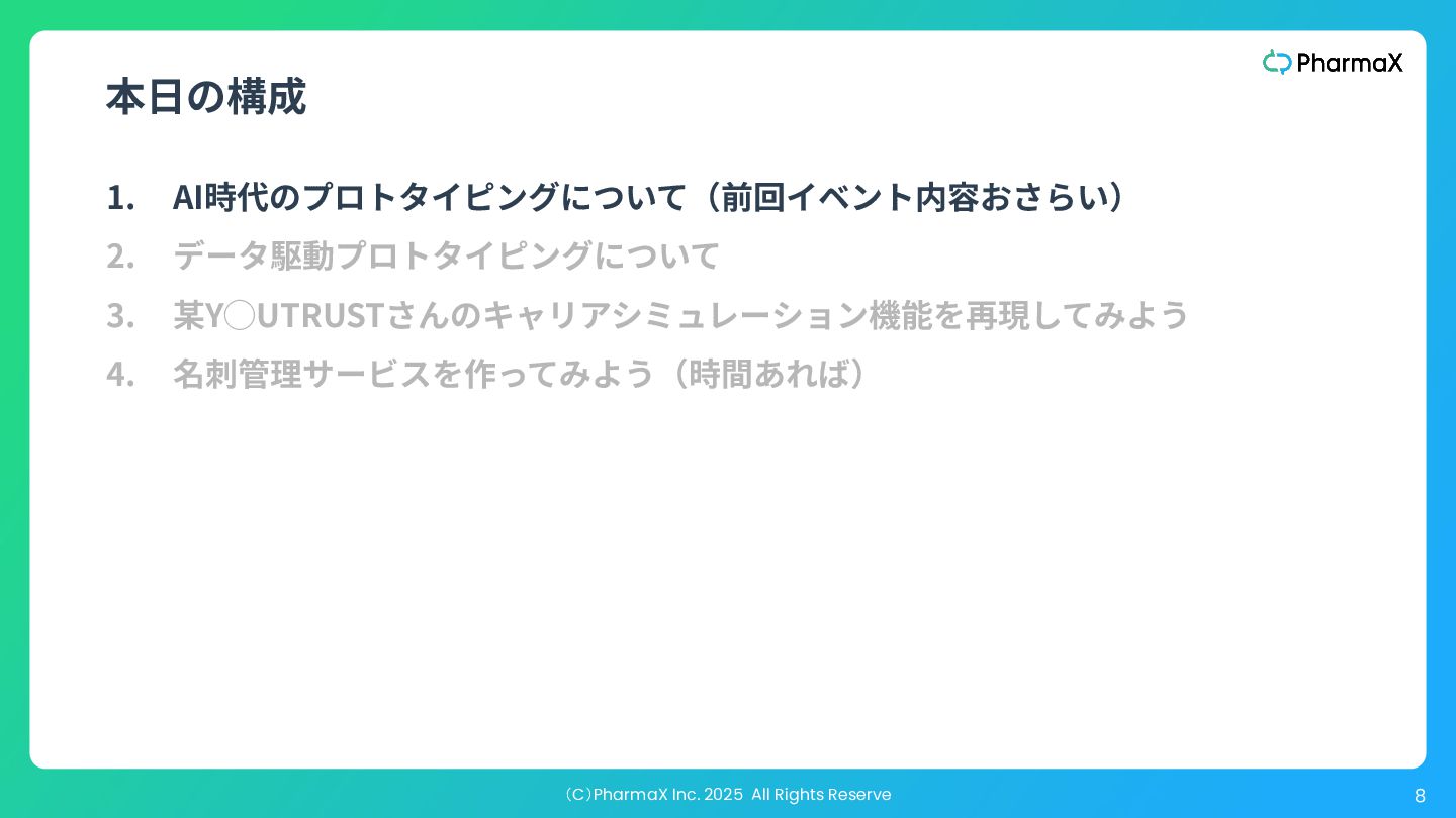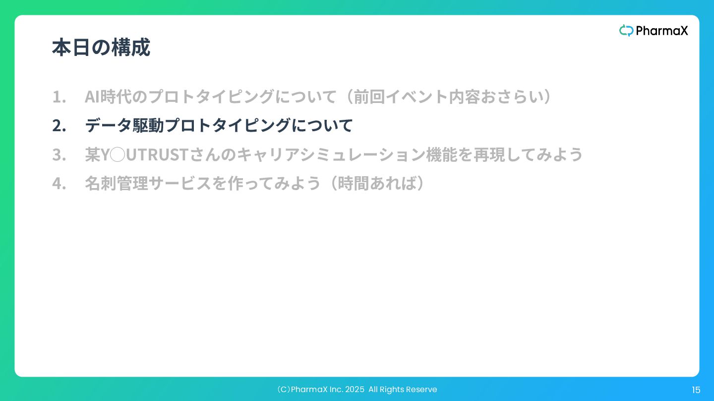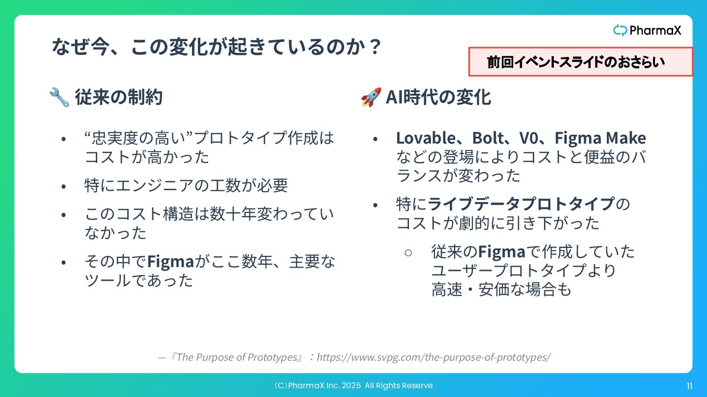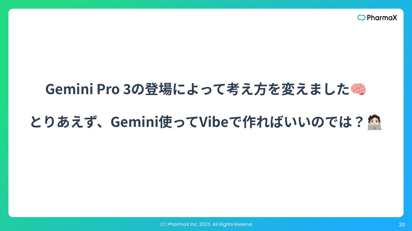 AI Studio(基本無料!助かる!) a. とにかく簡単にLLM組み込んだ機能作りたい b. Cloud Runへのデプロイが容易 2. Figma Make(利⽤可能なプランでは現時点では無料!) a. Figmaデザインファイル読み込み可 →既存プロダクトの簡易的なプロトタイプ作成が容易 b. Supabase連携 3. Cursor(+ Codex / Claude code) a. Figmaデザインファイル読み込み可(Figma MCP) b. Google以外のLLMモデル使⽤可、Composerが速くて素敵 c. バックエンド実装まで⾃分でやる場合 モデル選択・シ ステム構成の柔 軟性低い 柔軟性高い