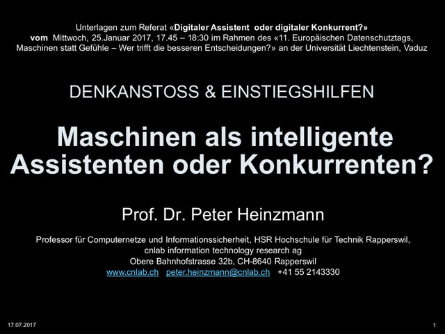 Dr. Peter Heinzmann Professor für Computernetze und Informationssicherheit, HSR Hochschule für Technik Rapperswil, cnlab information technology research ag Obere Bahnhofstrasse 32b, CH-8640 Rapperswil www.cnlab.ch [email protected] +41 55 2143330 Unterlagen zum Referat «Digitaler Assistent oder digitaler Konkurrent?» vom Mittwoch, 25.Januar 2017, 17.45 – 18:30 im Rahmen des «11. Europäischen Datenschutztags, Maschinen statt Gefühle – Wer trifft die besseren Entscheidungen?» an der Universität Liechtenstein, Vaduz 17.07.2017 1