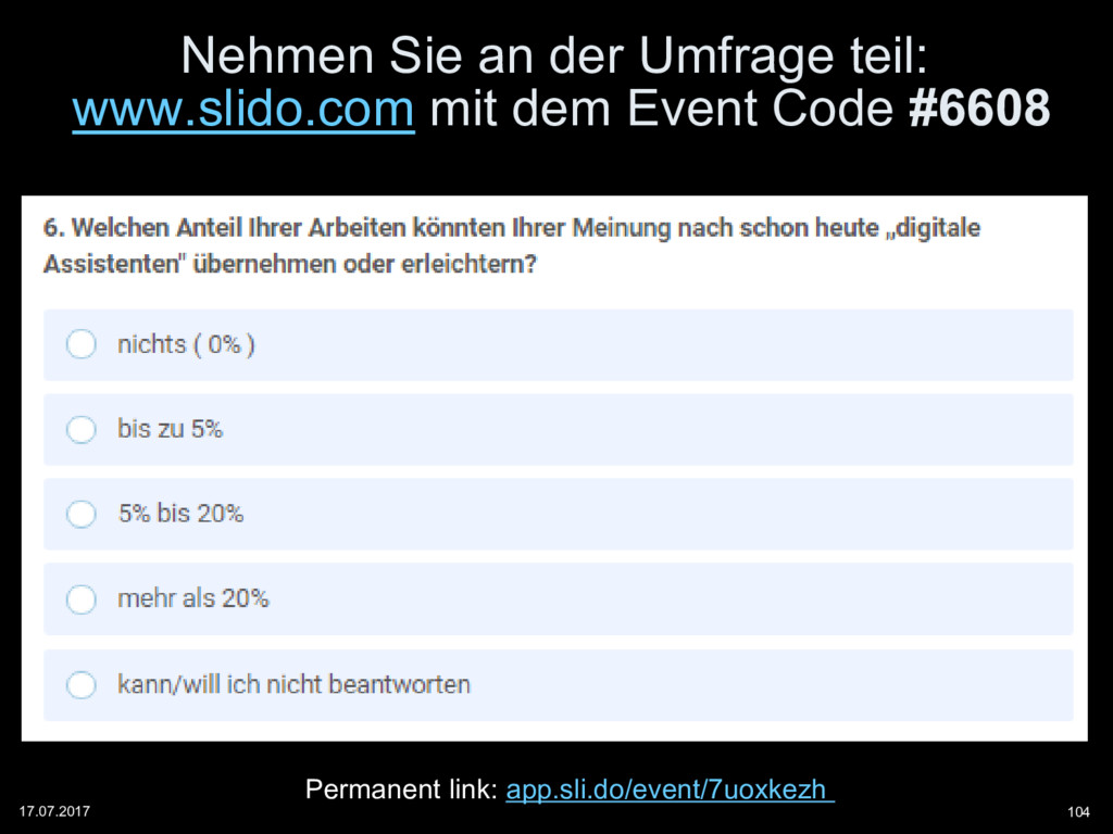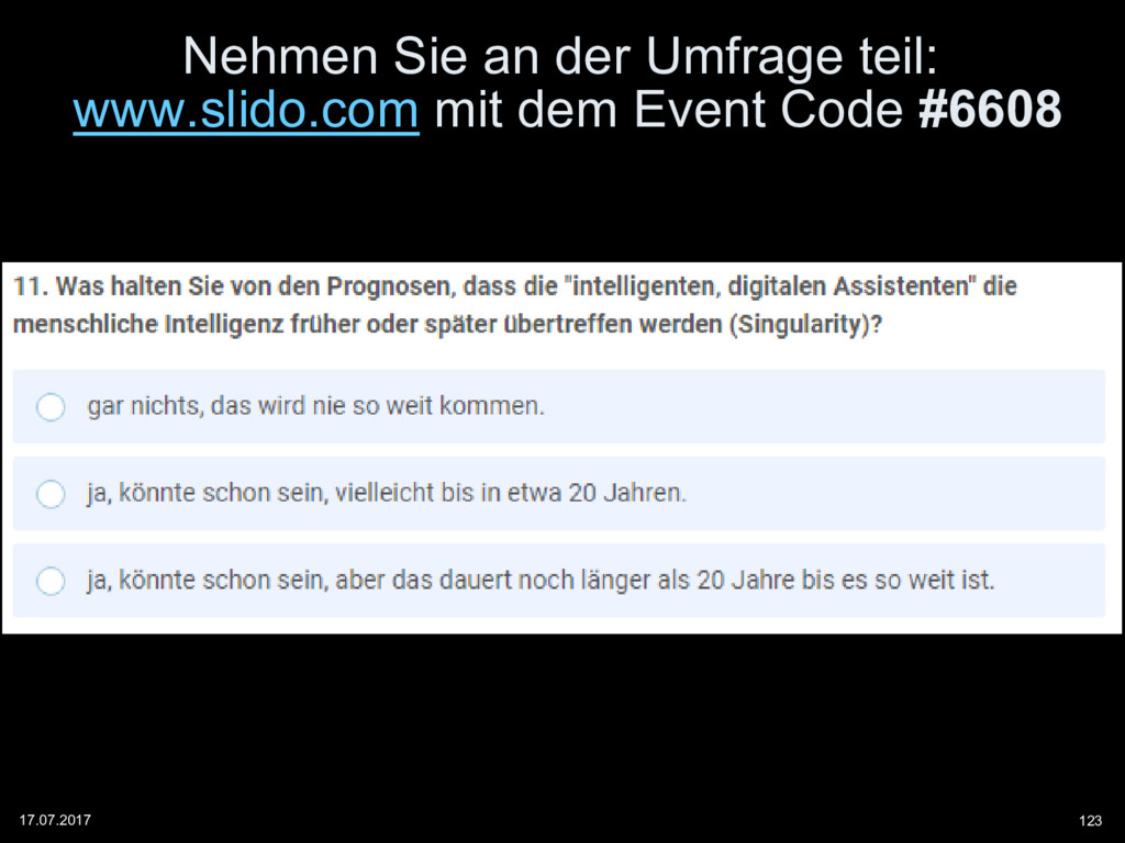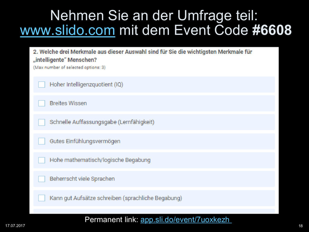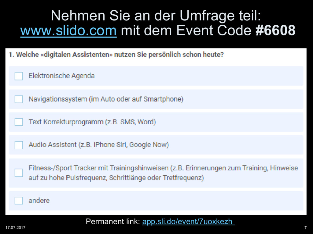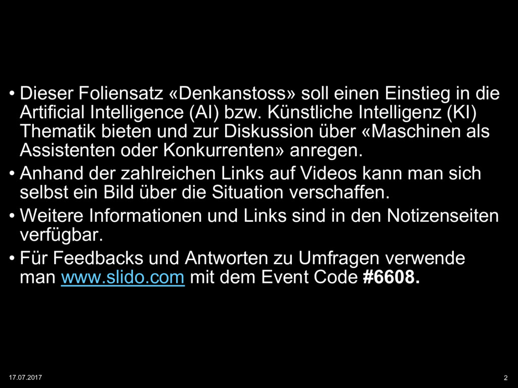 Intelligence (AI) bzw. Künstliche Intelligenz (KI) Thematik bieten und zur Diskussion über «Maschinen als Assistenten oder Konkurrenten» anregen. • Anhand der zahlreichen Links auf Videos kann man sich selbst ein Bild über die Situation verschaffen. • Weitere Informationen und Links sind in den Notizenseiten verfügbar. • Für Feedbacks und Antworten zu Umfragen verwende man www.slido.com mit dem Event Code #6608. 17.07.2017 2