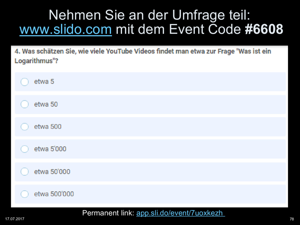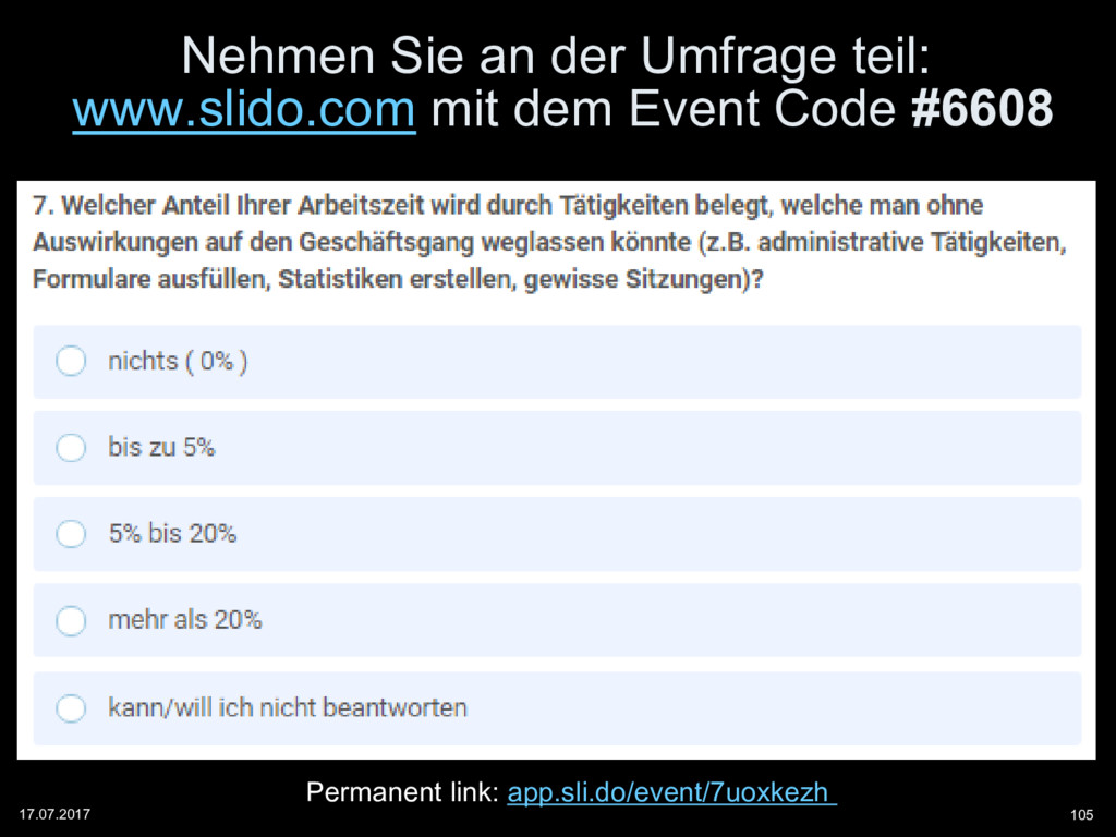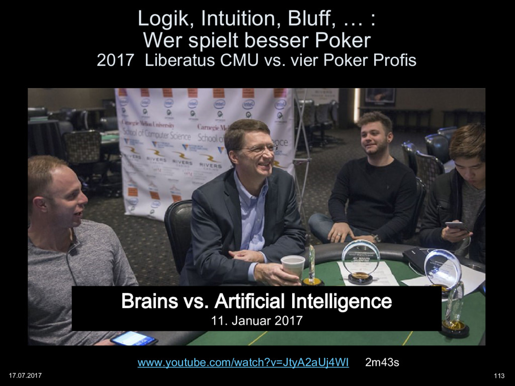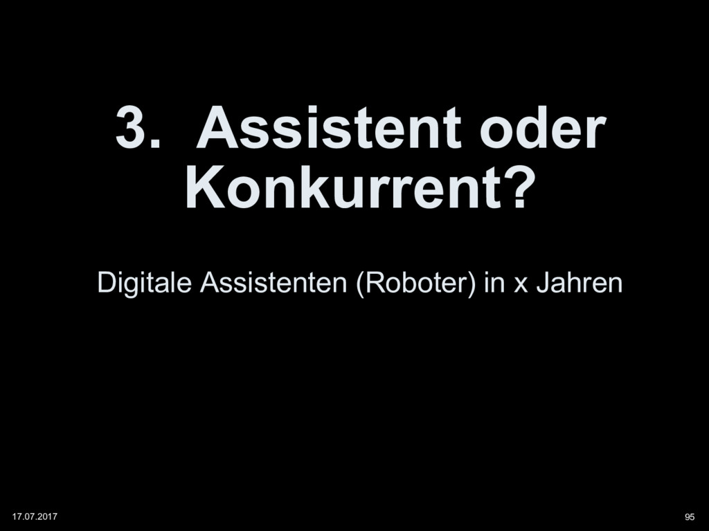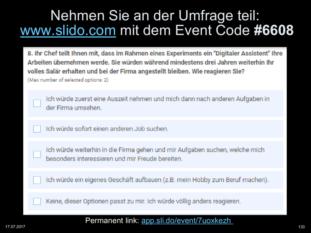 Intelligence (AI) bzw. Künstliche Intelligenz (KI) Thematik bieten und zur Diskussion über «Maschinen als Assistenten oder Konkurrenten» anregen. • Anhand der zahlreichen Links auf Videos kann man sich selbst ein Bild über die Situation verschaffen. • Weitere Informationen und Links sind in den Notizenseiten verfügbar. • Für Feedbacks und Antworten zu Umfragen verwende man www.slido.com mit dem Event Code #6608. 17.07.2017 2