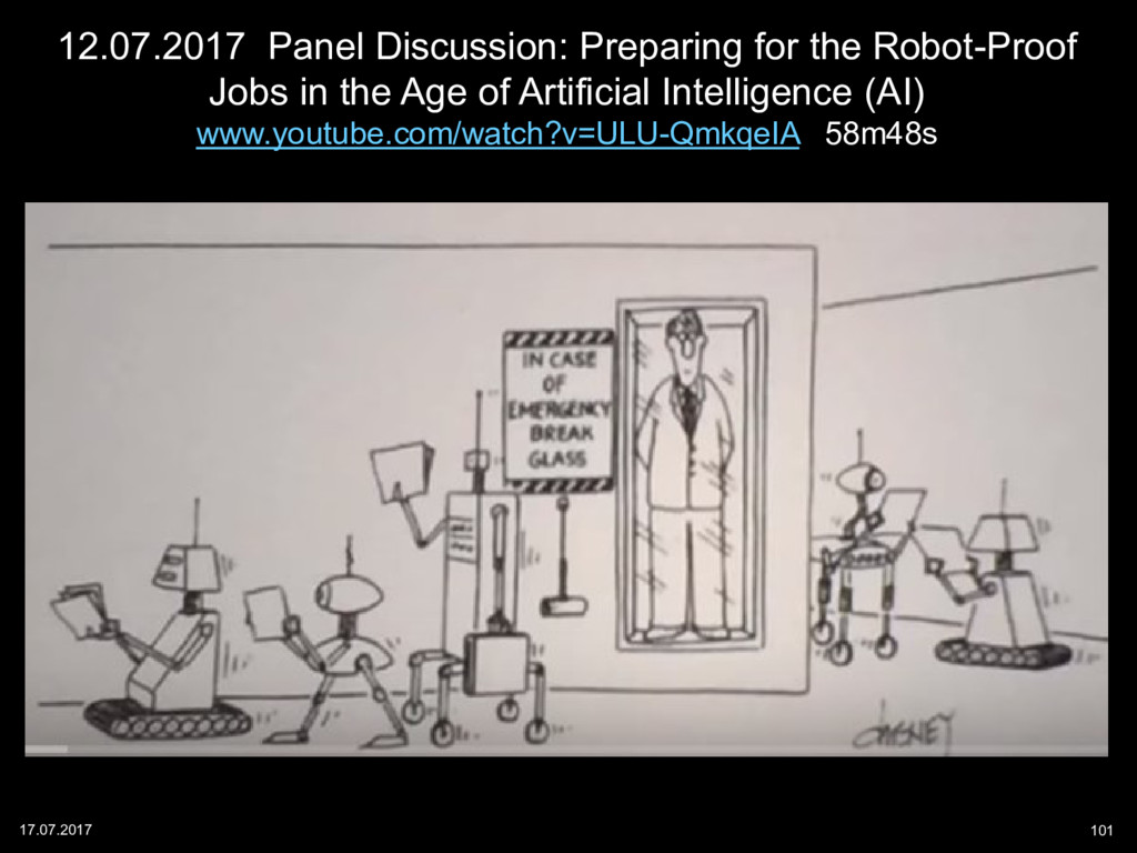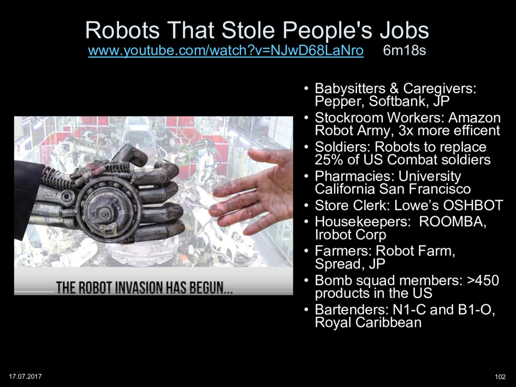 Caregivers: Pepper, Softbank, JP • Stockroom Workers: Amazon Robot Army, 3x more efficent • Soldiers: Robots to replace 25% of US Combat soldiers • Pharmacies: University California San Francisco • Store Clerk: Lowe’s OSHBOT • Housekeepers: ROOMBA, Irobot Corp • Farmers: Robot Farm, Spread, JP • Bomb squad members: >450 products in the US • Bartenders: N1-C and B1-O, Royal Caribbean 17.07.2017 102