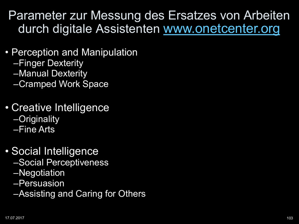 www.onetcenter.org • Perception and Manipulation –Finger Dexterity –Manual Dexterity –Cramped Work Space • Creative Intelligence –Originality –Fine Arts • Social Intelligence –Social Perceptiveness –Negotiation –Persuasion –Assisting and Caring for Others 17.07.2017 103