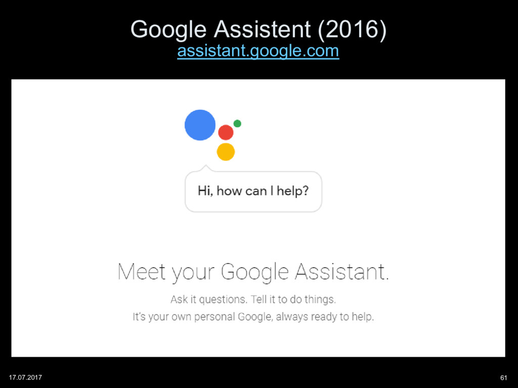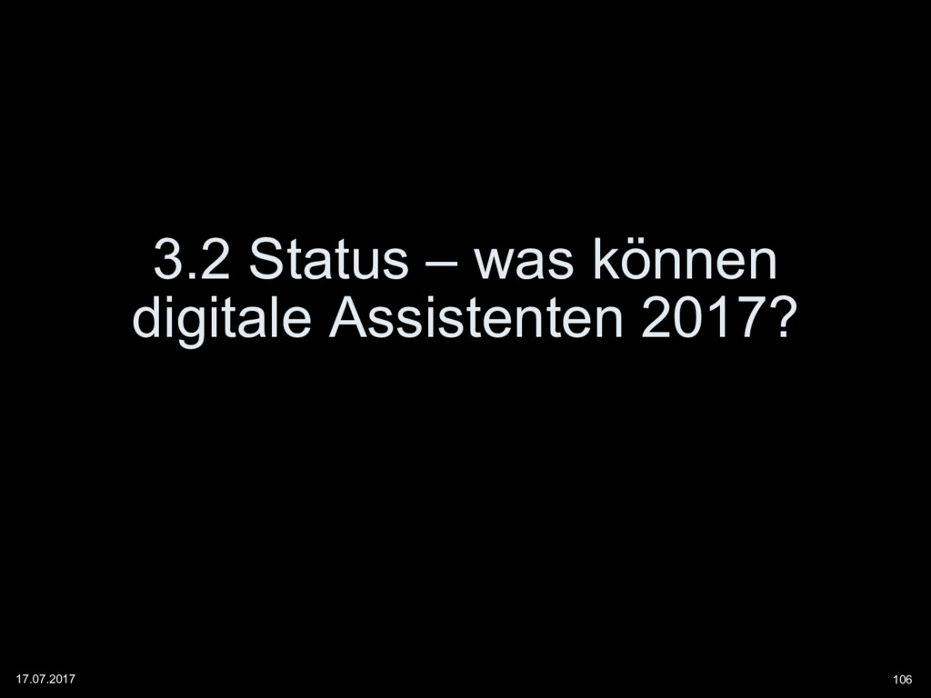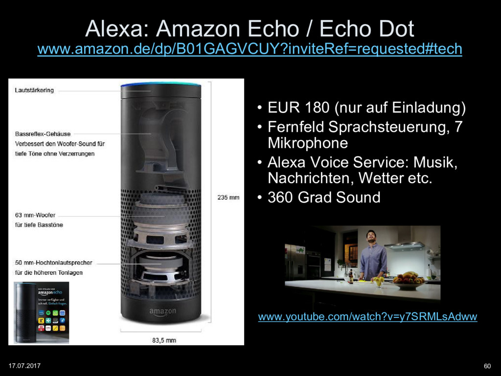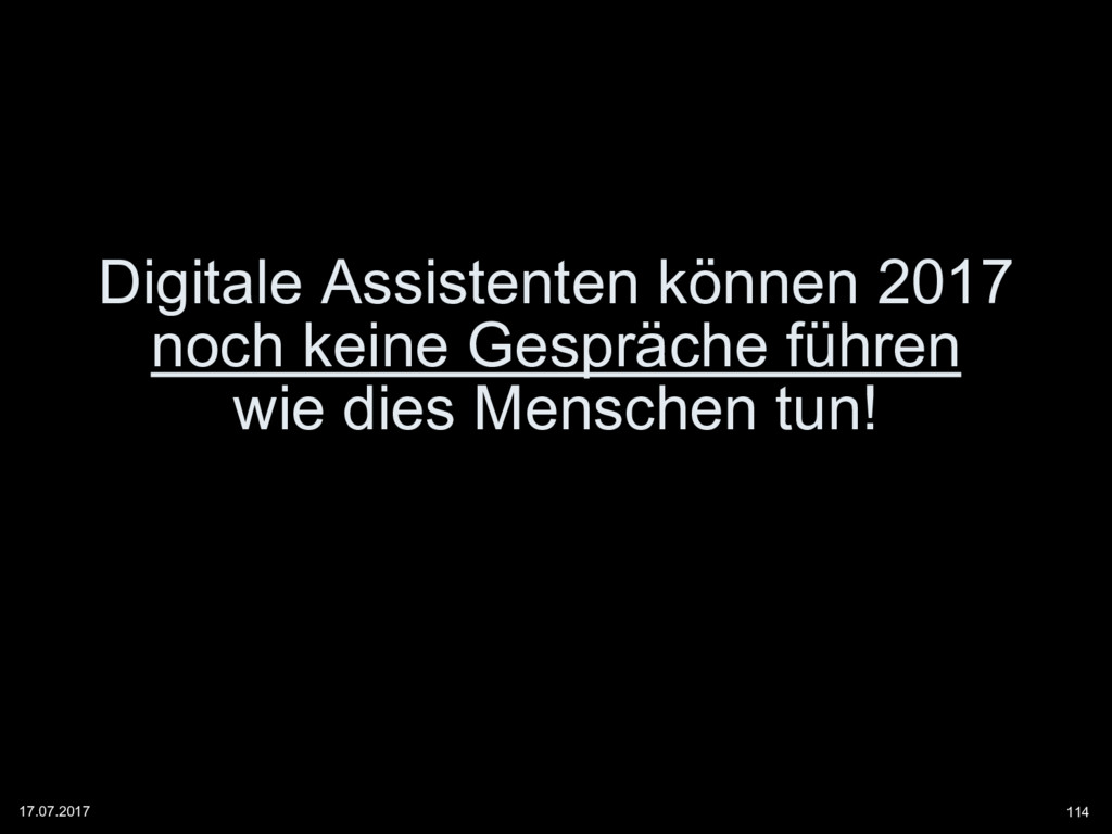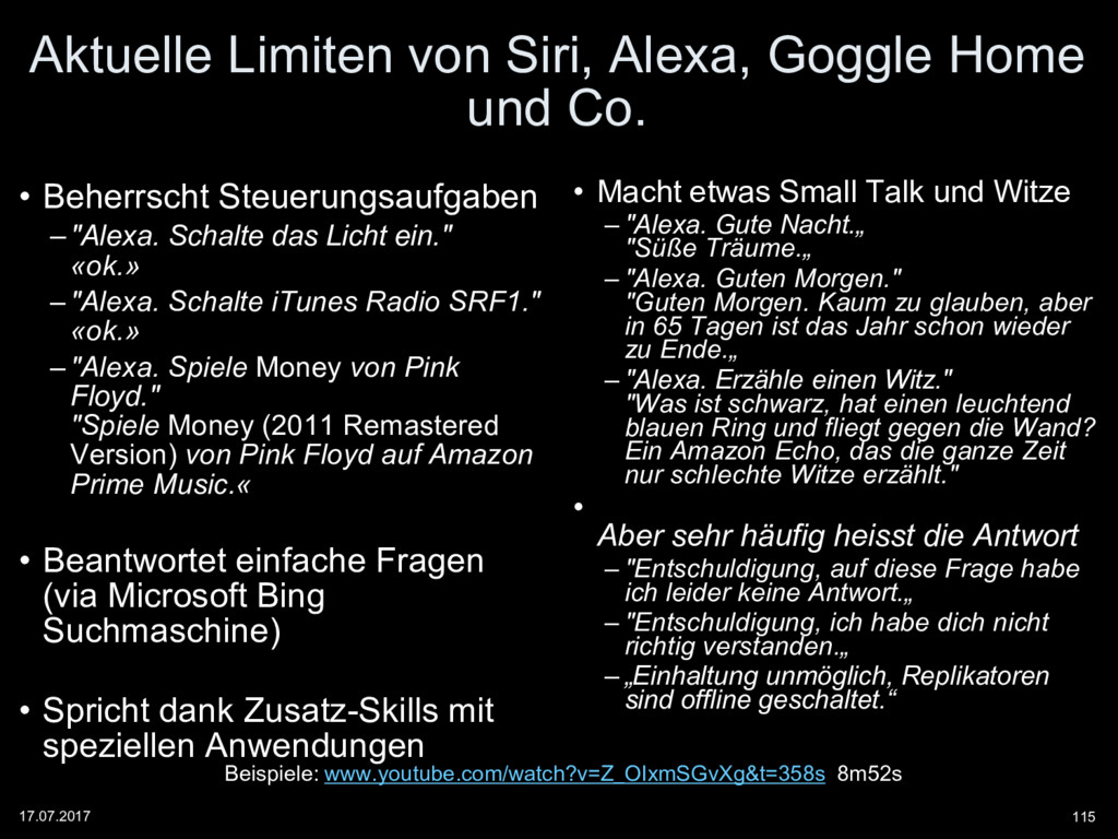 Beherrscht Steuerungsaufgaben –"Alexa. Schalte das Licht ein." «ok.» –"Alexa. Schalte iTunes Radio SRF1." «ok.» –"Alexa. Spiele Money von Pink Floyd." "Spiele Money (2011 Remastered Version) von Pink Floyd auf Amazon Prime Music.« • Beantwortet einfache Fragen (via Microsoft Bing Suchmaschine) • Spricht dank Zusatz-Skills mit speziellen Anwendungen • Macht etwas Small Talk und Witze – "Alexa. Gute Nacht.„ "Süße Träume.„ – "Alexa. Guten Morgen." "Guten Morgen. Kaum zu glauben, aber in 65 Tagen ist das Jahr schon wieder zu Ende.„ – "Alexa. Erzähle einen Witz." "Was ist schwarz, hat einen leuchtend blauen Ring und fliegt gegen die Wand? Ein Amazon Echo, das die ganze Zeit nur schlechte Witze erzählt." • Aber sehr häufig heisst die Antwort – "Entschuldigung, auf diese Frage habe ich leider keine Antwort.„ – "Entschuldigung, ich habe dich nicht richtig verstanden.„ – „Einhaltung unmöglich, Replikatoren sind offline geschaltet.“ 17.07.2017 115 Beispiele: www.youtube.com/watch?v=Z_OIxmSGvXg&t=358s 8m52s