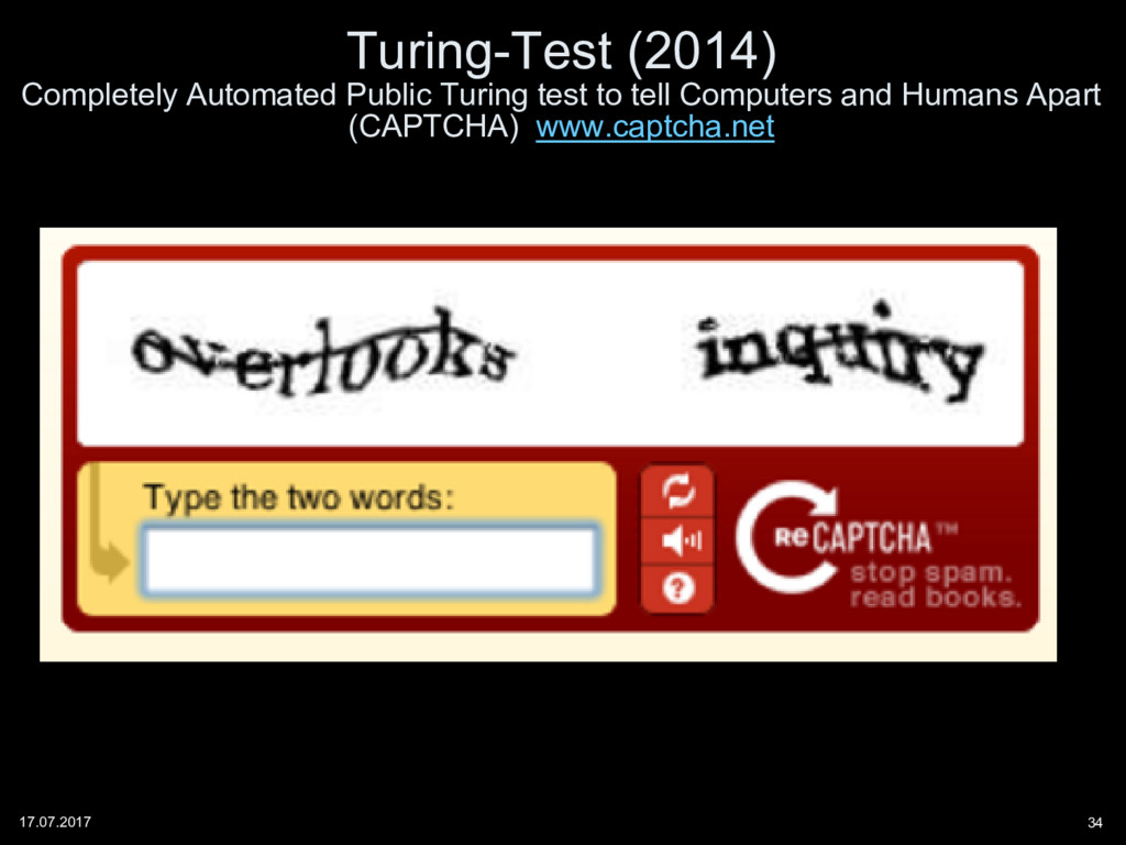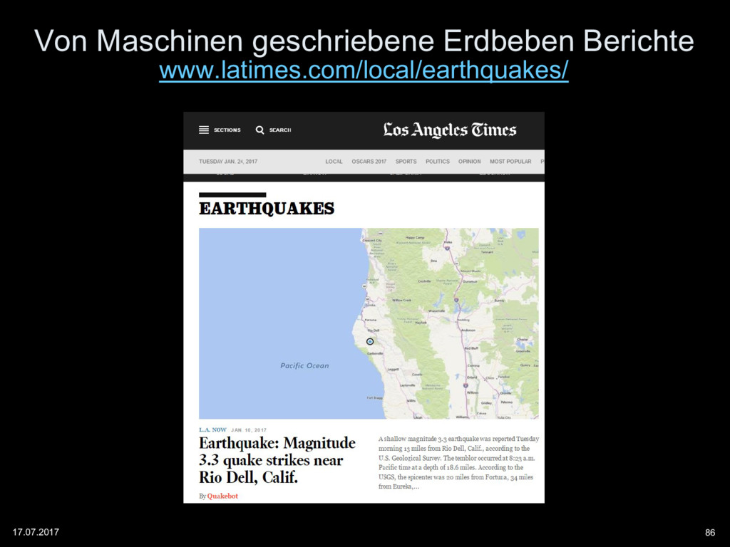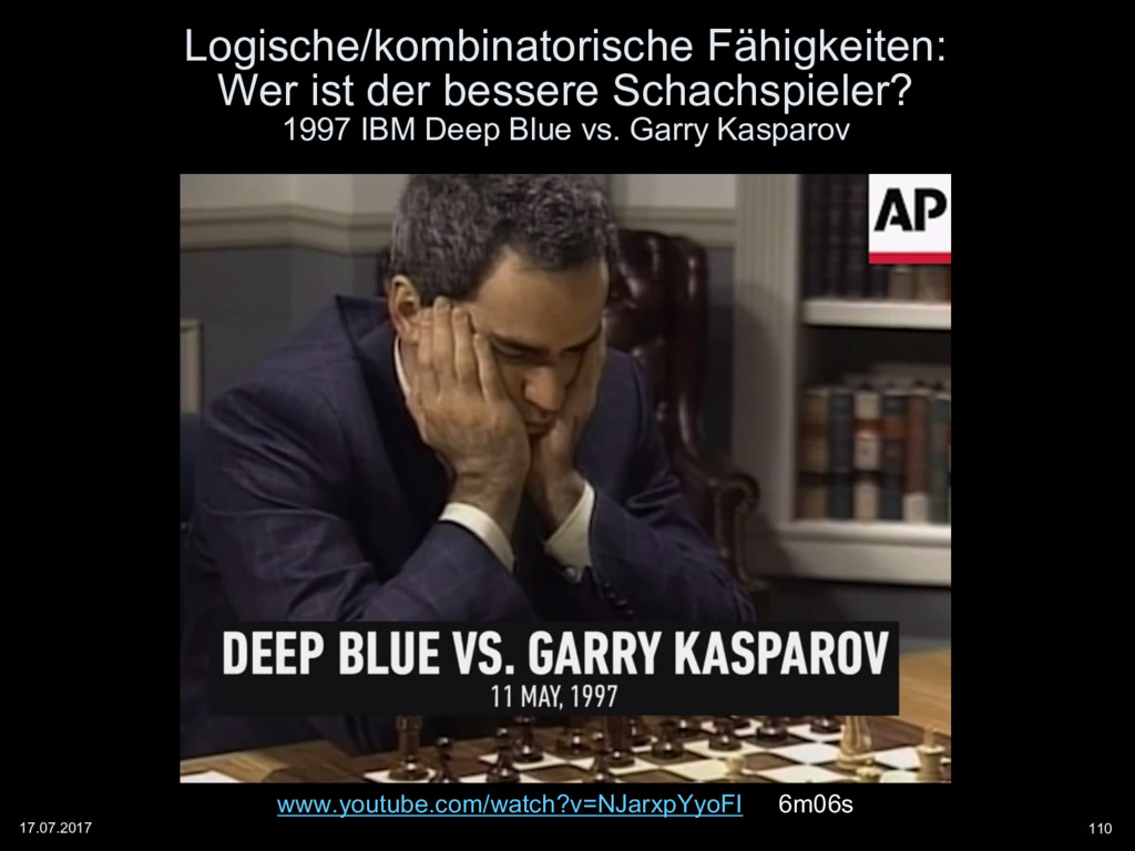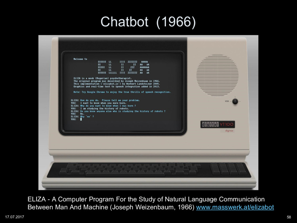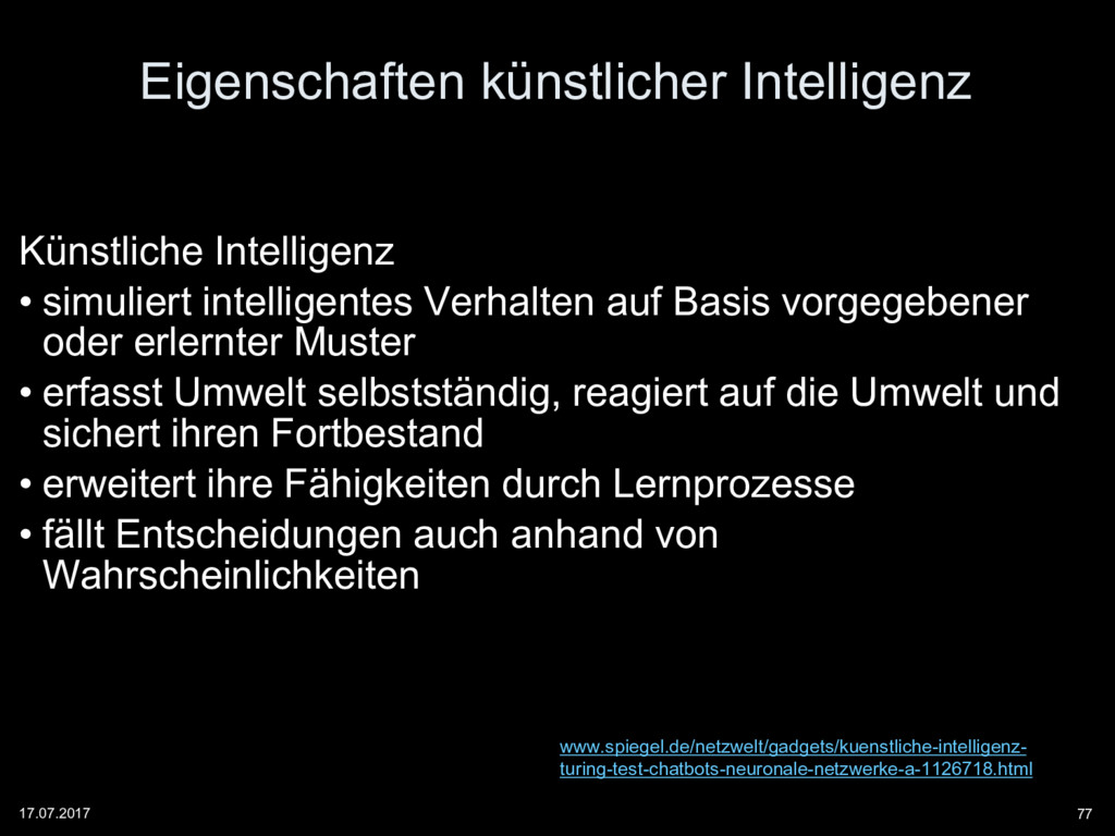 Basis vorgegebener oder erlernter Muster • erfasst Umwelt selbstständig, reagiert auf die Umwelt und sichert ihren Fortbestand • erweitert ihre Fähigkeiten durch Lernprozesse • fällt Entscheidungen auch anhand von Wahrscheinlichkeiten 17.07.2017 77 www.spiegel.de/netzwelt/gadgets/kuenstliche-intelligenz- turing-test-chatbots-neuronale-netzwerke-a-1126718.html