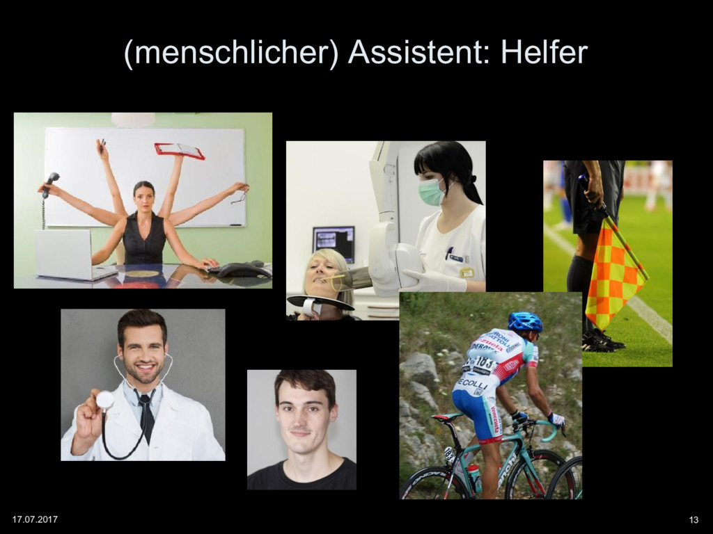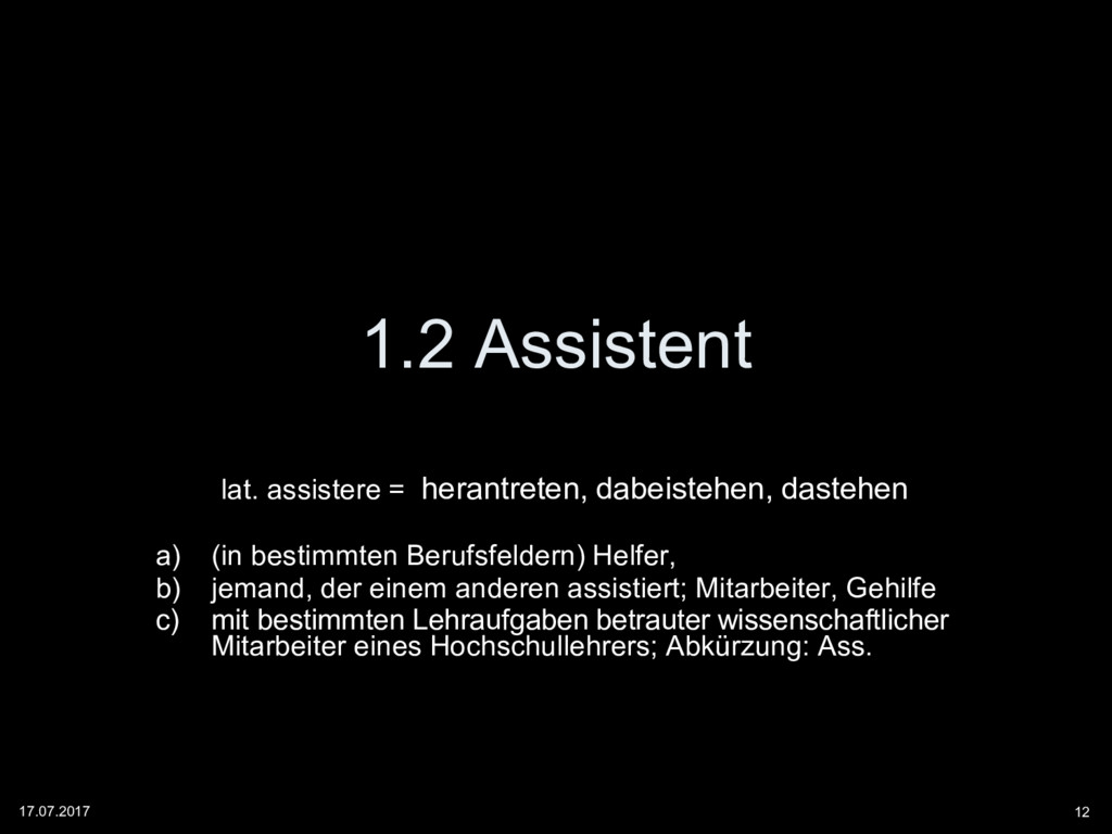 bestimmten Berufsfeldern) Helfer, b) jemand, der einem anderen assistiert; Mitarbeiter, Gehilfe c) mit bestimmten Lehraufgaben betrauter wissenschaftlicher Mitarbeiter eines Hochschullehrers; Abkürzung: Ass. 17.07.2017 12