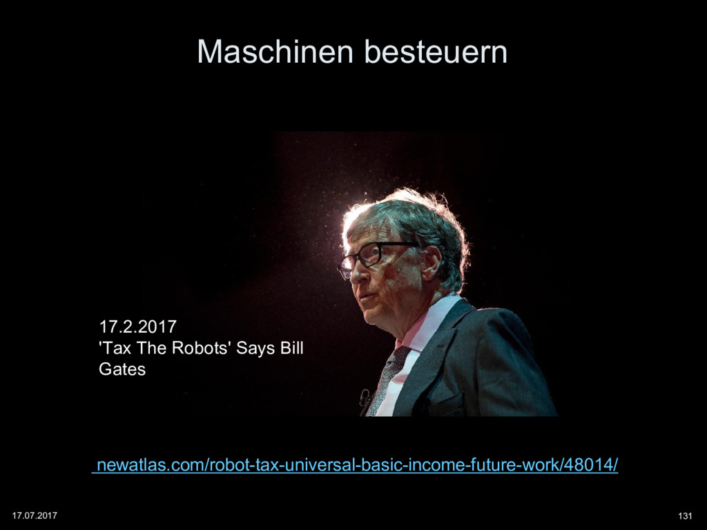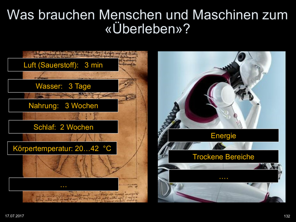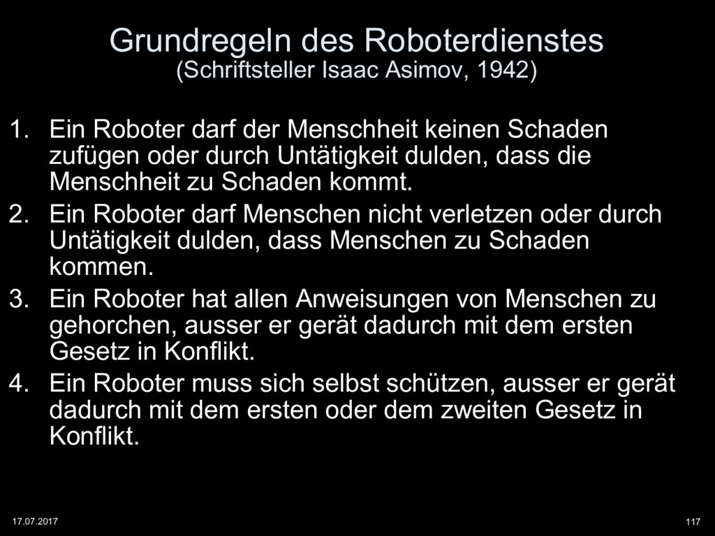 darf der Menschheit keinen Schaden zufügen oder durch Untätigkeit dulden, dass die Menschheit zu Schaden kommt. 2. Ein Roboter darf Menschen nicht verletzen oder durch Untätigkeit dulden, dass Menschen zu Schaden kommen. 3. Ein Roboter hat allen Anweisungen von Menschen zu gehorchen, ausser er gerät dadurch mit dem ersten Gesetz in Konflikt. 4. Ein Roboter muss sich selbst schützen, ausser er gerät dadurch mit dem ersten oder dem zweiten Gesetz in Konflikt. 17.07.2017 117
