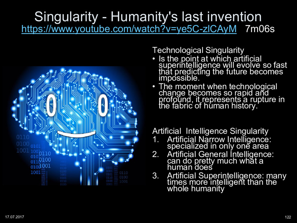 Is the point at which artificial superintelligence will evolve so fast that predicting the future becomes impossible. • The moment when technological change becomes so rapid and profound, it represents a rupture in the fabric of human history. Artificial Intelligence Singularity 1. Artificial Narrow Intelligence: specialized in only one area 2. Artificial General Intelligence: can do pretty much what a human does 3. Artificial Superintelligence: many times more intelligent than the whole humanity 17.07.2017 122
