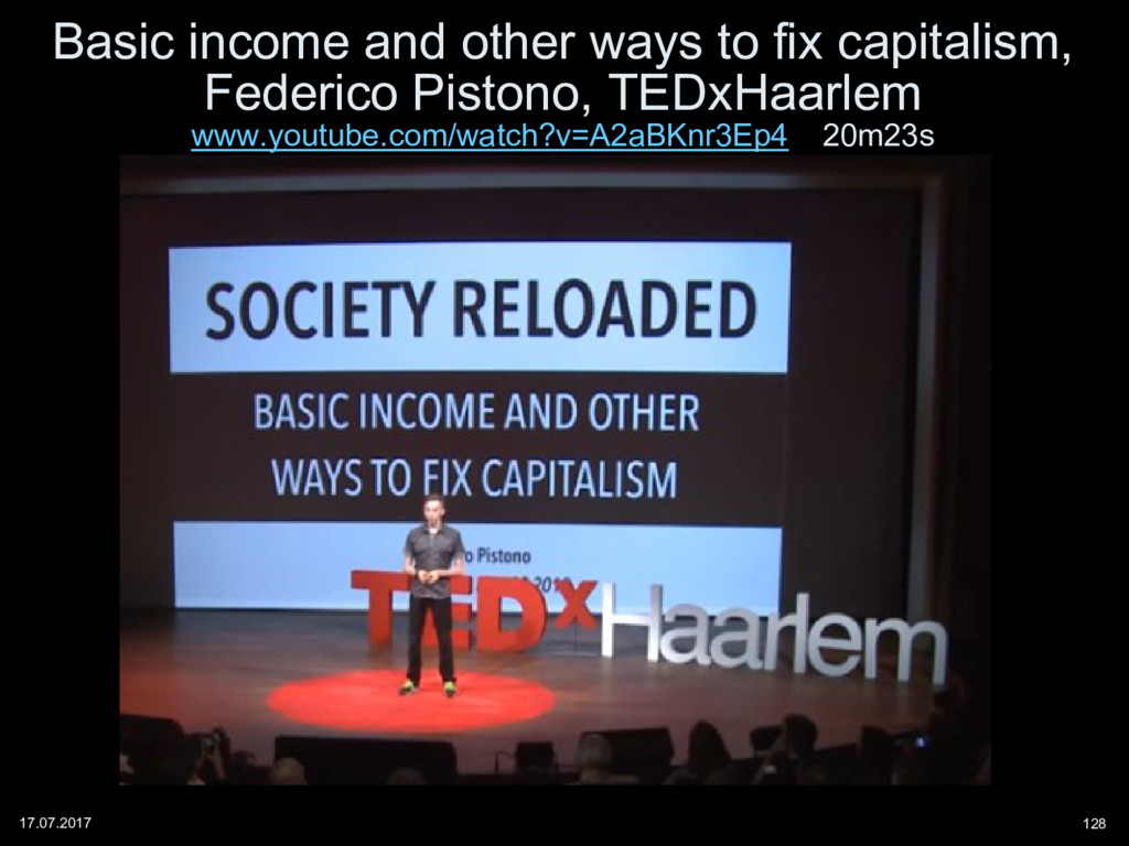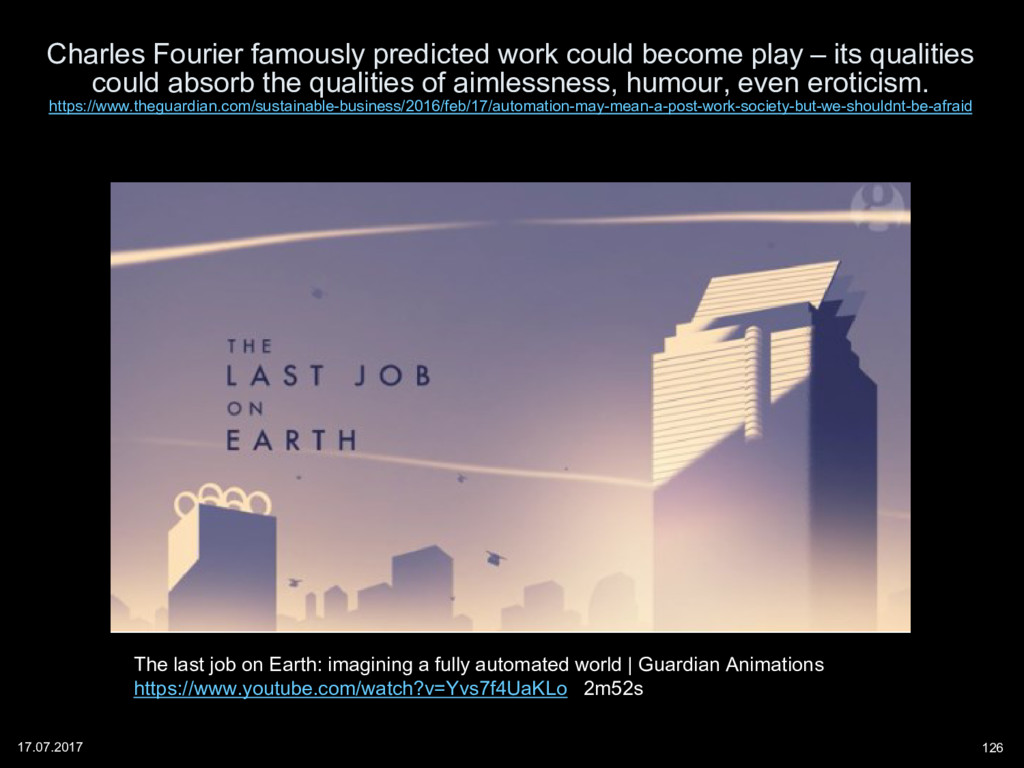 qualities could absorb the qualities of aimlessness, humour, even eroticism. https://www.theguardian.com/sustainable-business/2016/feb/17/automation-may-mean-a-post-work-society-but-we-shouldnt-be-afraid 17.07.2017 126 The last job on Earth: imagining a fully automated world | Guardian Animations https://www.youtube.com/watch?v=Yvs7f4UaKLo 2m52s