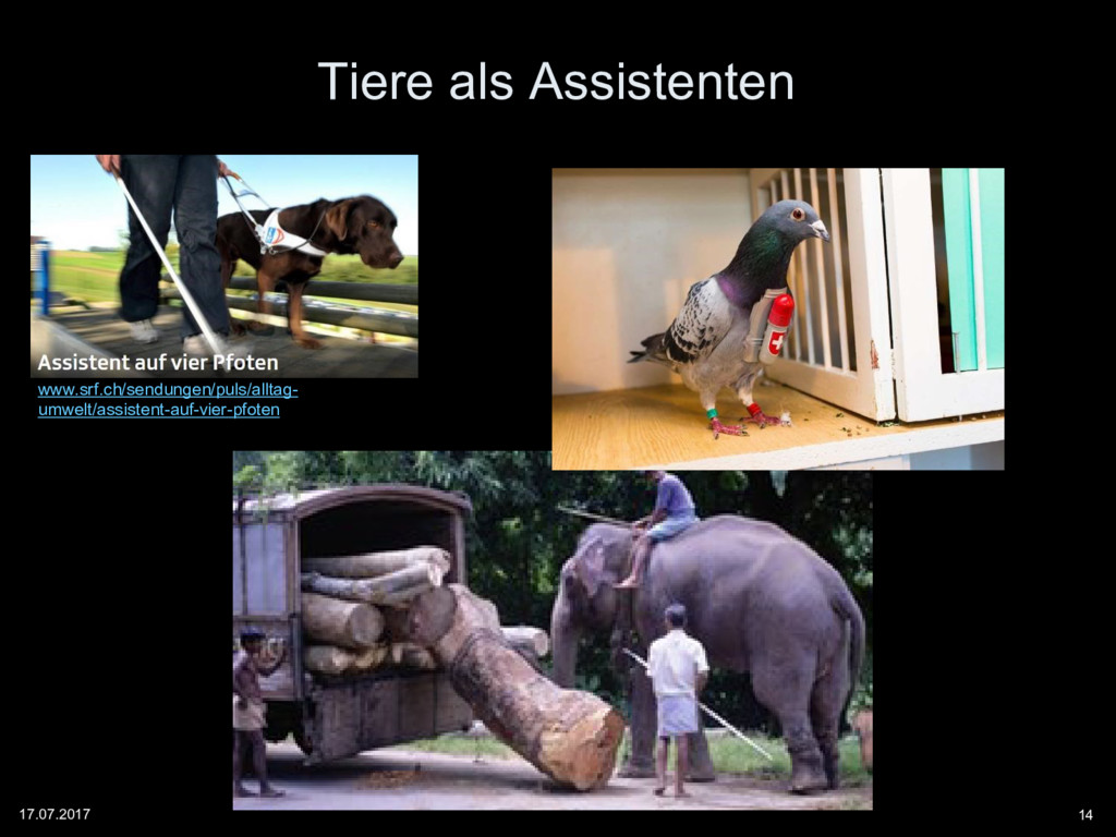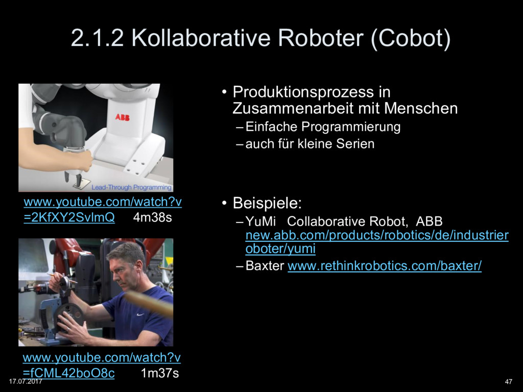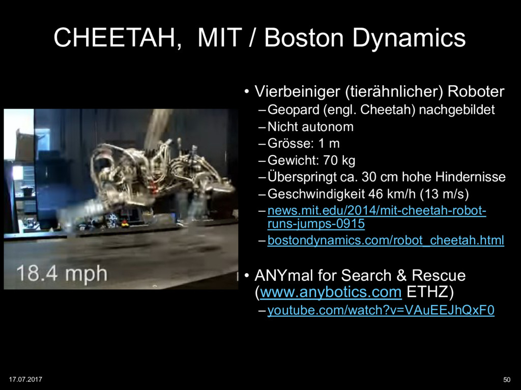 (engl. Cheetah) nachgebildet –Nicht autonom –Grösse: 1 m –Gewicht: 70 kg –Überspringt ca. 30 cm hohe Hindernisse –Geschwindigkeit 46 km/h (13 m/s) – news.mit.edu/2014/mit-cheetah-robot- runs-jumps-0915 – bostondynamics.com/robot_cheetah.html • ANYmal for Search & Rescue (www.anybotics.com ETHZ) –youtube.com/watch?v=VAuEEJhQxF0 17.07.2017 50